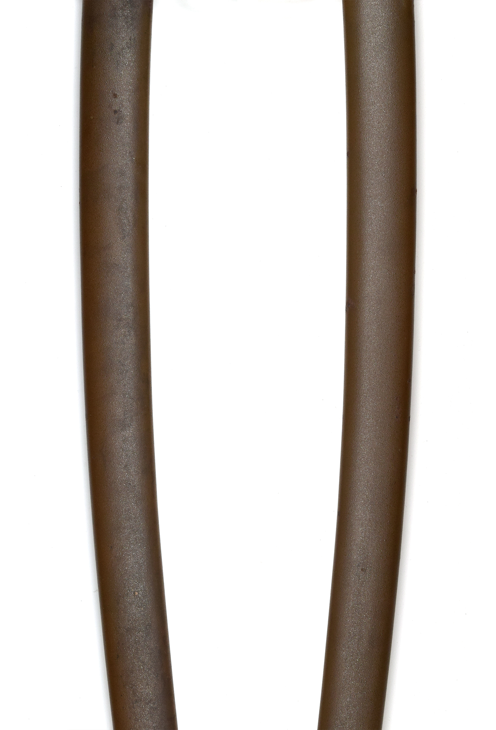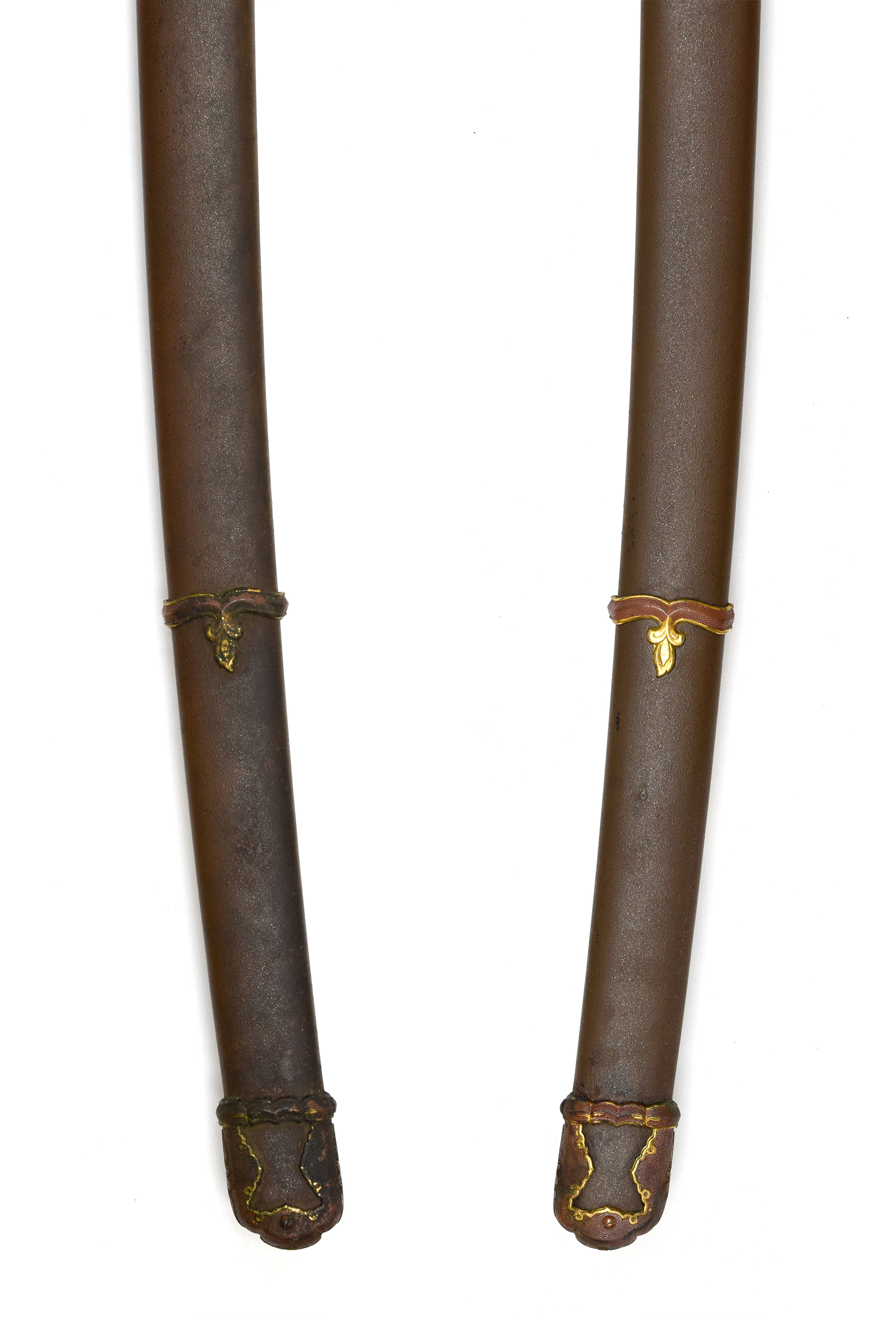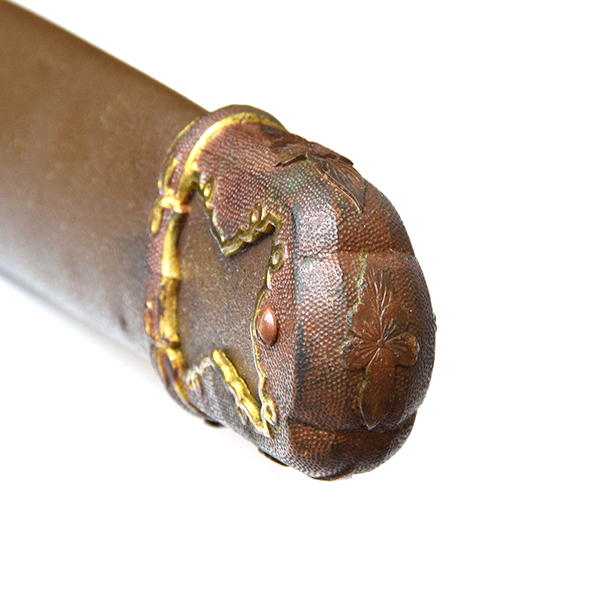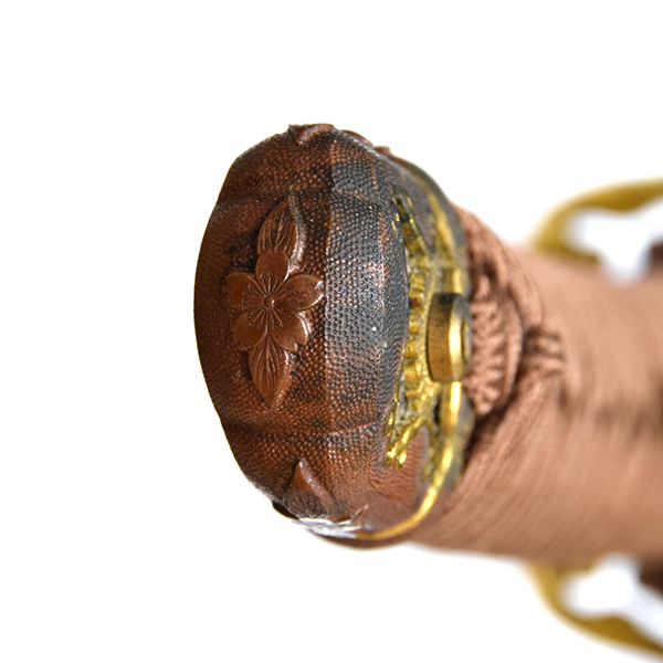 附属する陸軍刀拵は、第二佩鐶を逸失した元九四式拵で、目貫には端正な桔梗紋があしらわれています。拵の表裏で色調が異なる点も特筆すべき特徴で、これは戦後GHQによる刀狩りの折、「家伝の刀を決して渡すまい」との一念から、旧所有者が囲炉裏の上に長年秘匿していたことに起因します。その痕跡は、単なる経年変化ではなく、激動の時代を生き抜いた証として、深い説得力をもって語りかけてきます。 刀身そのものが鎌倉後期の名作として長き歴史を有することは言うまでもなく、加えてGHQの刀狩りという近代史の転換点において、持ち主が身を挺して守り抜いたという実話が、この一振に比類なき歴史浪漫を与えています。日本刀が辿ってきた数百年の歩みと、人の想いが重なり合う逸品を、ぜひこの機会にお手元でご堪能ください。
