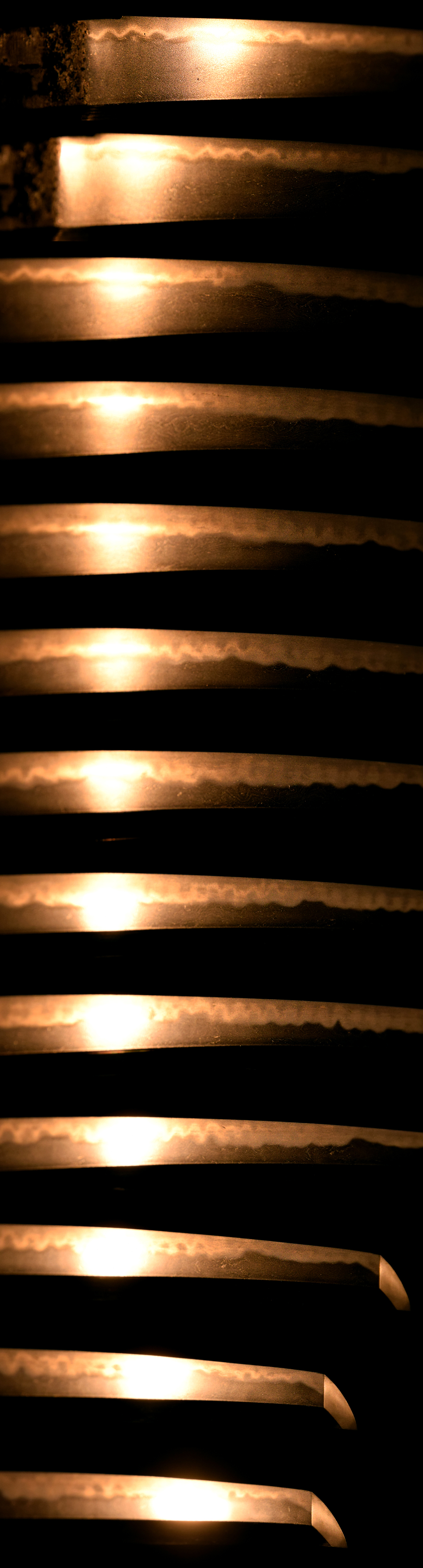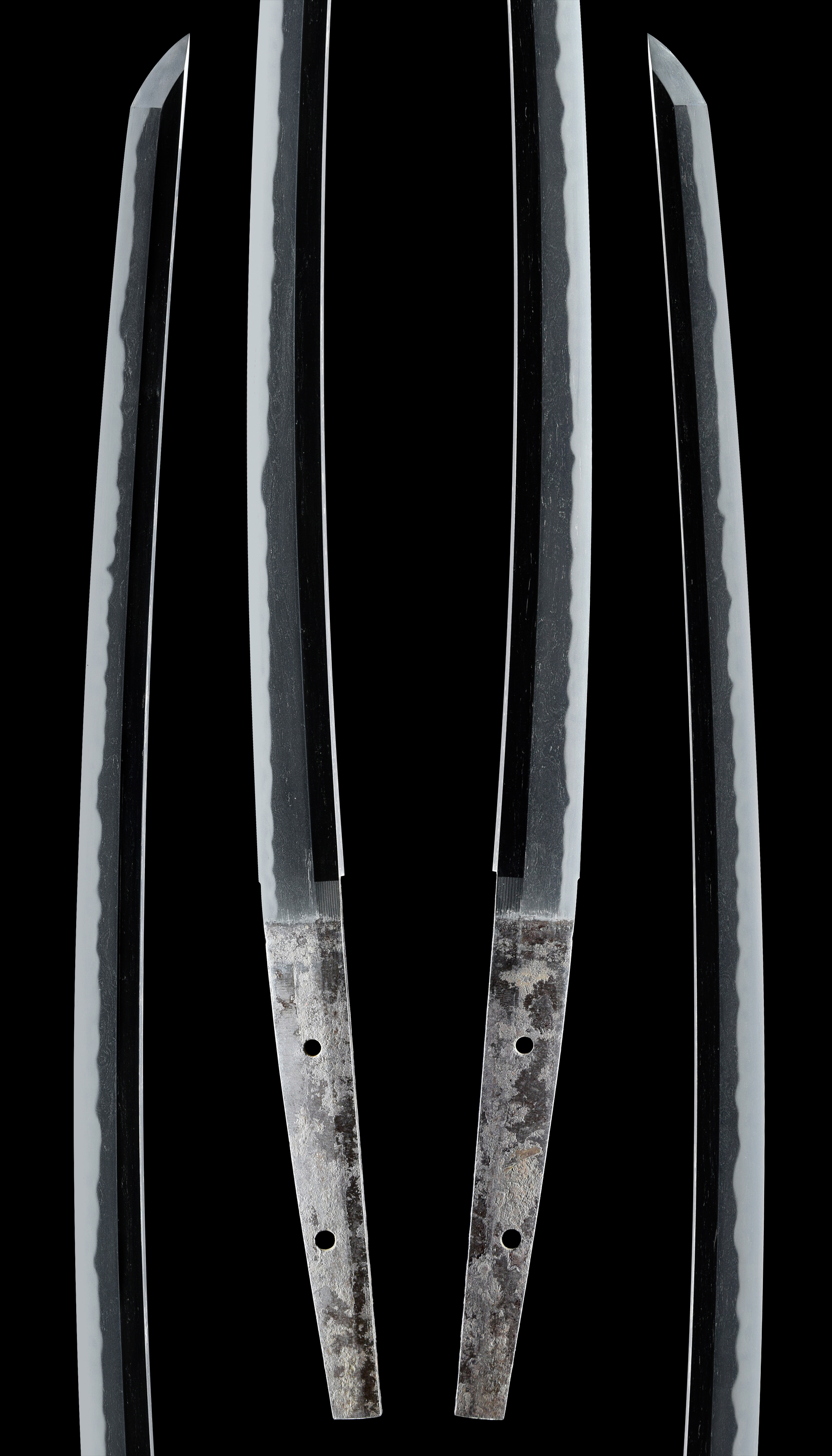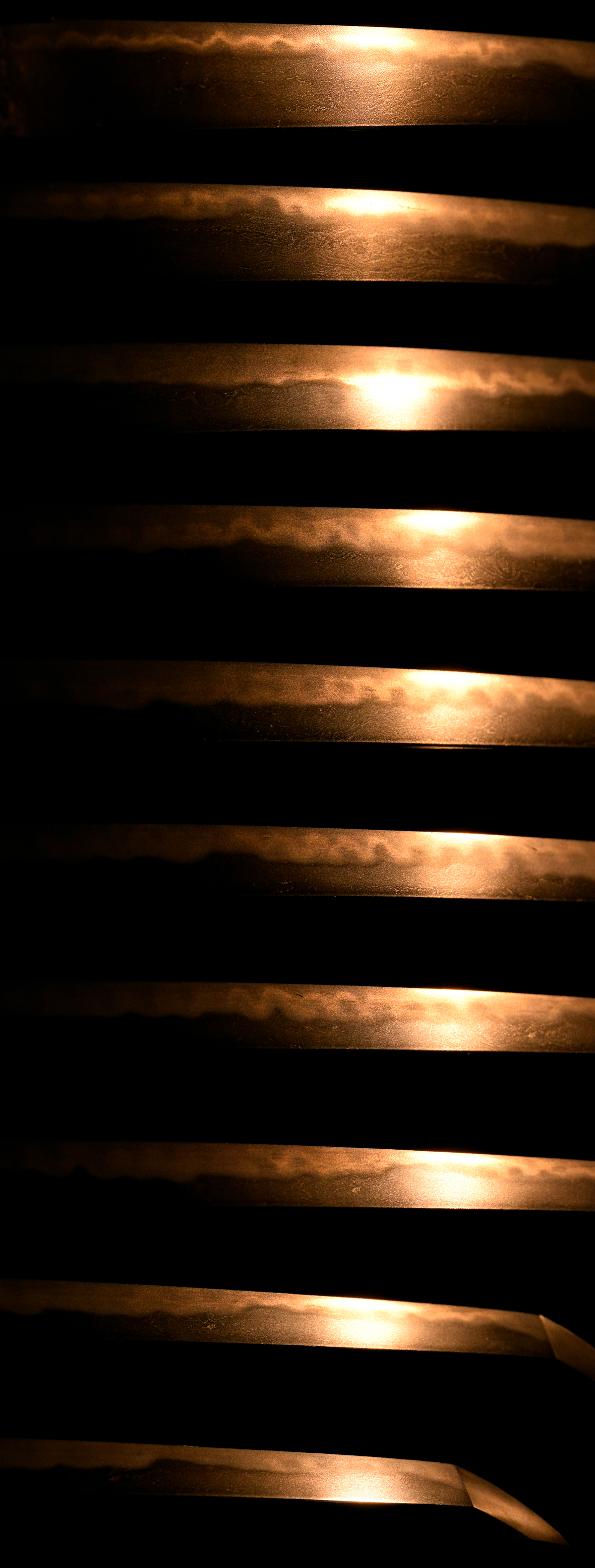 この刀は大きく磨り上げられるも今尚つ力踏ん張りがつき、小板目杢交じりの地鉄は流れ、地景入り、少しく肌立って淡く映り立ち、刃文は小沸本位の互ノ目乱れで、所々に蛙子丁字風の刃を交え、刃中の随所に砂流や金筋が看取出来、鋩子は直ぐに焼きたっぷりと丸く返るなど、古名作には必ずと言って良い程見受けられる繕いが無く、総じて健全であり、然るべき研磨を施せば近い将来重要刀剣指定を受けるものと思われます。
