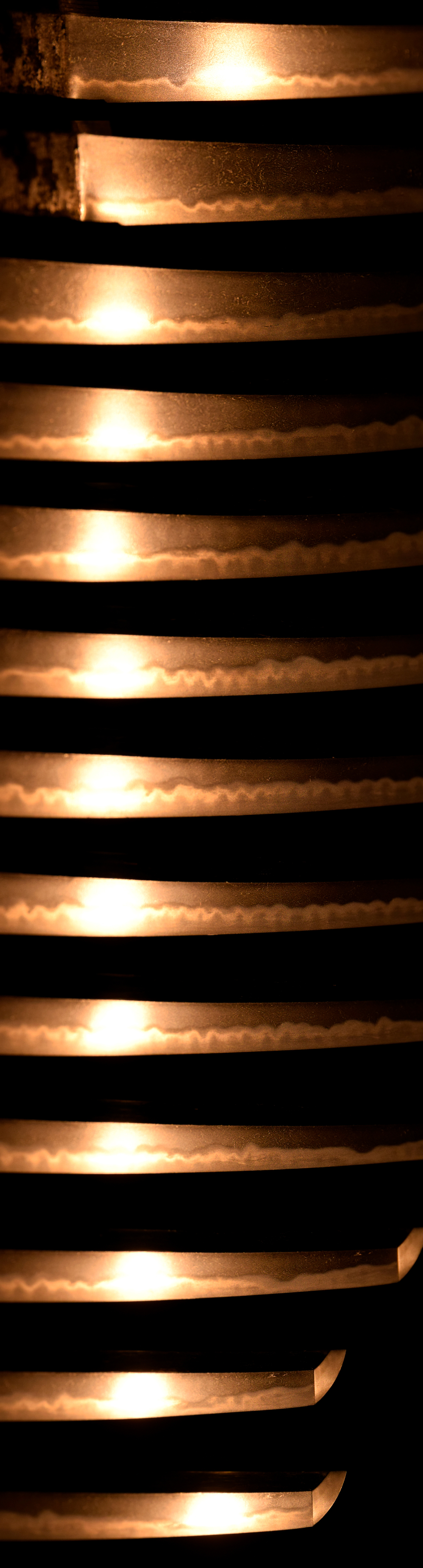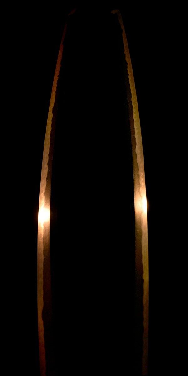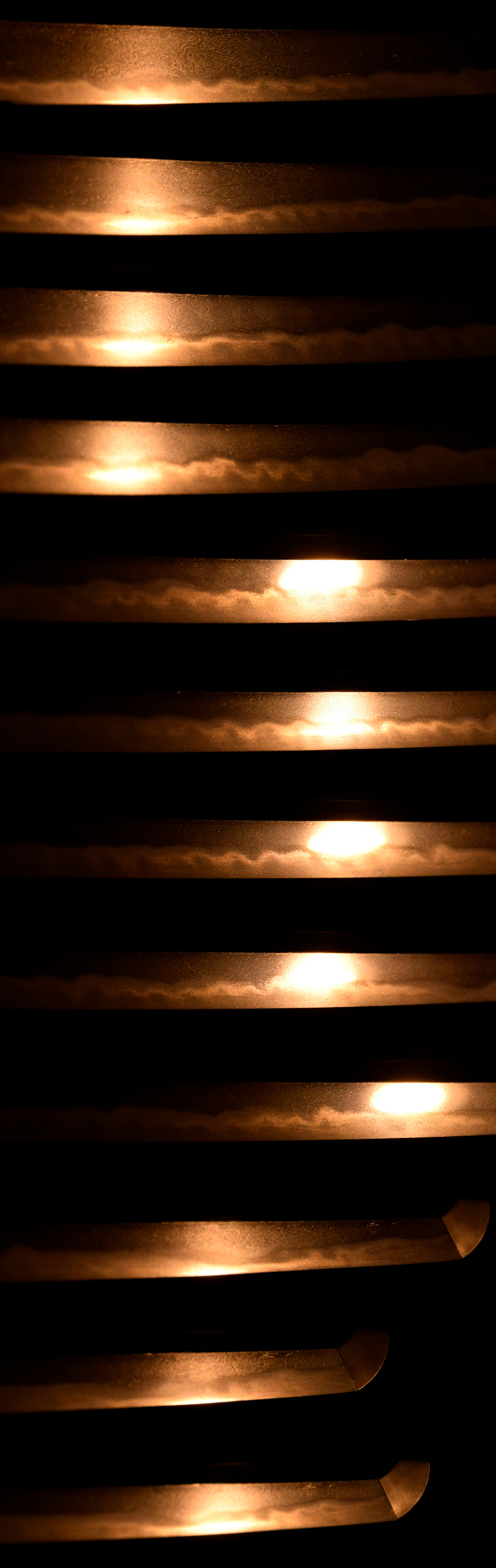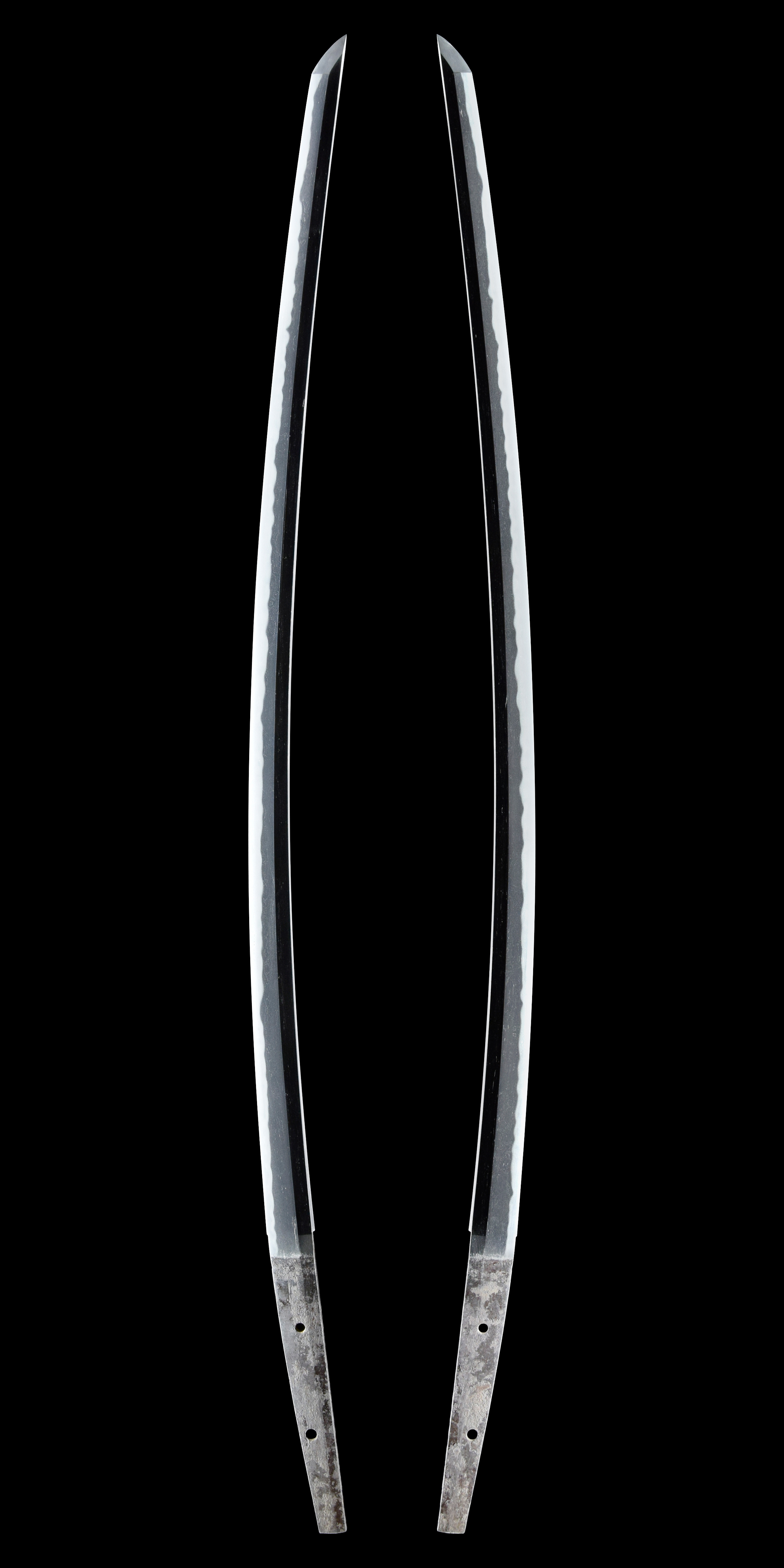 この刀は大きく磨り上げられるも今尚つ力踏ん張りがつき、小板目杢交じりの地鉄は流れ、地景入り、少しく肌立って淡く映り立ち、刃文は小沸本位の互ノ目乱れで、所々に蛙子丁字風の刃を交え、刃中の随所に砂流や金筋が看取出来、鋩子は直ぐに焼きたっぷりと丸く返るなど、古名作には必ずと言って良い程見受けられる繕いが無く、総じて健全であり、然るべき研磨を施せば近い将来重要刀剣指定を受けるものと思われます。