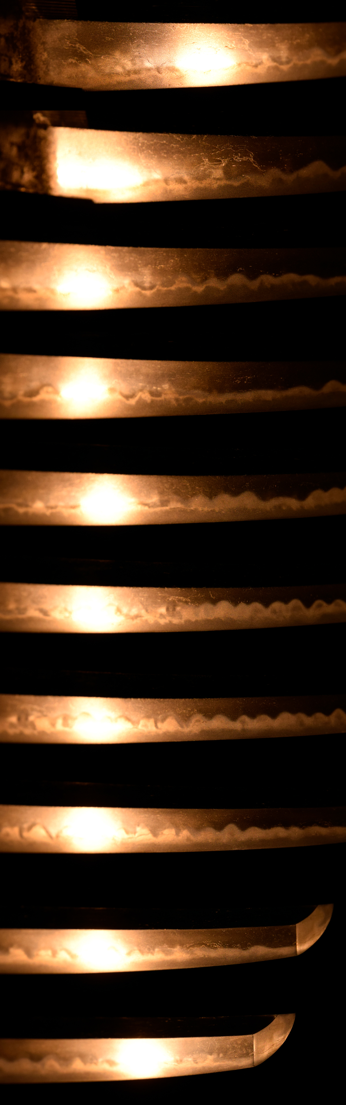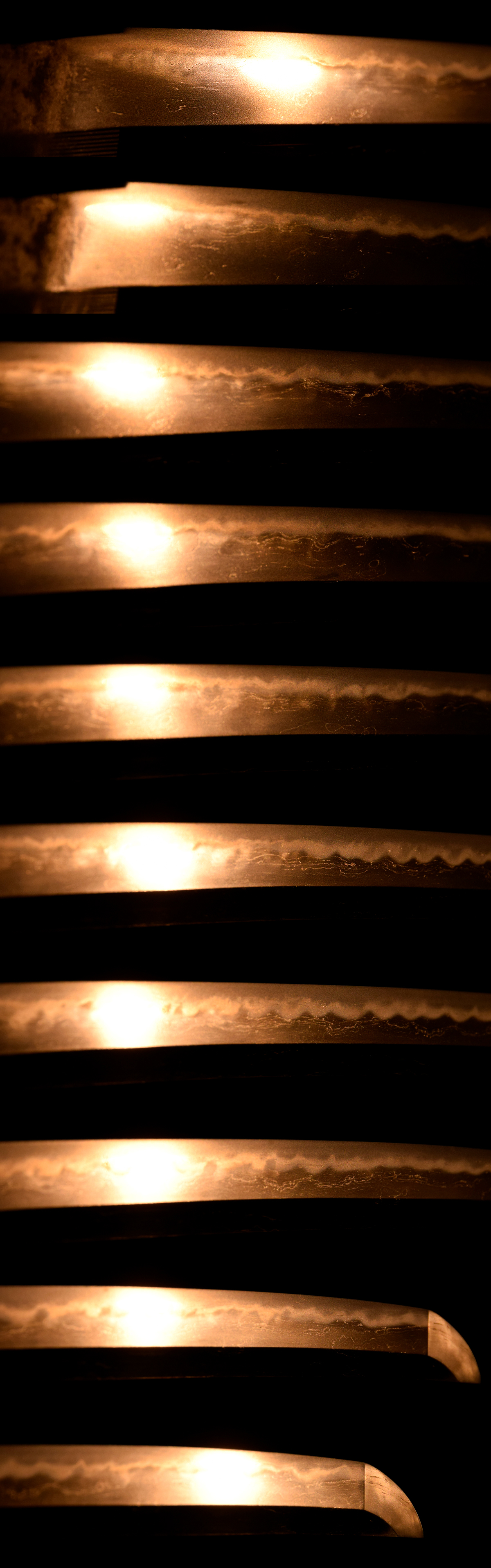末備前物と称される室町末期の刀工中、祐定銘の作刀は多く、中でも与三左衛門尉、源兵衛尉、彦兵衛尉が有名です。 刀剣の需要が多く求められた戦国期、備前刀は数多の戦に向けて数多く鍛えられ、そうした実用刀で俗名を銘切っていない末備前物を、数打と卑下する悪習が刀剣界にはありますが、粗製乱造されたわけではなく、俗名を銘切っていない作品の中にも、驚く程出来が良い作品が多々見受けられ、中には俗名個銘極めまで可能な出来優れた作も見られます。
