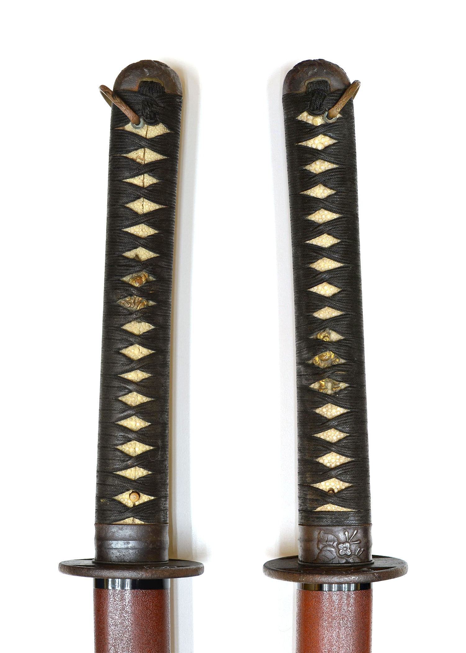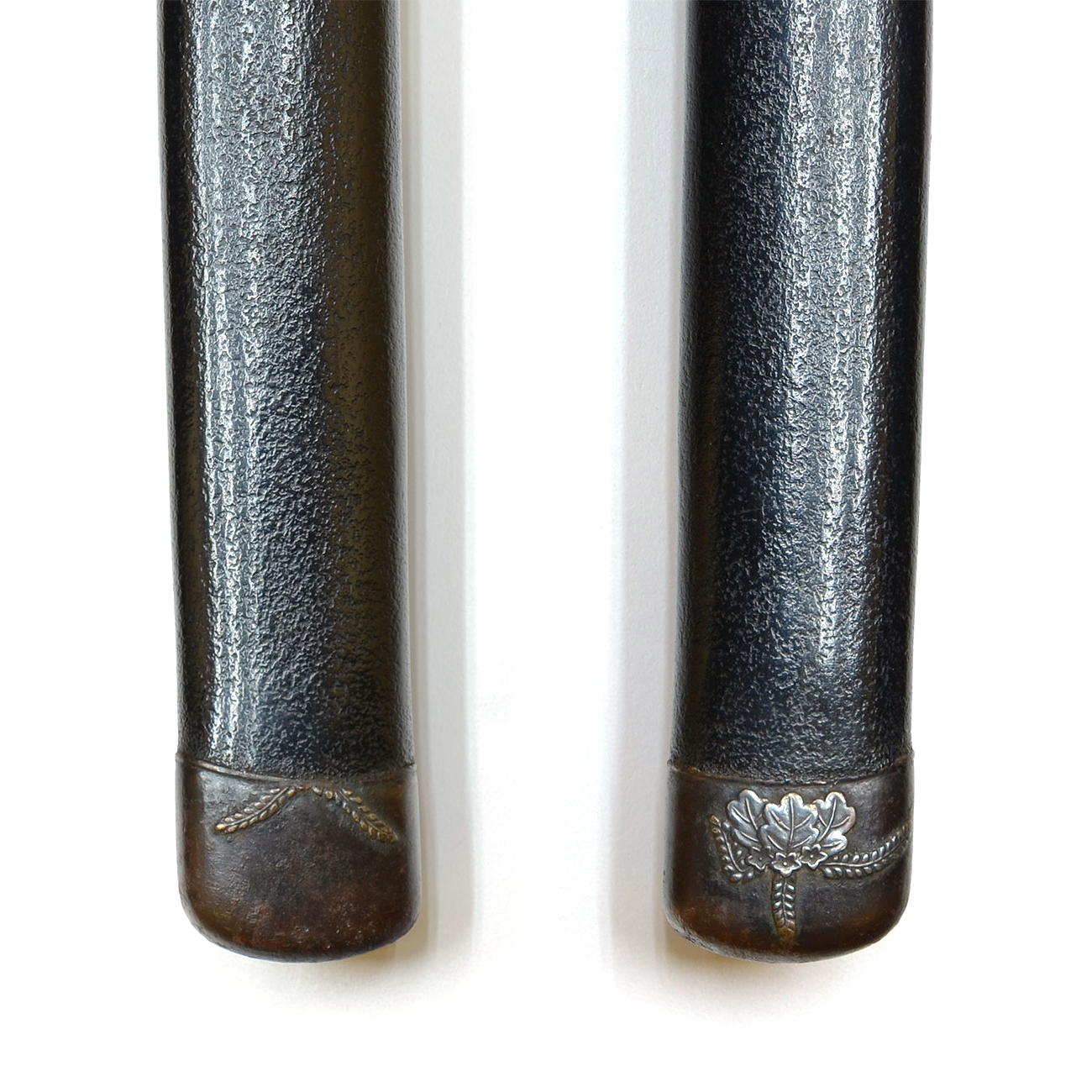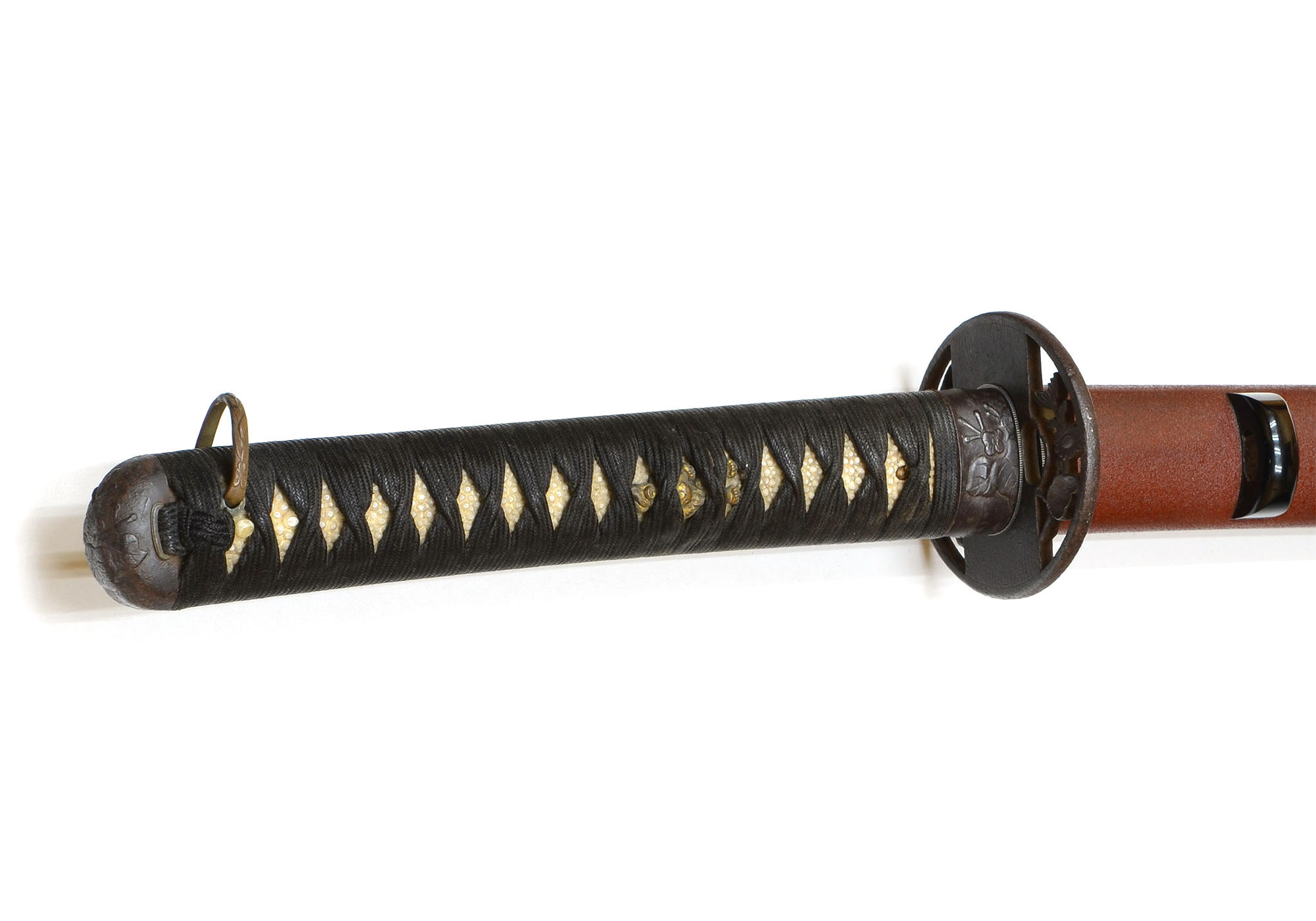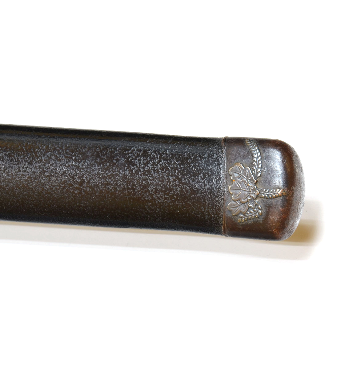 附属の拵は、大東亜戦争当時、家伝の祐定を軍刀として携行したことに由来し、柄頭付近には実用を目的とした猿手鐶が取り付けられています。単なる後補ではなく、時代の要請と所有者の覚悟を今に伝える、歴史的背景を備えた拵といえるでしょう。
