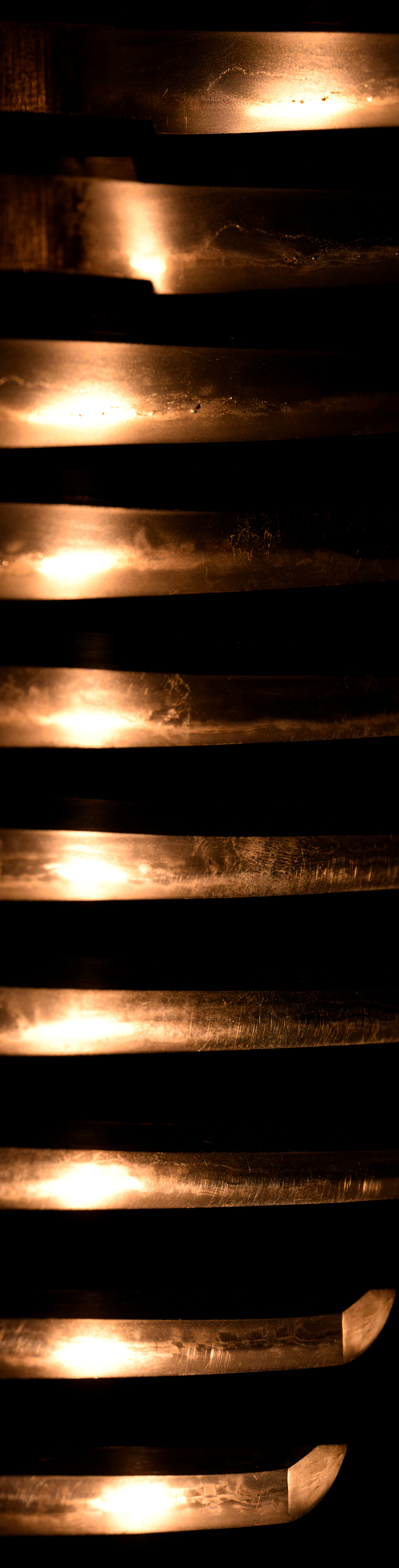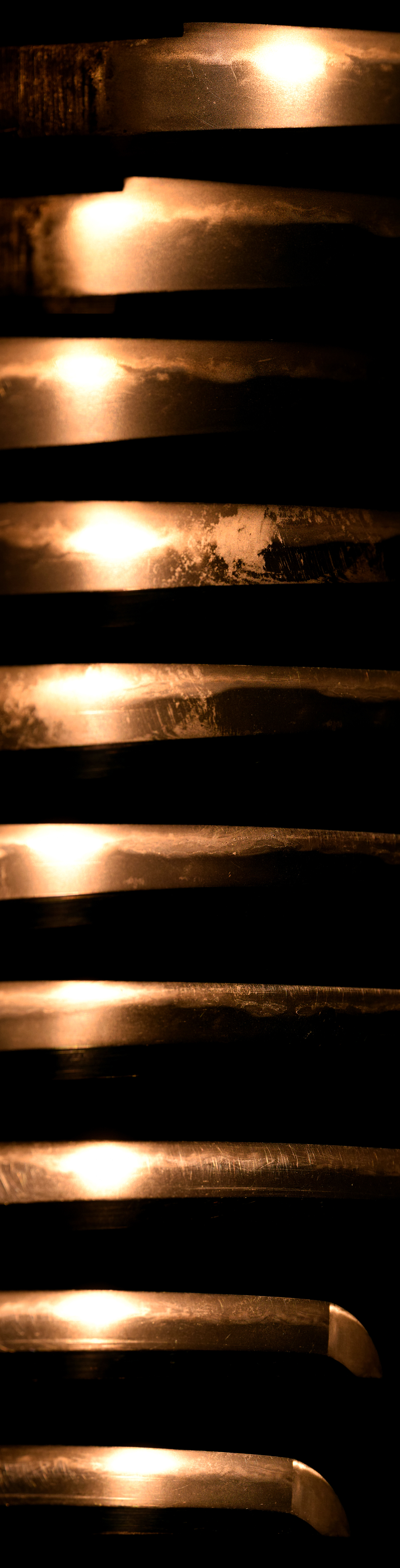 この刀は元先の幅差さほど目立たず、先幅広めの体配。地鉄は小板目が大きく柾流れ、どちらかと言えば柾目に小板目が交じると言った肌合い。刃文は湾れで刃縁や刃中、肌に絡んで渦巻き状の刃や金筋・砂流を顕著に見せ、鋩子は表裏共にすぐ調に丸く返る。