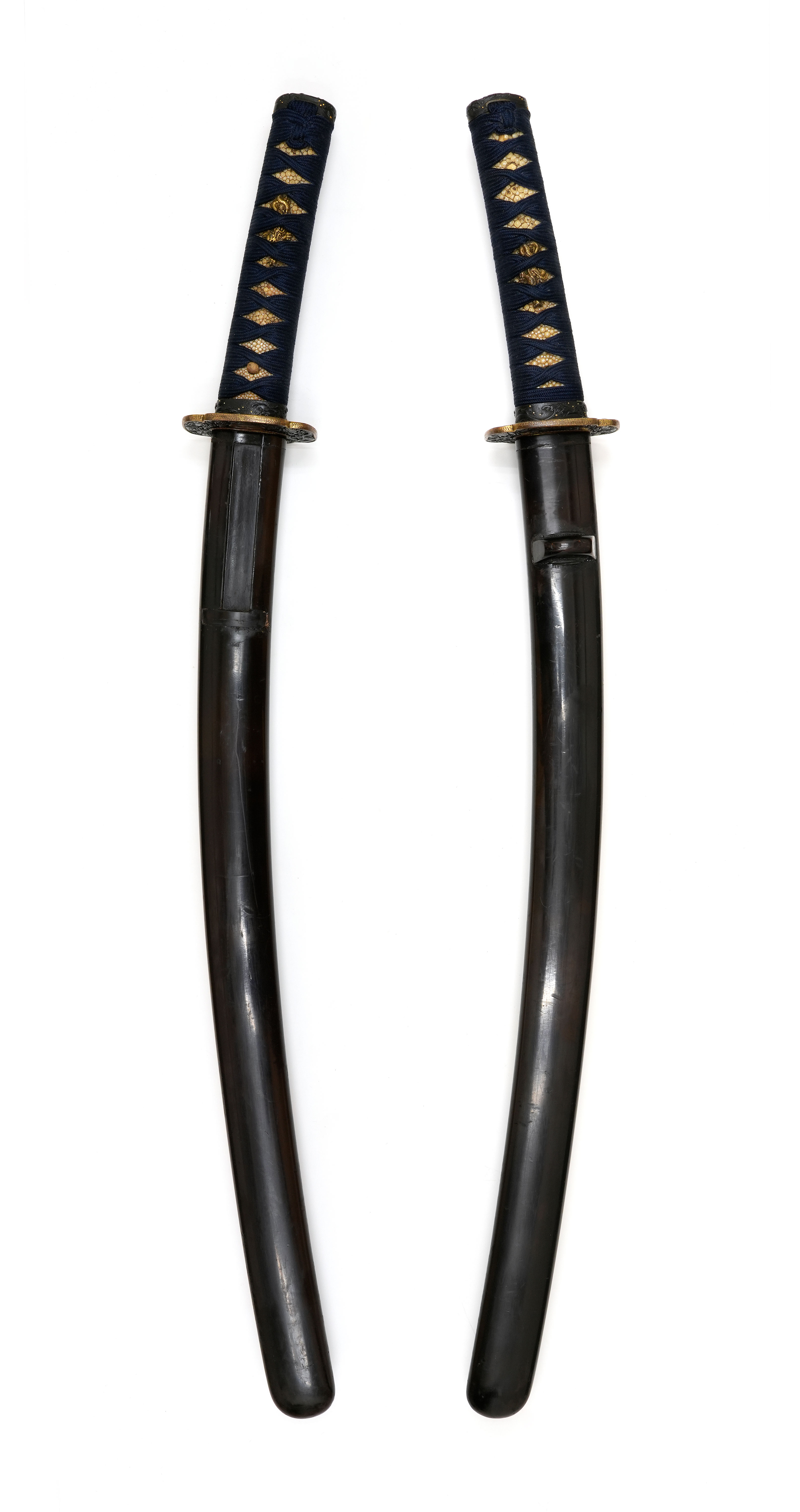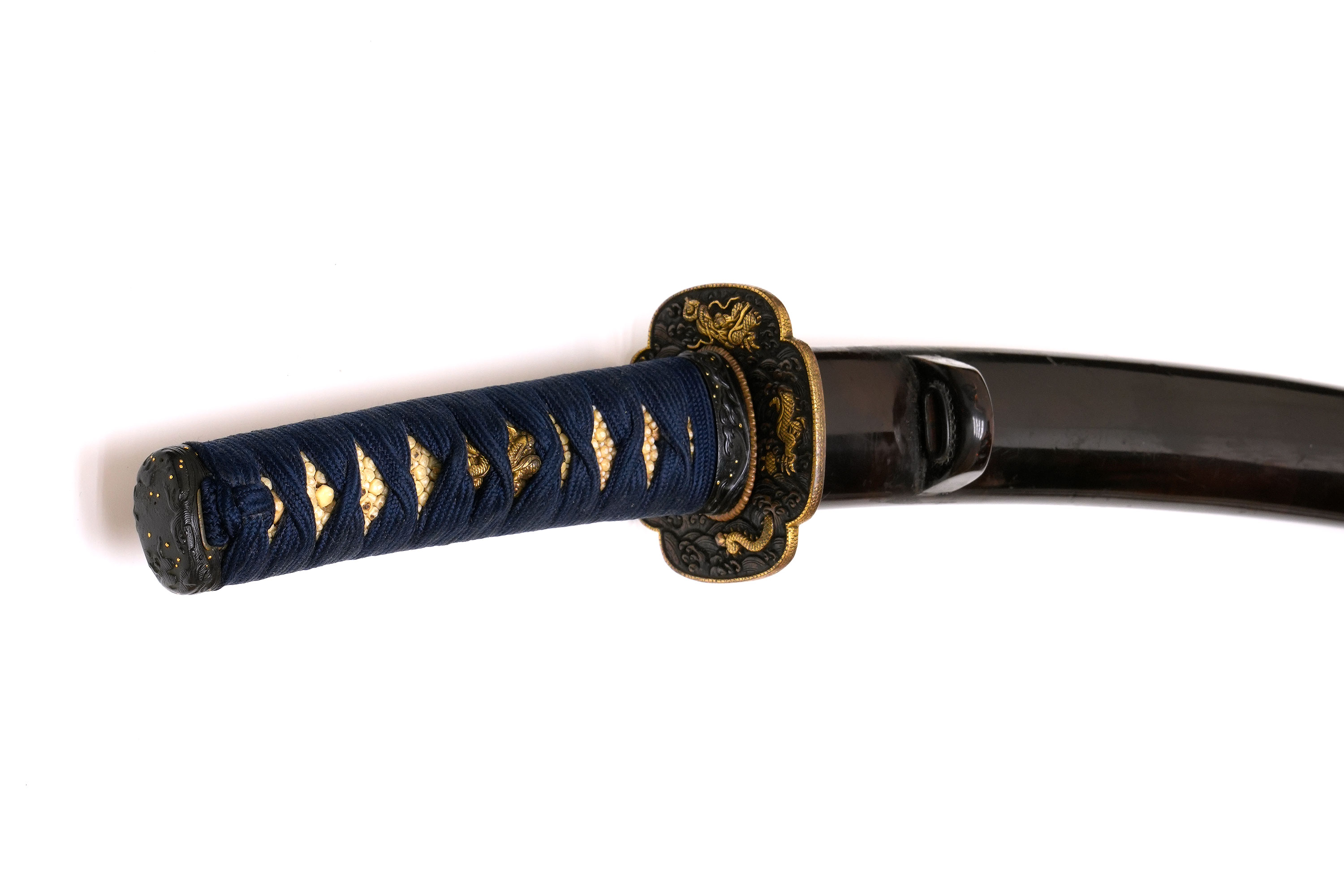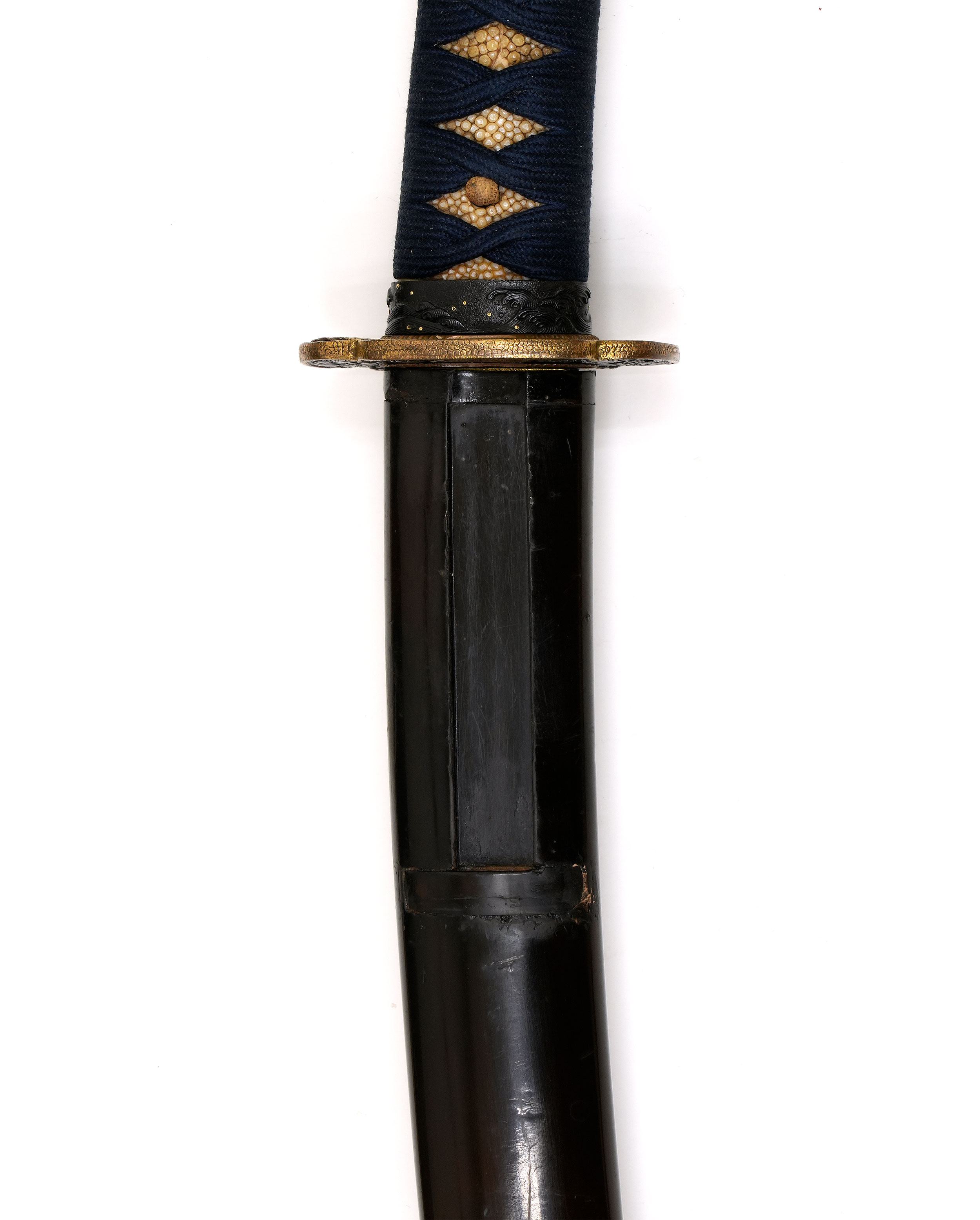 附属の拵は鐔鳴りこそ認められるものの、柄にがたつきはなく実用上の不安はありません。金具は波と龍の意匠で統一されており、全体にすっきりとした気品ある佇まいを備えています。また本刀はうぶ買付刀であり、余計な手が加えられていない点も評価できます。