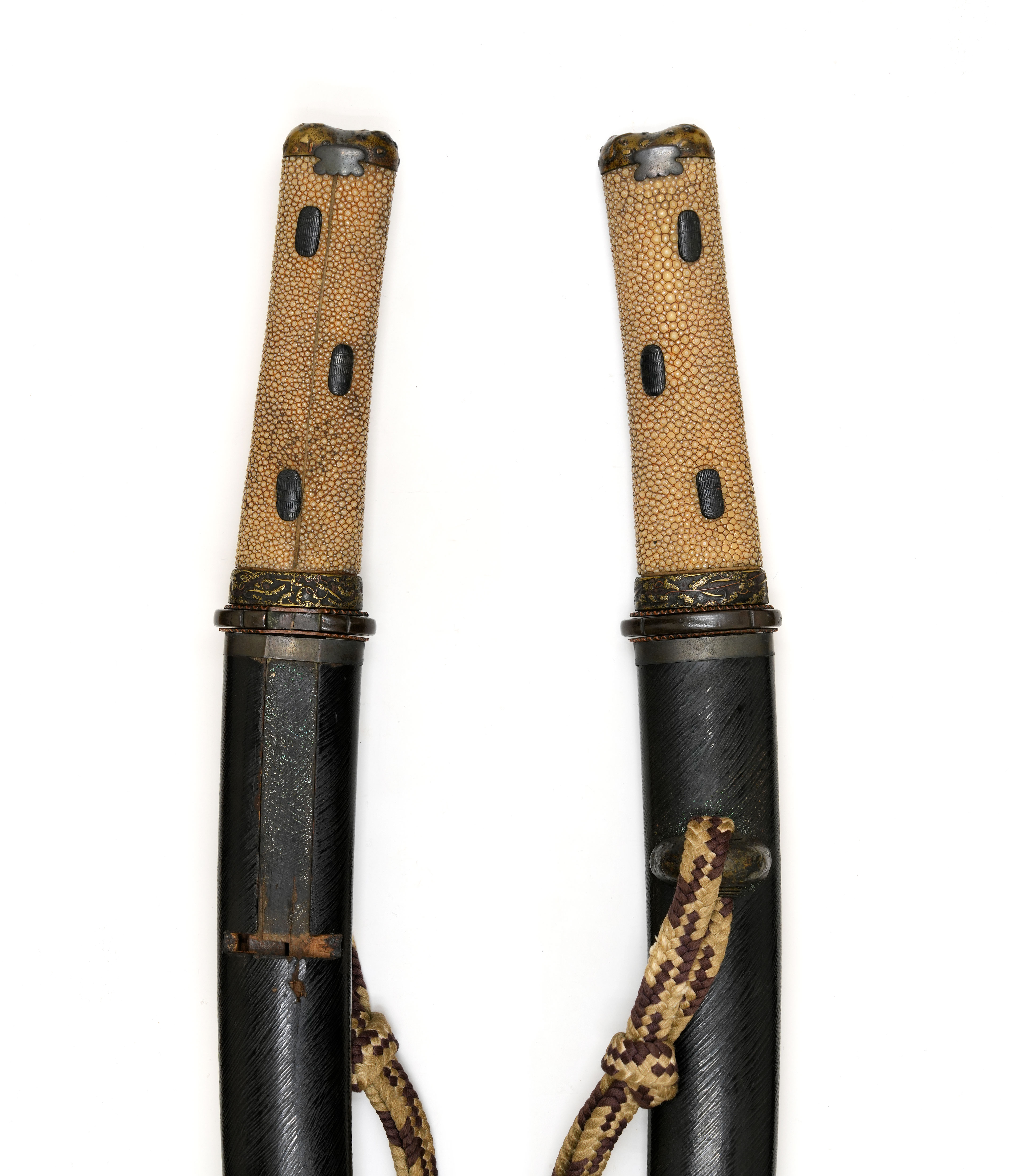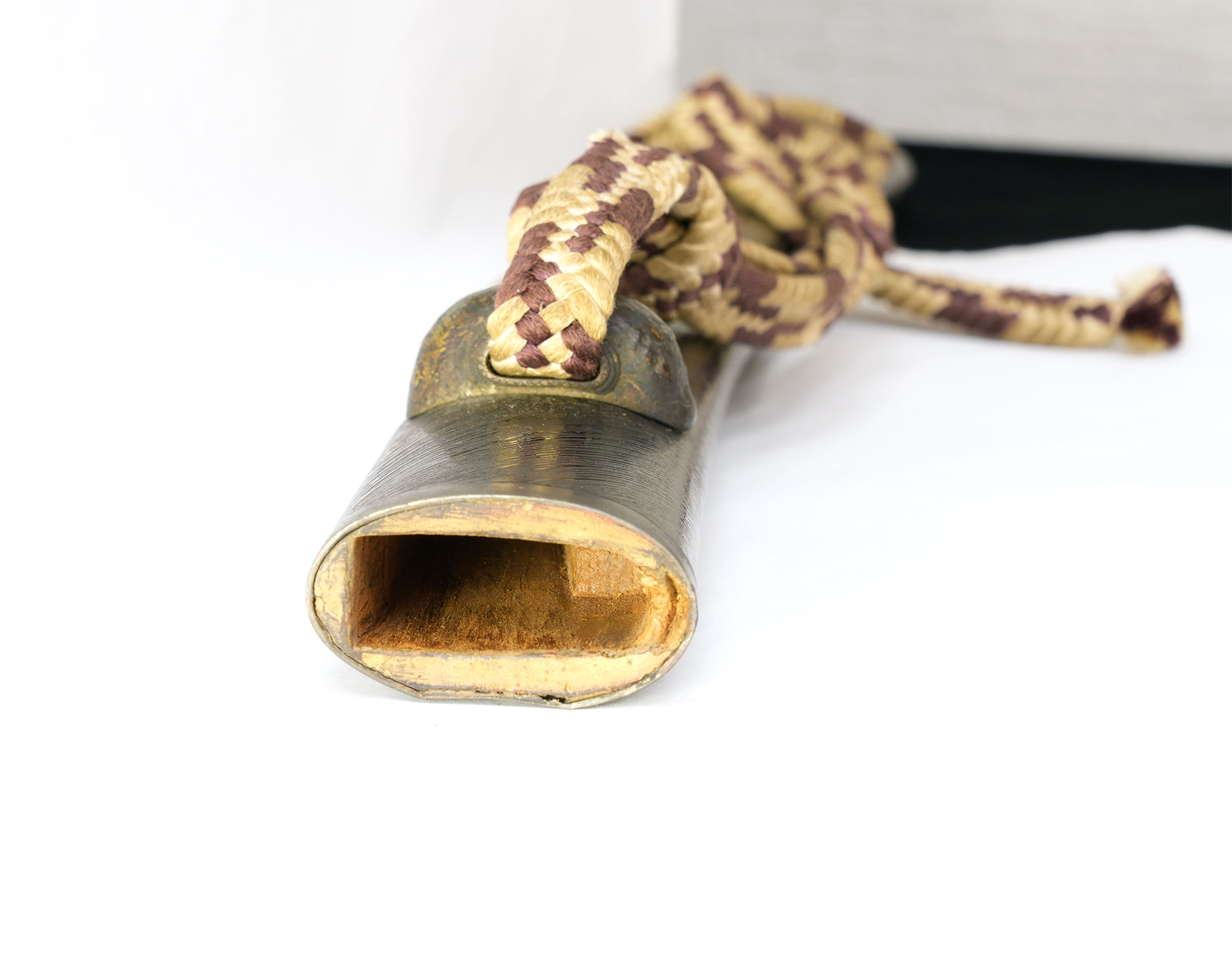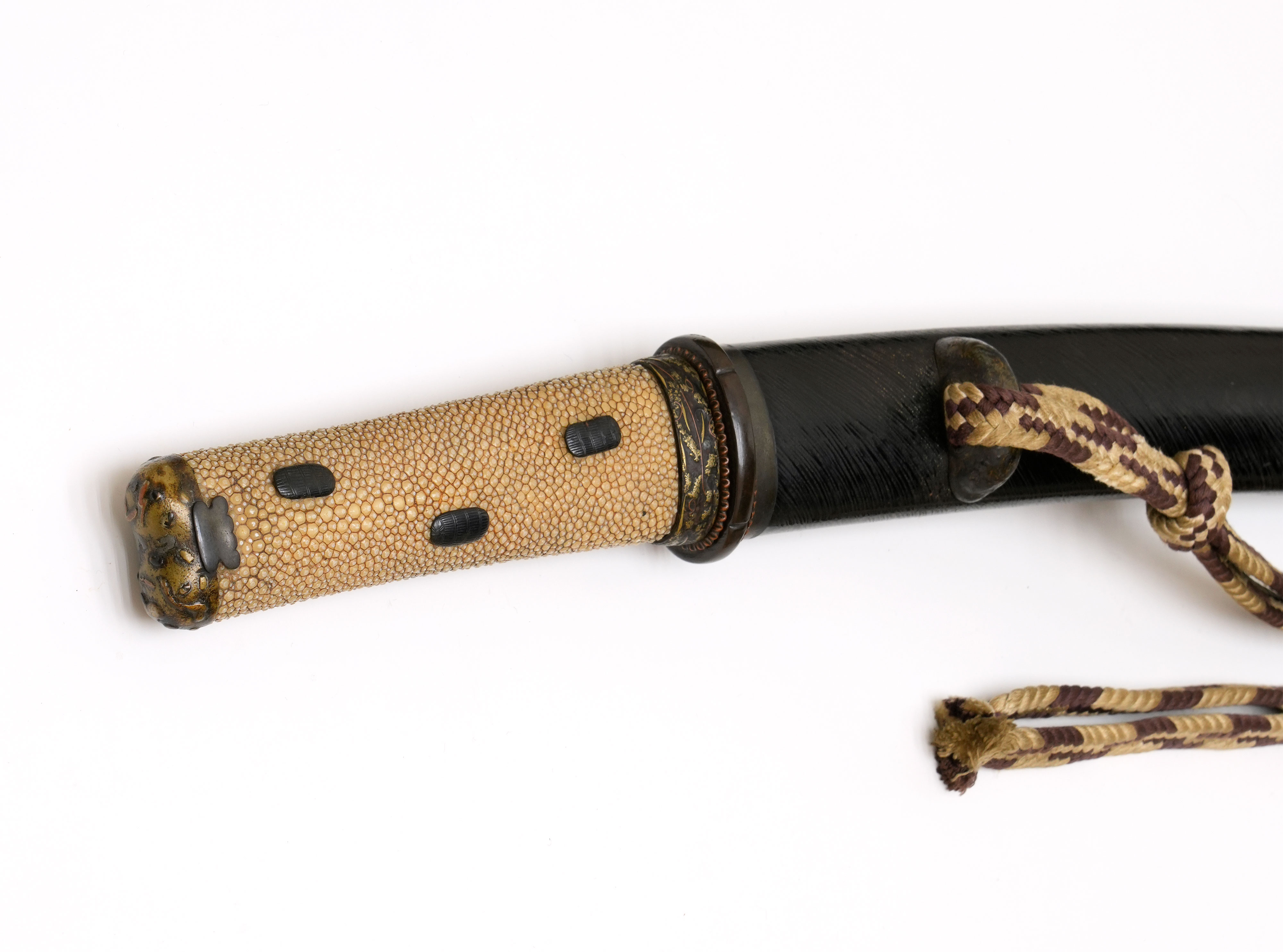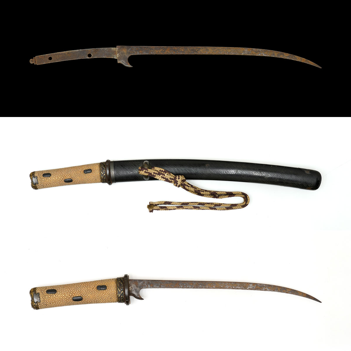 刀剣とは異なり、兜割りは研究が十分に進んでいない分野であるため、本作の制作年代は幅を持たせて室町時代と表記しておりますが、作風や造り込みからは江戸前期に下る可能性も否定できません。茎の仕立てを仔細に見るに、当初は現在よりも茎反りが深かったものと想像され、江戸時代に入ってから反りを抑え、拵を新たに誂え直したものと推測されます。 通常、兜割りに附属する拵は、その用途が一目で判別できる独特の形状を備えるものですが、本兜割りは外見上、脇指と見紛うほど端正な造りとなっている点が非常に興味深く、当時の所持者の趣向や身分を想像させます。実用具でありながら、周囲に用途を悟らせぬ配慮がなされていた可能性もあり、武具史的にも示唆に富む存在といえるでしょう。 経年による影響で鞘には相応の傷みが見られますが、現存数の極めて少ない兜割りであることを考えれば、本作は資料的価値の高い逸品です。鞘の瓦や塗りの補修を施し、後世へと伝え残していただきたい、まさに保存に値する兜割りと申せます。 なお、拵の状態は、鐔鳴りが認められるものの、柄のがたつきはごく僅かで、全体としての収まりは良好です。