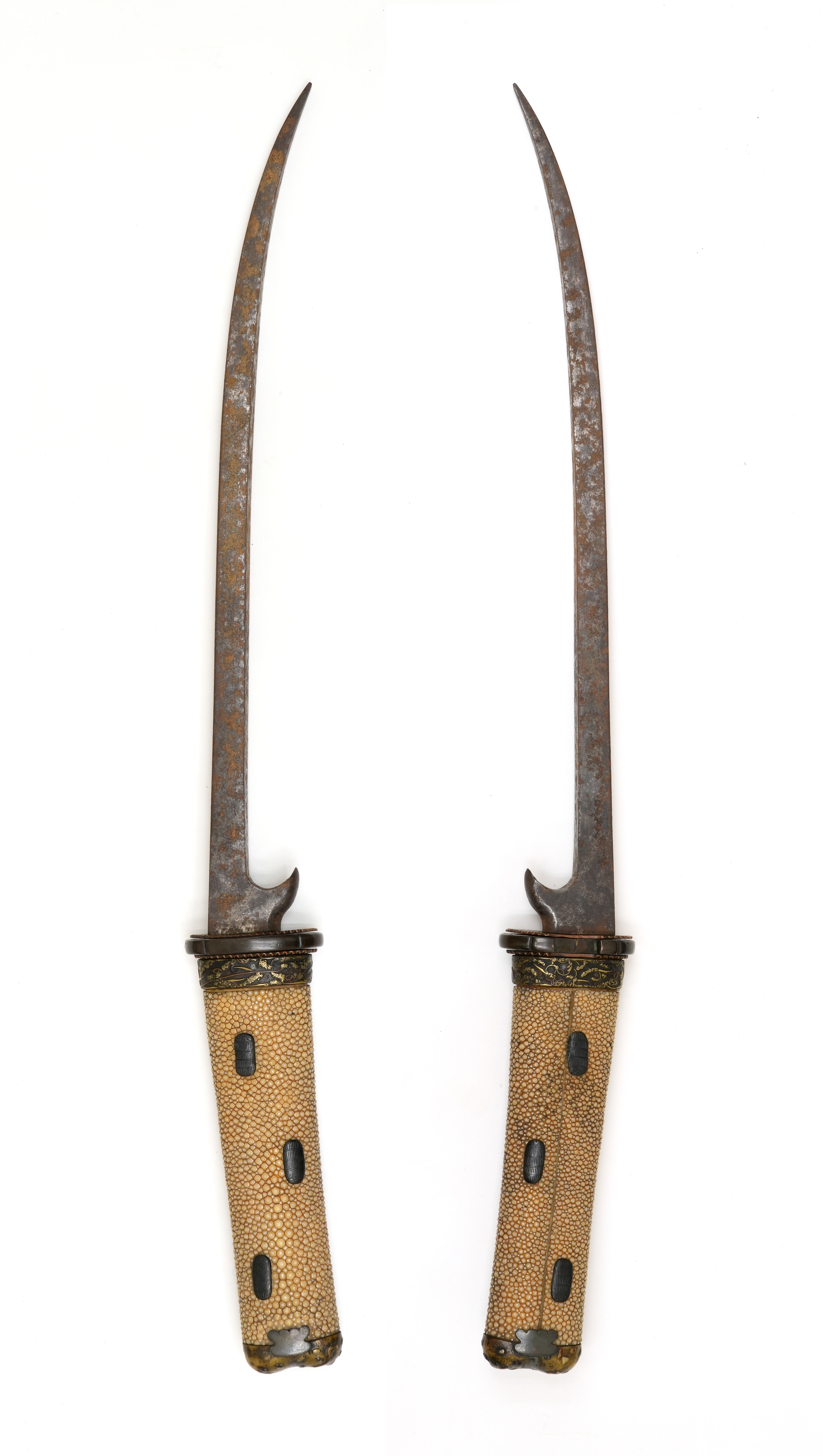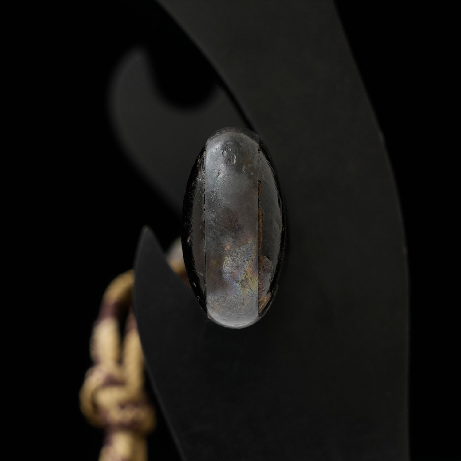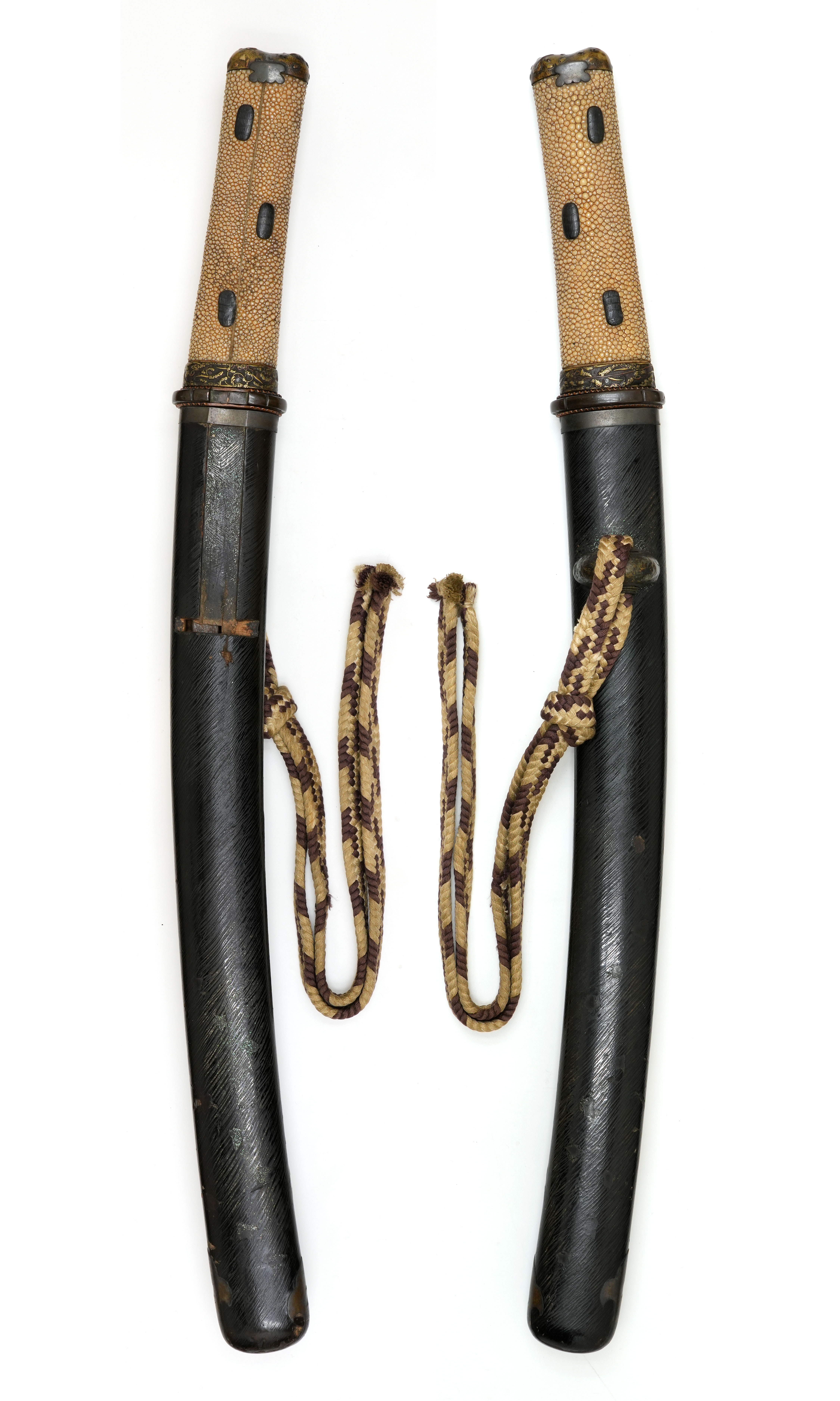 刀剣とは異なり、兜割りは研究が十分に進んでいない分野であるため、本作の制作年代は幅を持たせて室町時代と表記しておりますが、作風や造り込みからは江戸前期に下る可能性も否定できません。茎の仕立てを仔細に見るに、当初は現在よりも茎反りが深かったものと想像され、江戸時代に入ってから反りを抑え、拵を新たに誂え直したものと推測されます。 通常、兜割りに附属する拵は、その用途が一目で判別できる独特の形状を備えるものですが、本兜割りは外見上、脇指と見紛うほど端正な造りとなっている点が非常に興味深く、当時の所持者の趣向や身分を想像させます。実用具でありながら、周囲に用途を悟らせぬ配慮がなされていた可能性もあり、武具史的にも示唆に富む存在といえるでしょう。 経年による影響で鞘には相応の傷みが見られますが、現存数の極めて少ない兜割りであることを考えれば、本作は資料的価値の高い逸品です。鞘の瓦や塗りの補修を施し、後世へと伝え残していただきたい、まさに保存に値する兜割りと申せます。 なお、拵の状態は、鐔鳴りが認められるものの、柄のがたつきはごく僅かで、全体としての収まりは良好です。