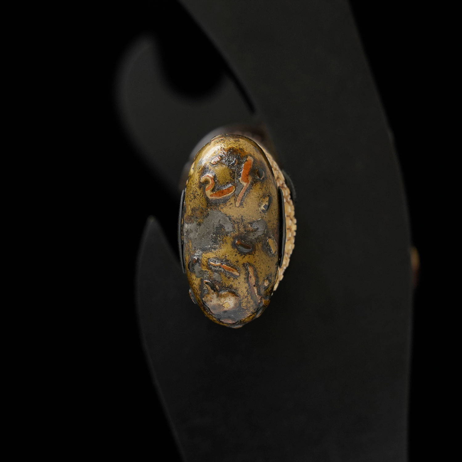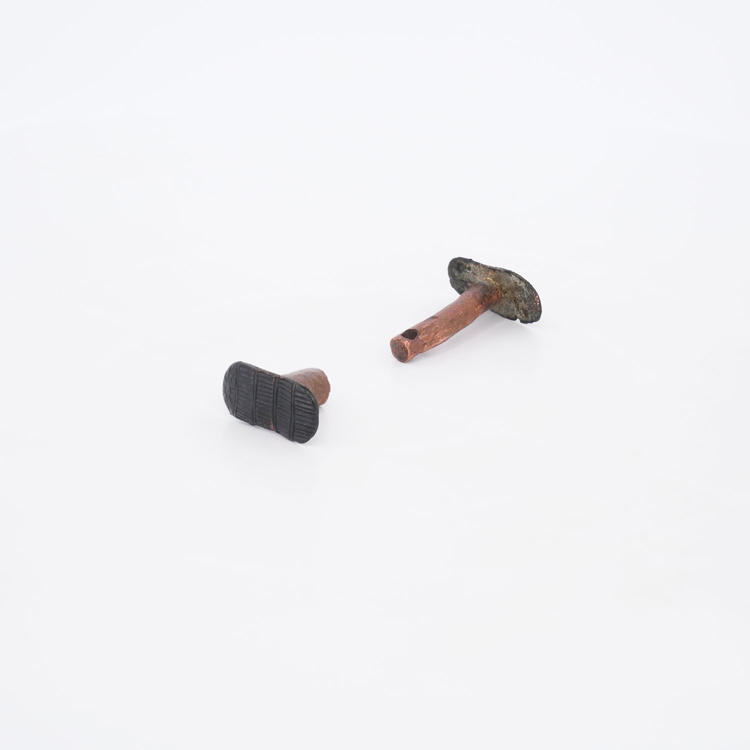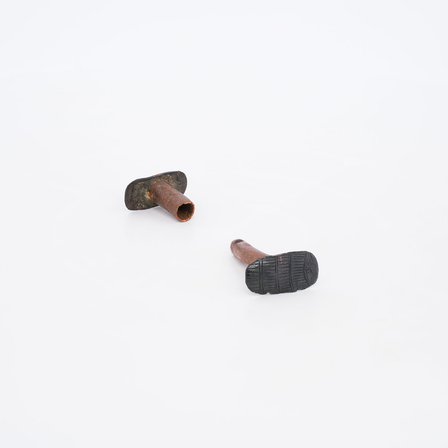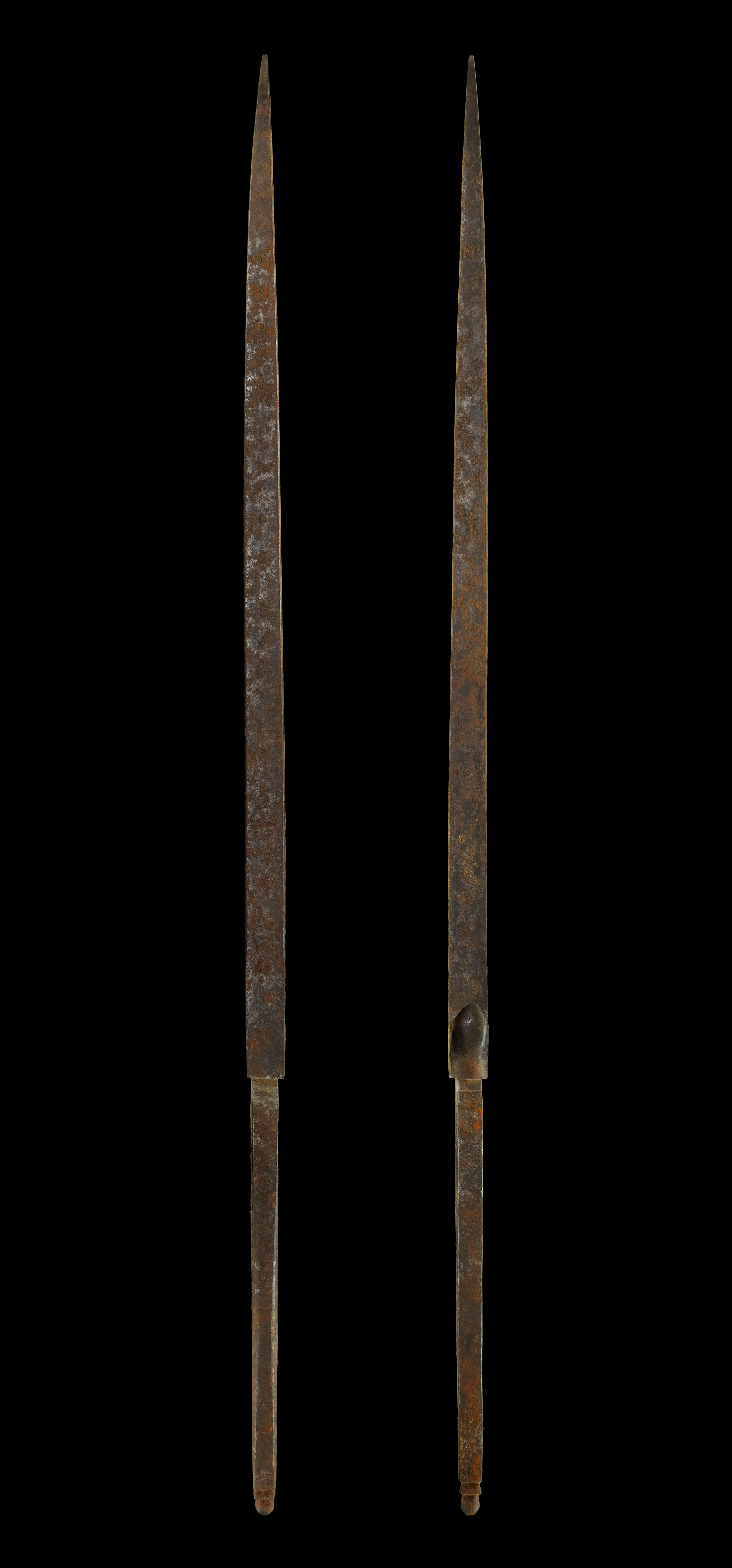 刀剣とは異なり、兜割りは研究が十分に進んでいない分野であるため、本作の制作年代は幅を持たせて室町時代と表記しておりますが、作風や造り込みからは江戸前期に下る可能性も否定できません。茎の仕立てを仔細に見るに、当初は現在よりも茎反りが深かったものと想像され、江戸時代に入ってから反りを抑え、拵を新たに誂え直したものと推測されます。 通常、兜割りに附属する拵は、その用途が一目で判別できる独特の形状を備えるものですが、本兜割りは外見上、脇指と見紛うほど端正な造りとなっている点が非常に興味深く、当時の所持者の趣向や身分を想像させます。実用具でありながら、周囲に用途を悟らせぬ配慮がなされていた可能性もあり、武具史的にも示唆に富む存在といえるでしょう。 経年による影響で鞘には相応の傷みが見られますが、現存数の極めて少ない兜割りであることを考えれば、本作は資料的価値の高い逸品です。鞘の瓦や塗りの補修を施し、後世へと伝え残していただきたい、まさに保存に値する兜割りと申せます。 なお、拵の状態は、鐔鳴りが認められるものの、柄のがたつきはごく僅かで、全体としての収まりは良好です。
