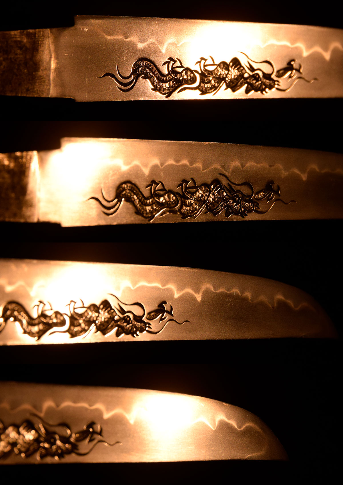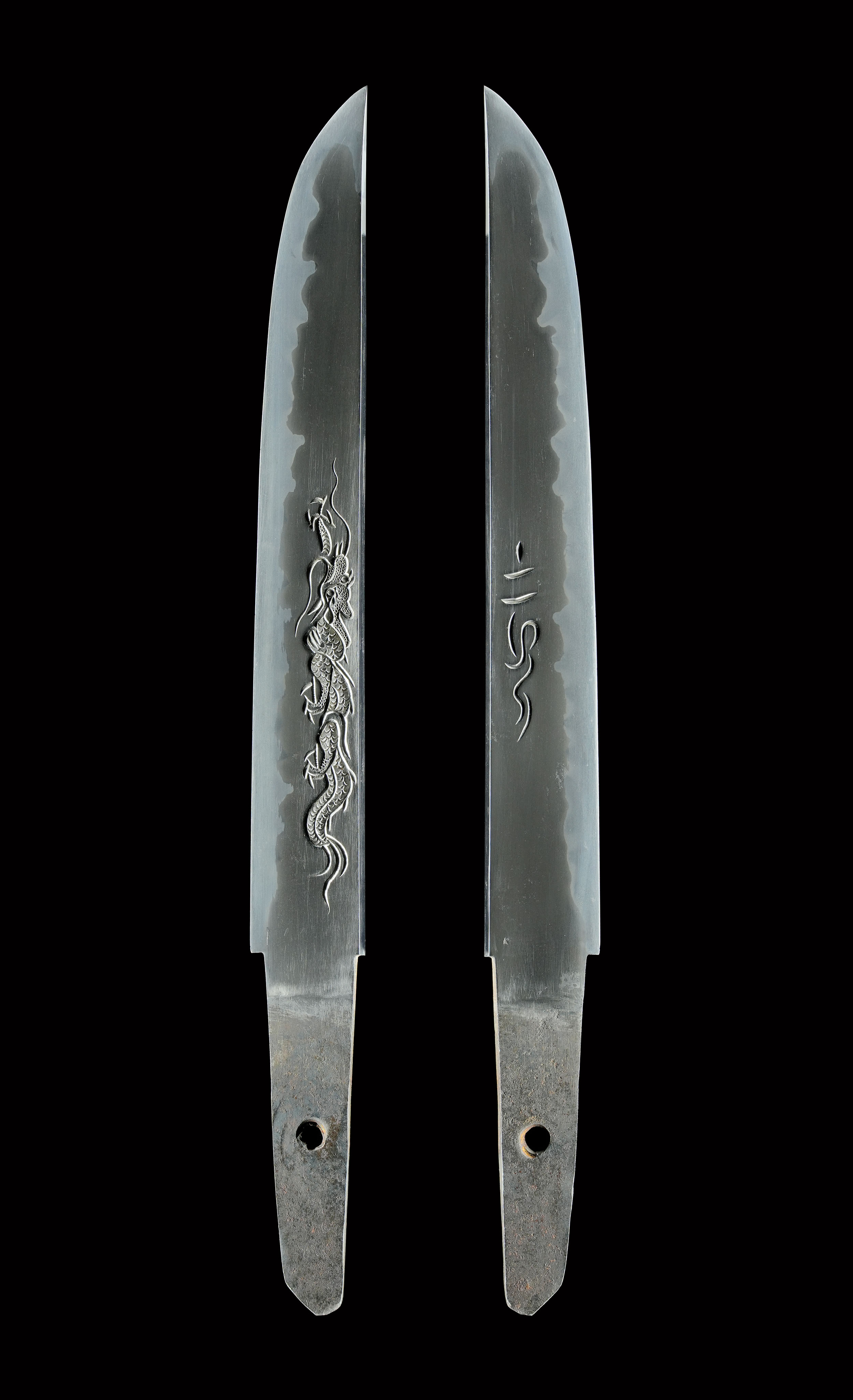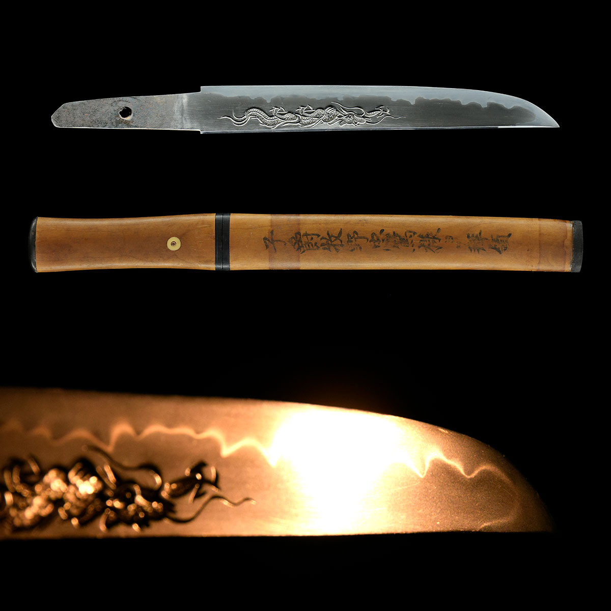 本短刀は平造で庵棟。表には昇り龍、裏には梵字を刻した意欲的な作です。地鉄は小板目がよく錬れて緻密に詰み、無地風となって静謐な表情を見せています。刃文は匂口明るく冴え、互ノ目乱れを基調に、小振りの互ノ目三つと、左右に大きく開いた互ノ目を交互に規則的に配し、鋩子は乱れ込んで先丸く返り、いわゆる「地蔵鋩子」を呈しています。