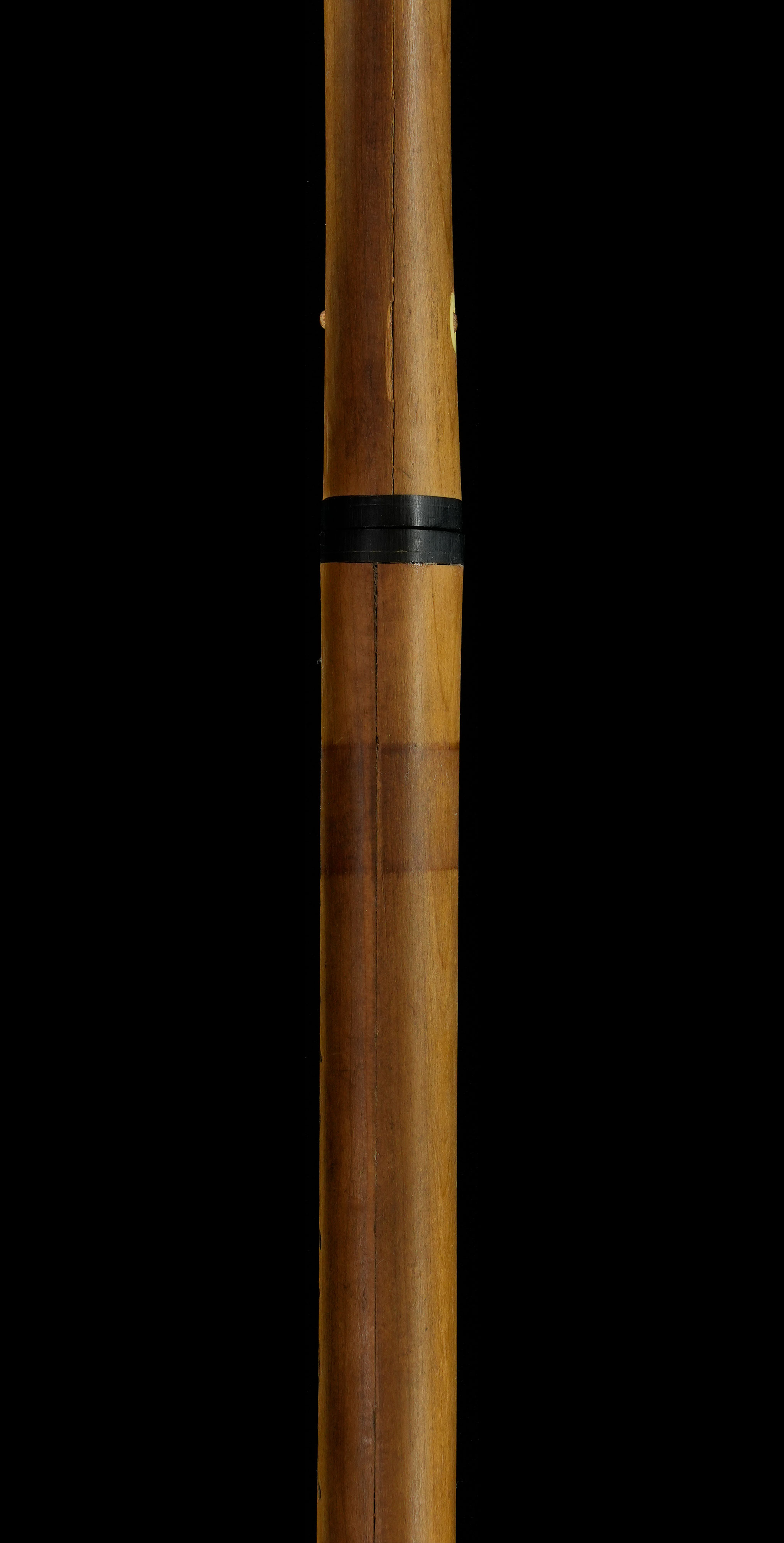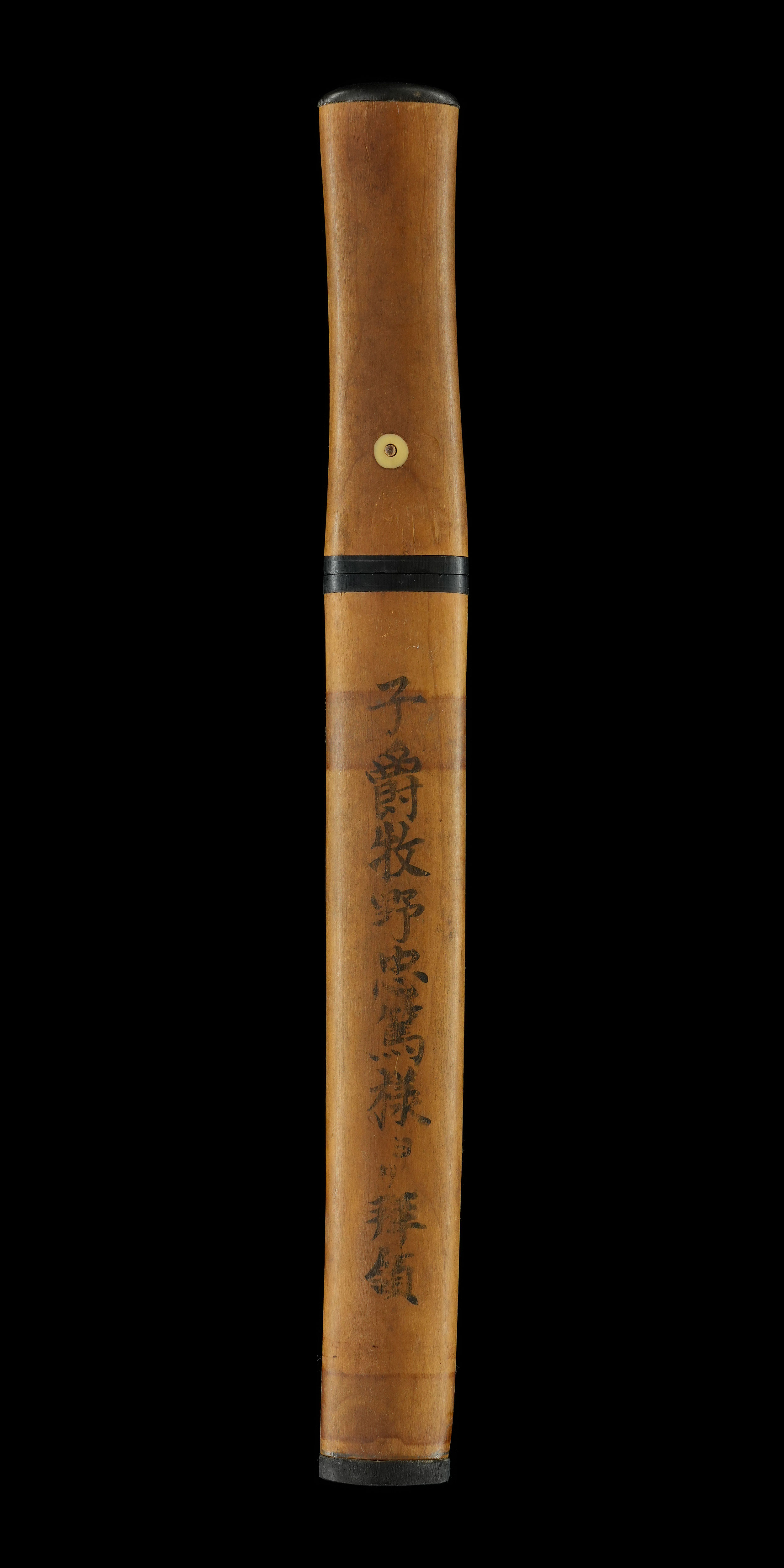 附属の白鞘には「子爵牧野忠篤様ヨリ拝領」との書付が見られます。これを直接裏付ける資料は現存しませんが、本短刀の制作年代を考慮すると、牧野忠篤子爵が知人の入隊祝などの折に贈呈した可能性は十分に考えられ、由緒を想像させる興味深い伝来です。