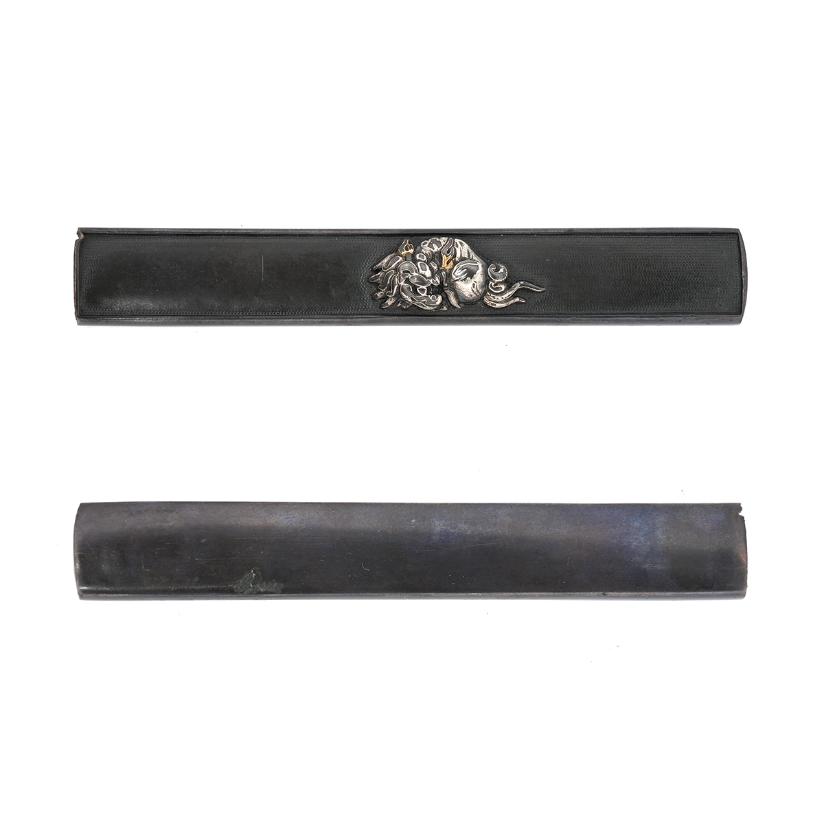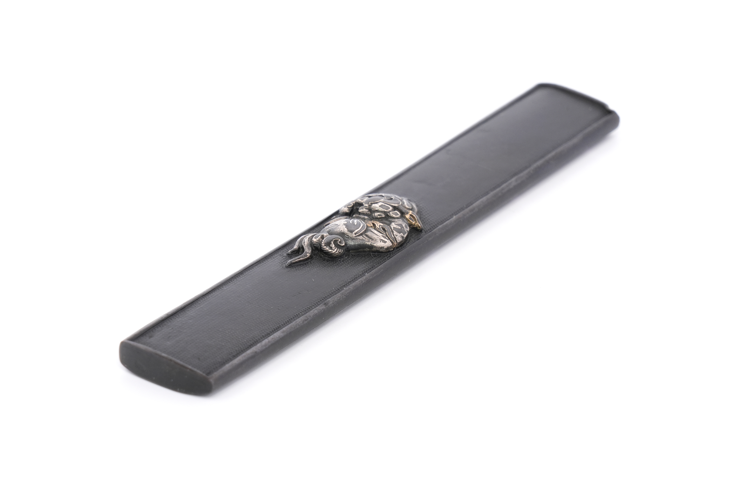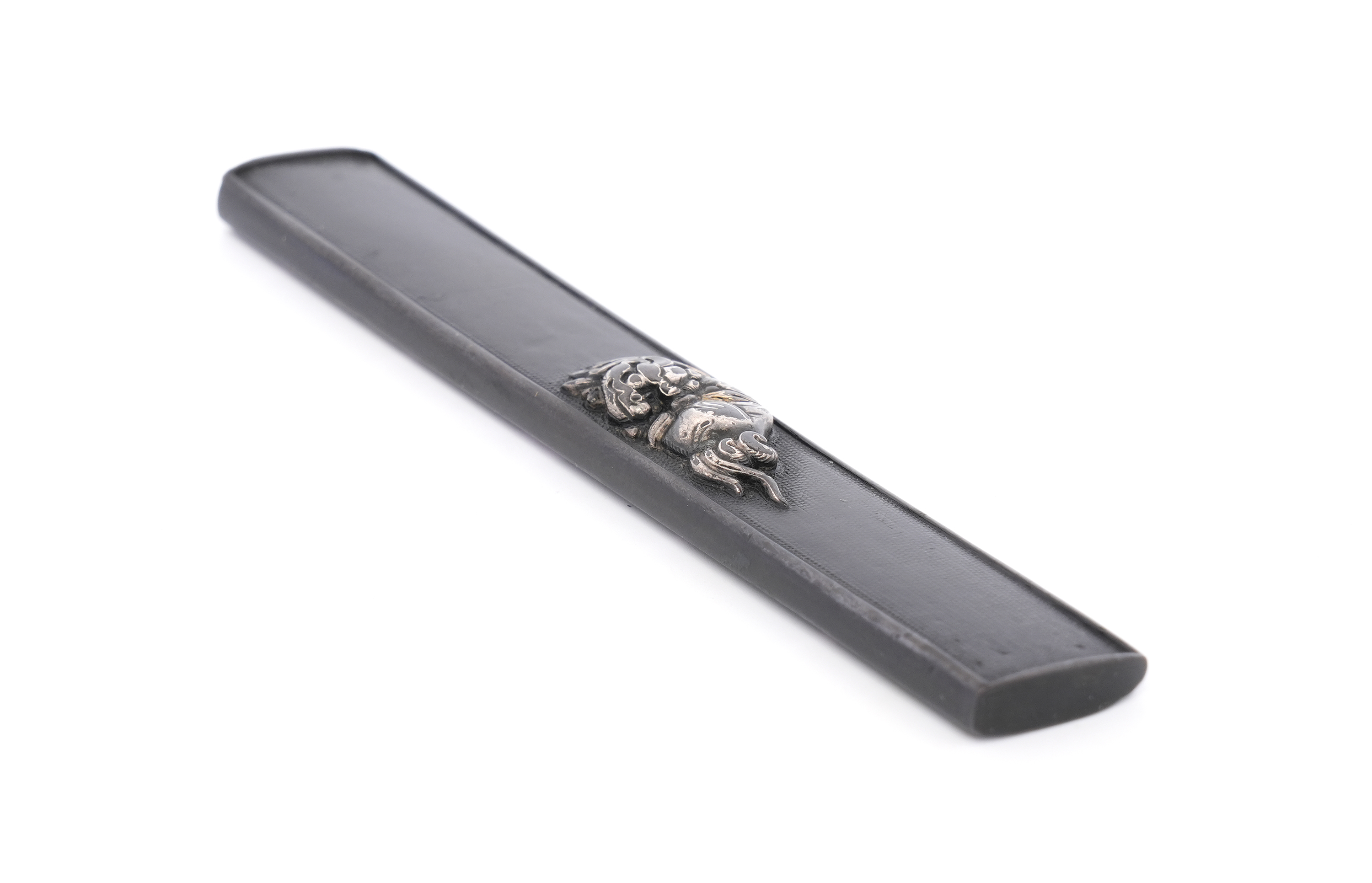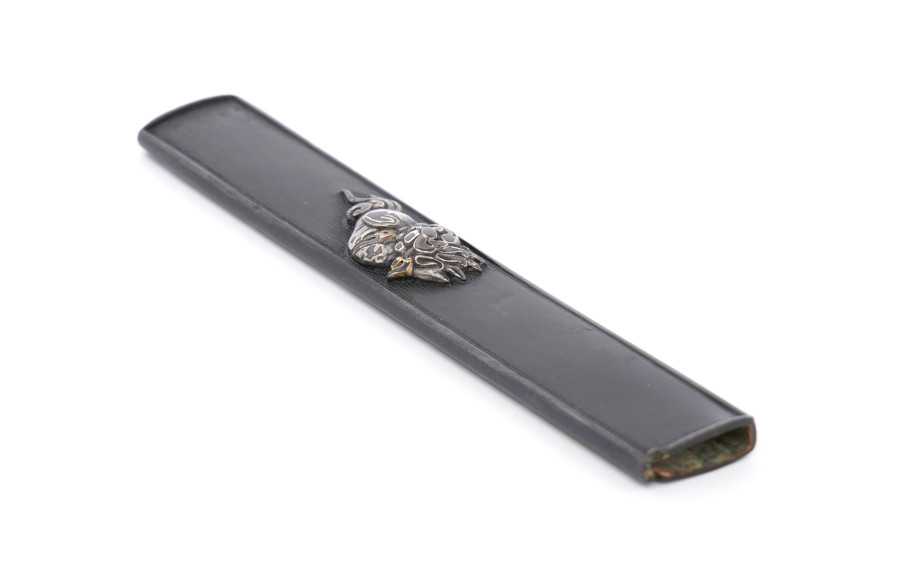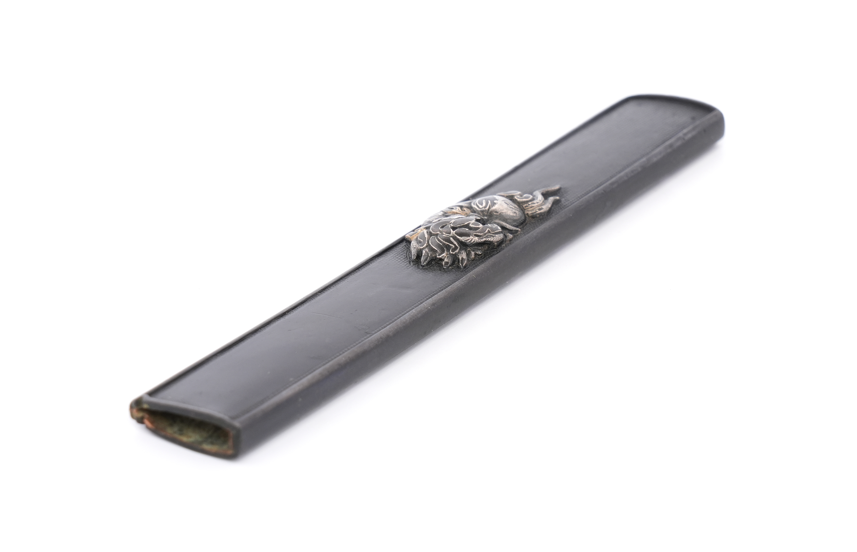 本作は、制作年代を室町時代最末期から江戸初期に遡るとみられる、極めて古い小柄です。地金には赤銅を用い、丹念に魚子地を打ち、その上に一匹の獅子を力強く彫り上げています。 長い年月を経る中で、魚子は摩耗により次第に潰れ、磨地のような柔らかな表情へと変化し、獅子に施されていた金や銀の着せも擦れ落ち、下地が現れています。一見すると粗く見えるかもしれませんが、こうした摩耗痕こそが、後世の作では決して得られない長い使用と時代を経た証左であり、本作が制作年代の古い金工の手になることを雄弁に物語っています。 技巧を誇示するのではなく、時を重ねることで生まれた枯淡の味わいが際立つ、非常に古雅で資料性の高い作品と申せるでしょう。