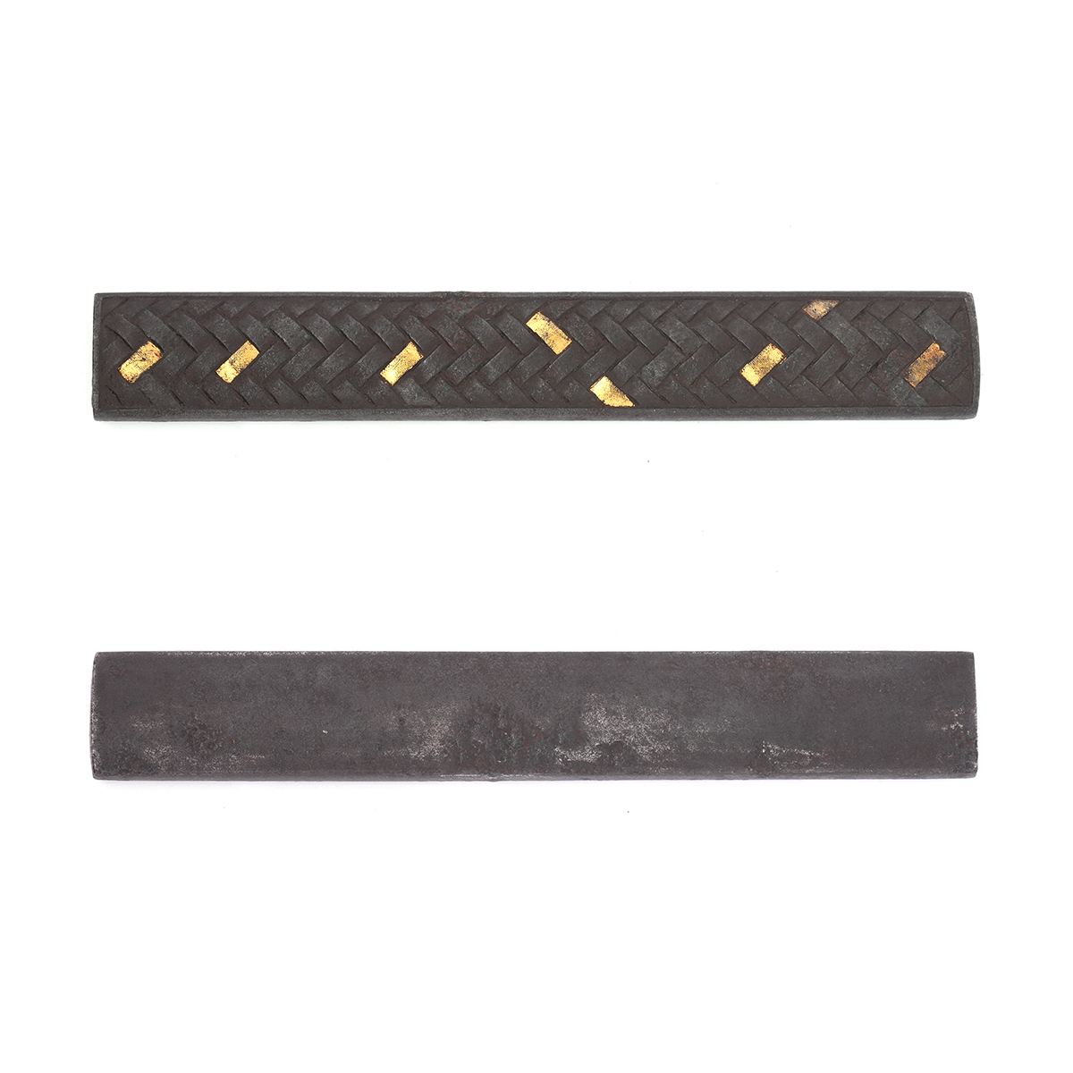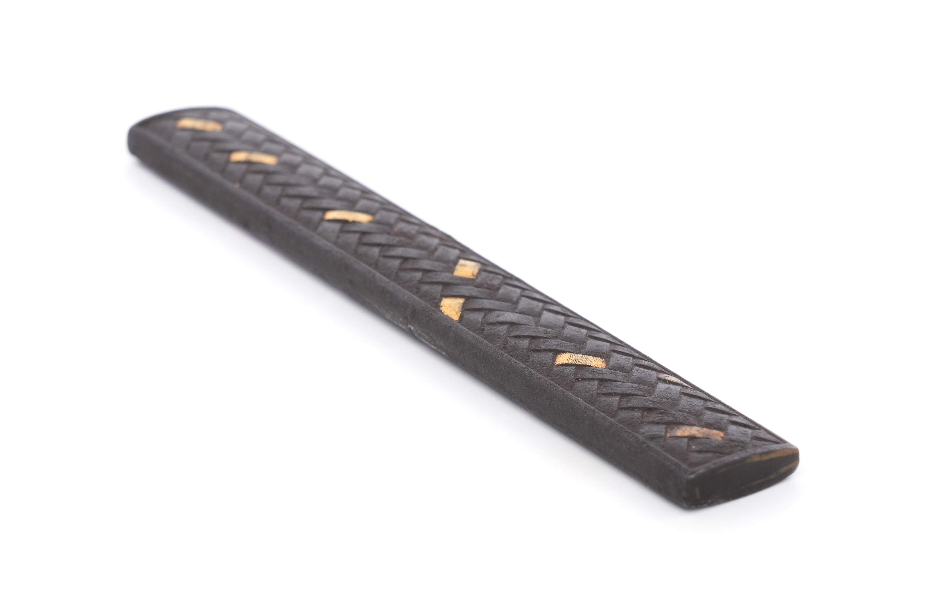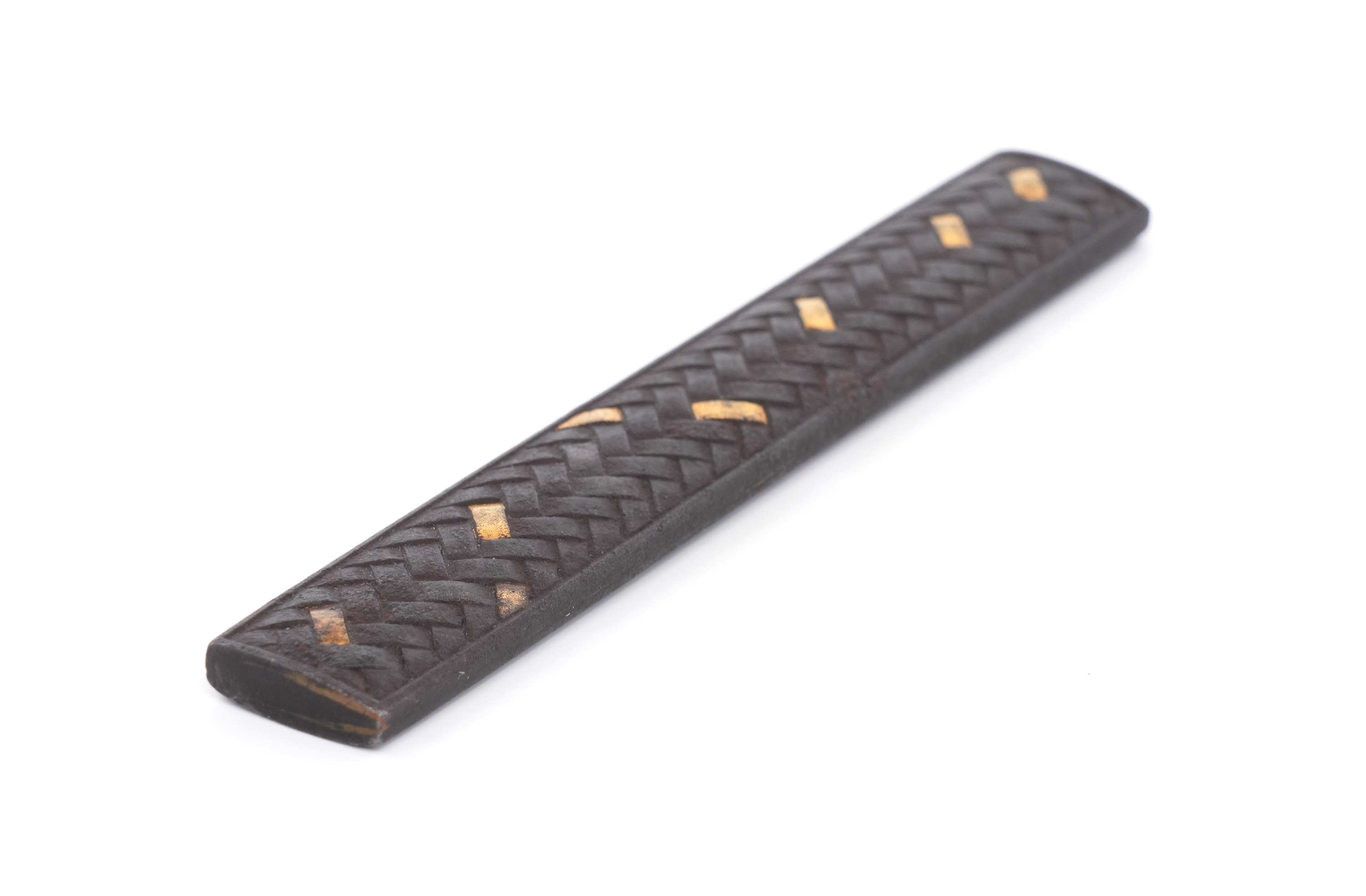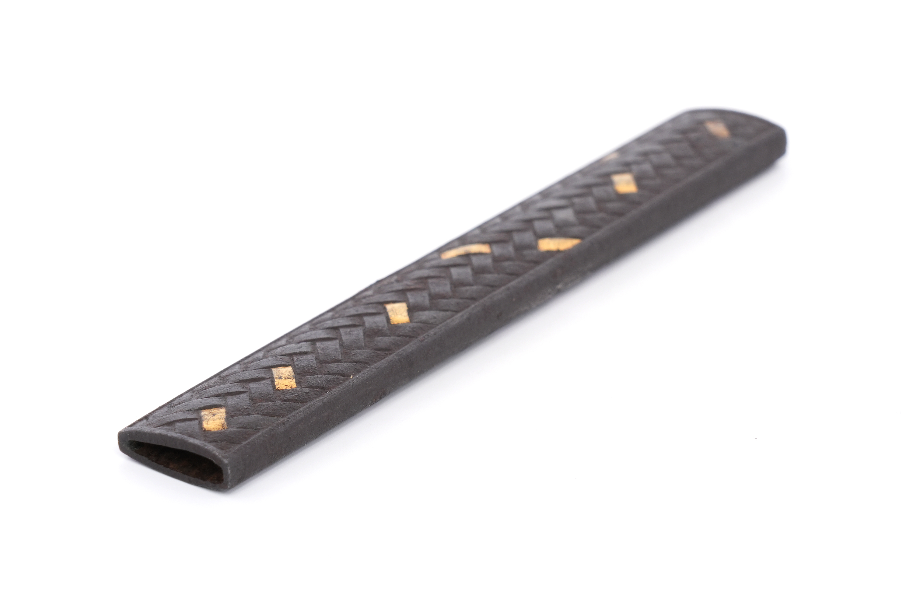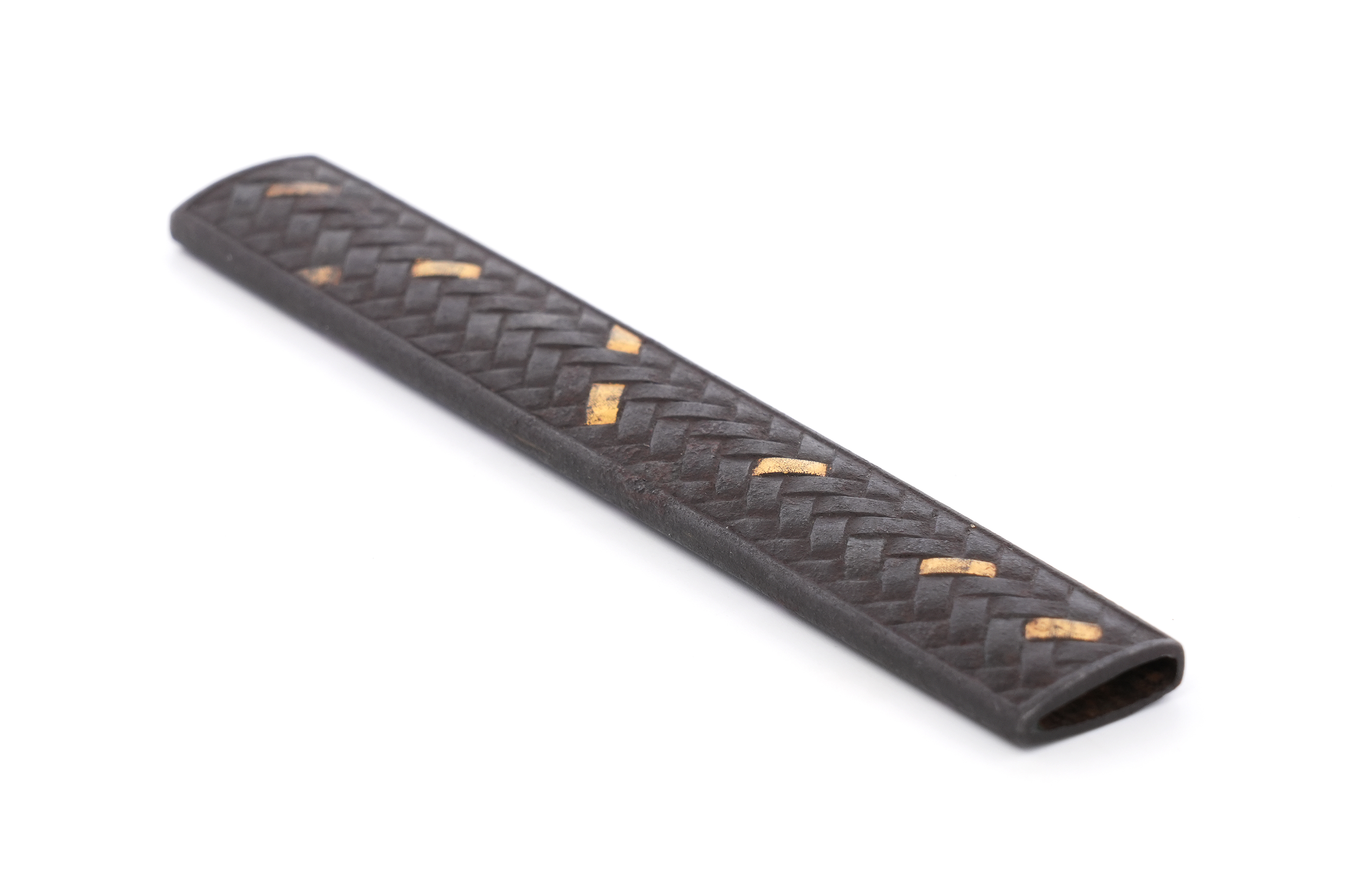 鉄地に網代文を端正に彫り上げた小柄です。各角は甘さなく立ち、彫口も明瞭で、仕事の確かさが一目で伝わってきます。所々に配された金象嵌が単調になりがちな意匠に程よい変化と華を添え、本作全体を引き締める良いアクセントとなっています。