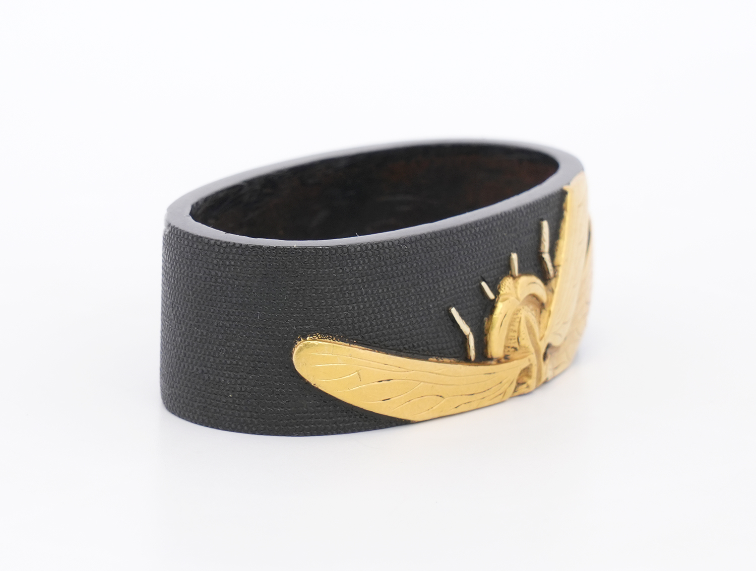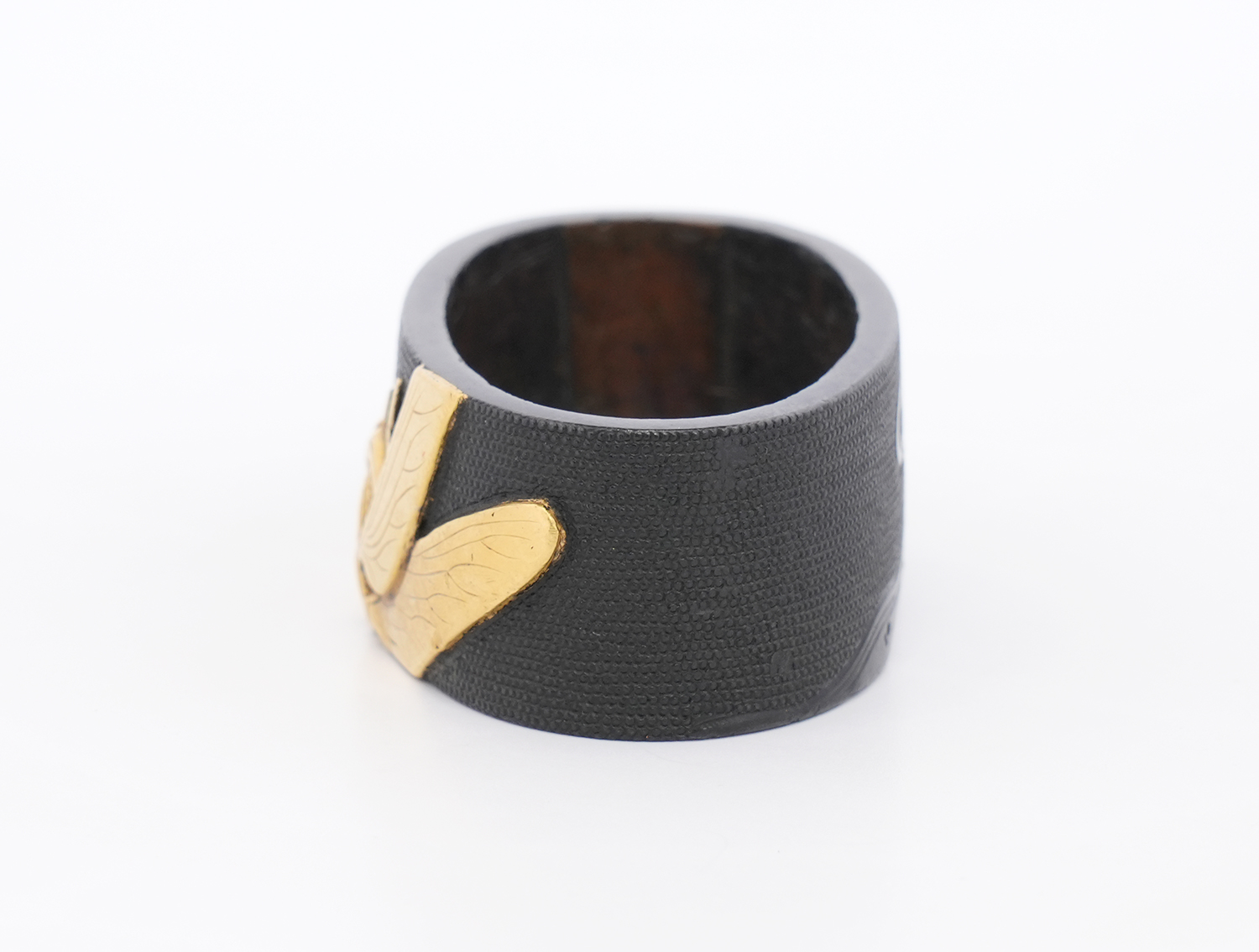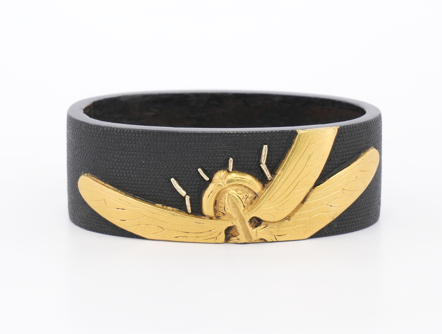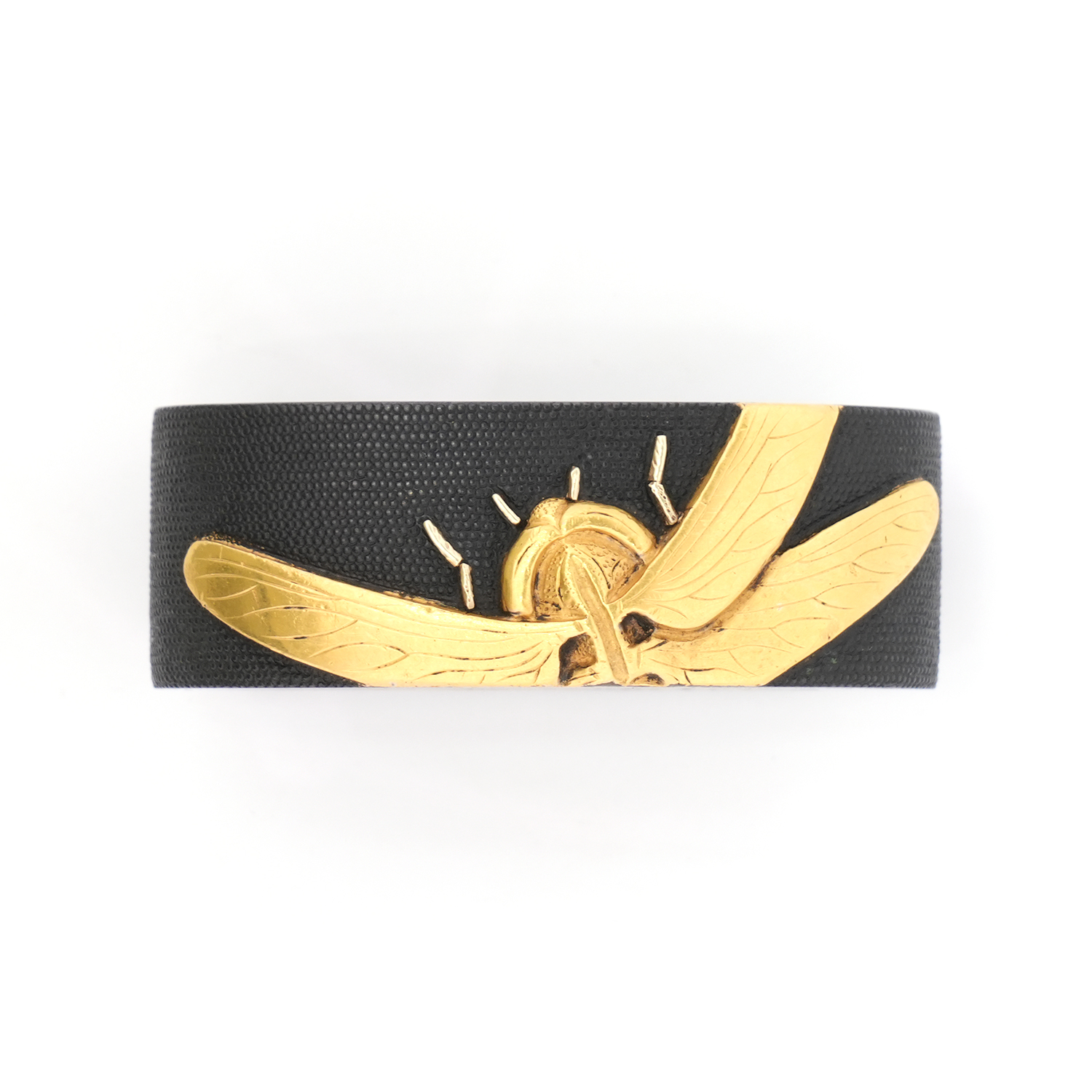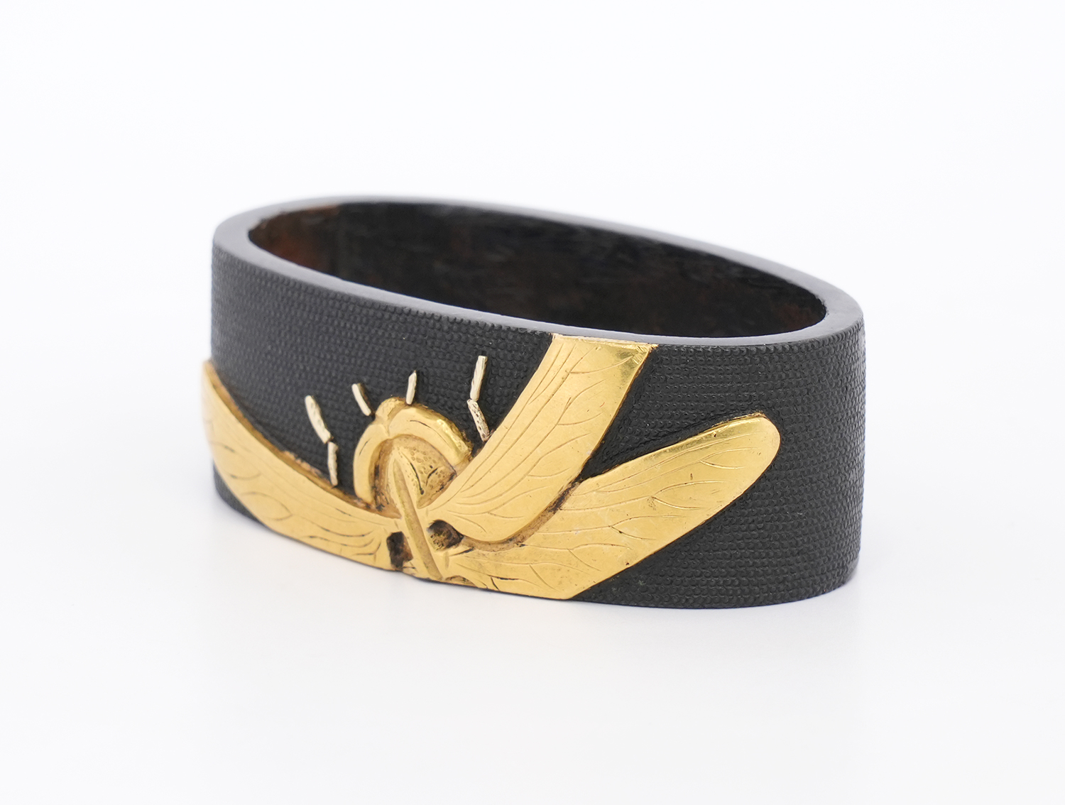 色味の冴えた赤銅地に、極めて細やかな魚子を丁寧に打ち出し、水辺を飛び交う勝虫を金色絵で煌めかせた秀作です。赤銅の深みある光沢と魚子地の繊細さに、金の勝虫が華やかな彩りを添え、躍動感と吉祥性を兼ね備えた品位ある仕上がりとなっています。