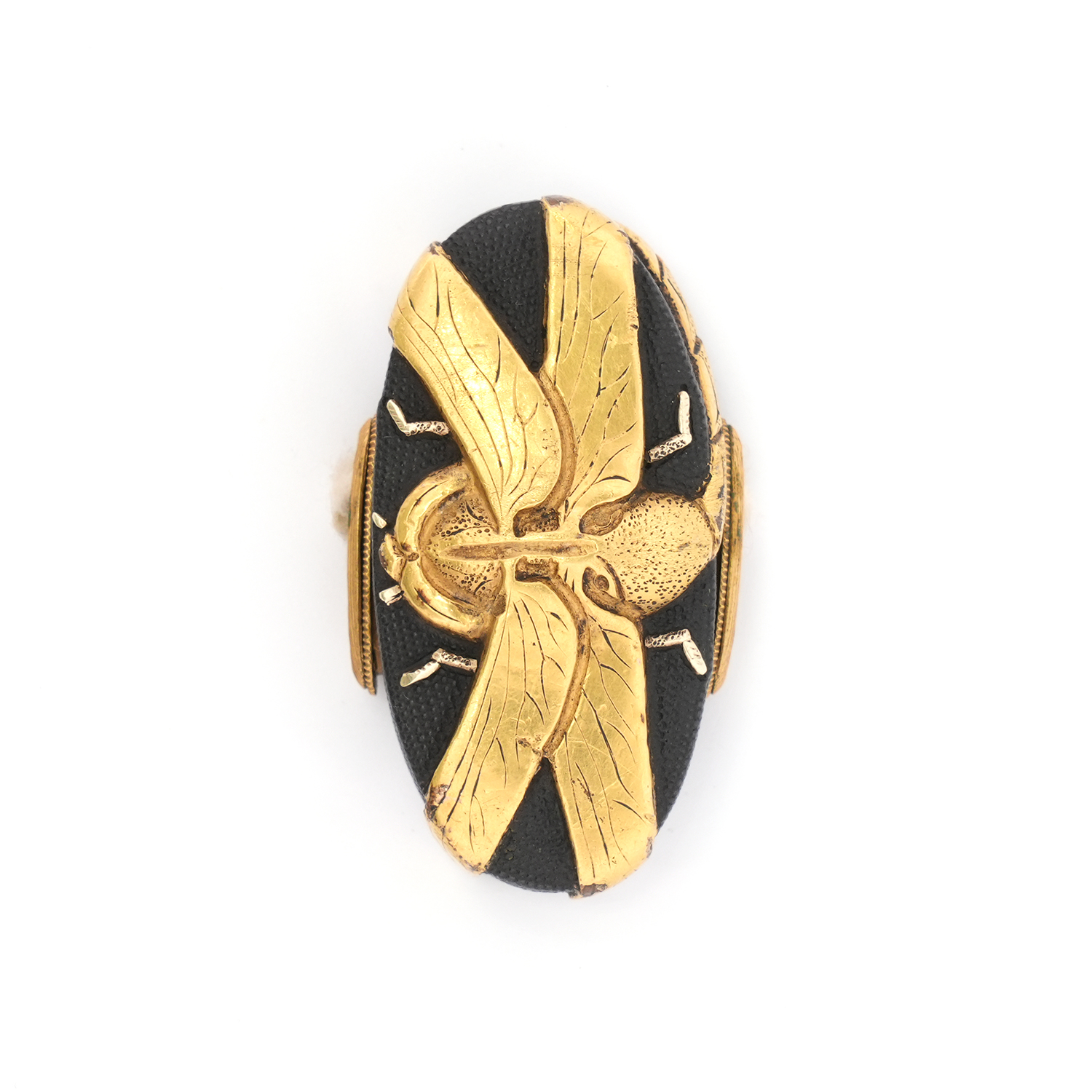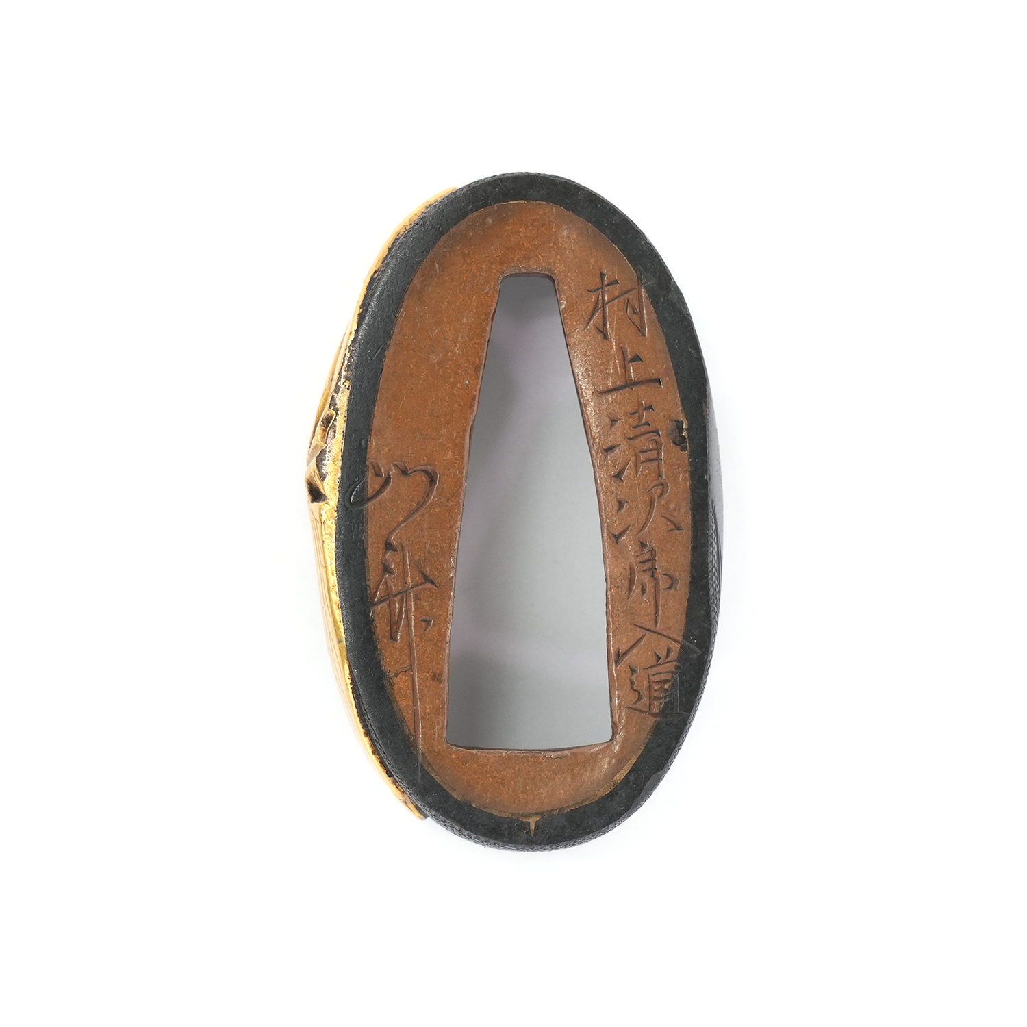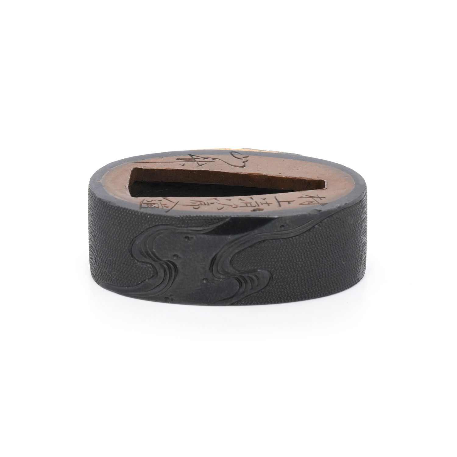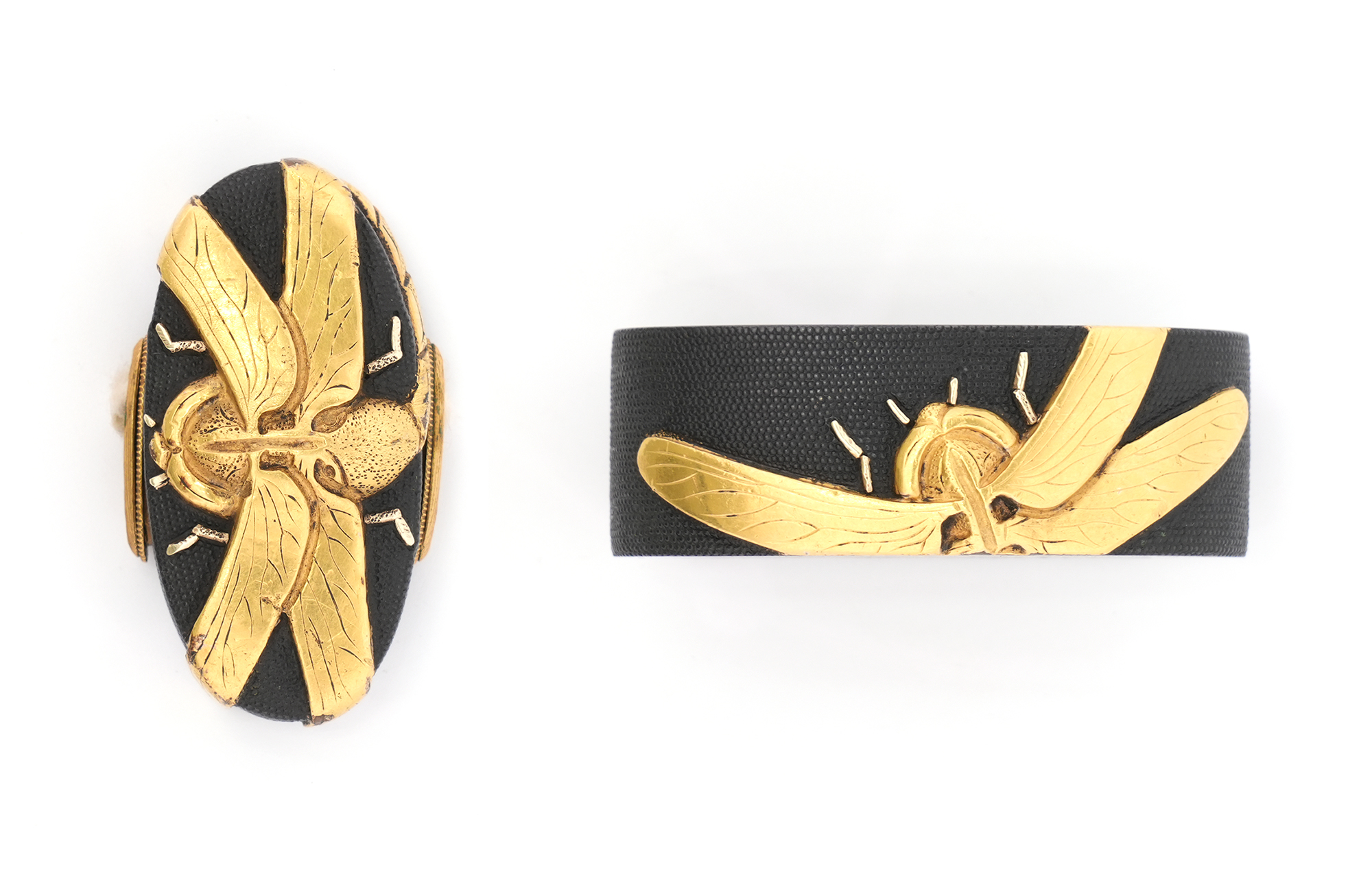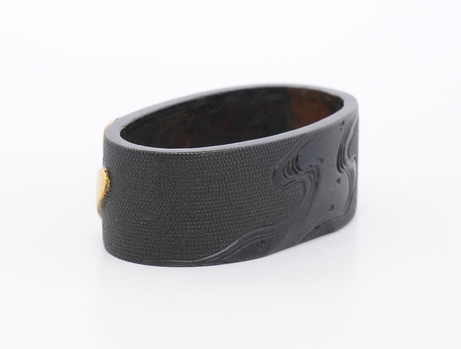 色味の冴えた赤銅地に、極めて細やかな魚子を丁寧に打ち出し、水辺を飛び交う勝虫を金色絵で煌めかせた秀作です。赤銅の深みある光沢と魚子地の繊細さに、金の勝虫が華やかな彩りを添え、躍動感と吉祥性を兼ね備えた品位ある仕上がりとなっています。