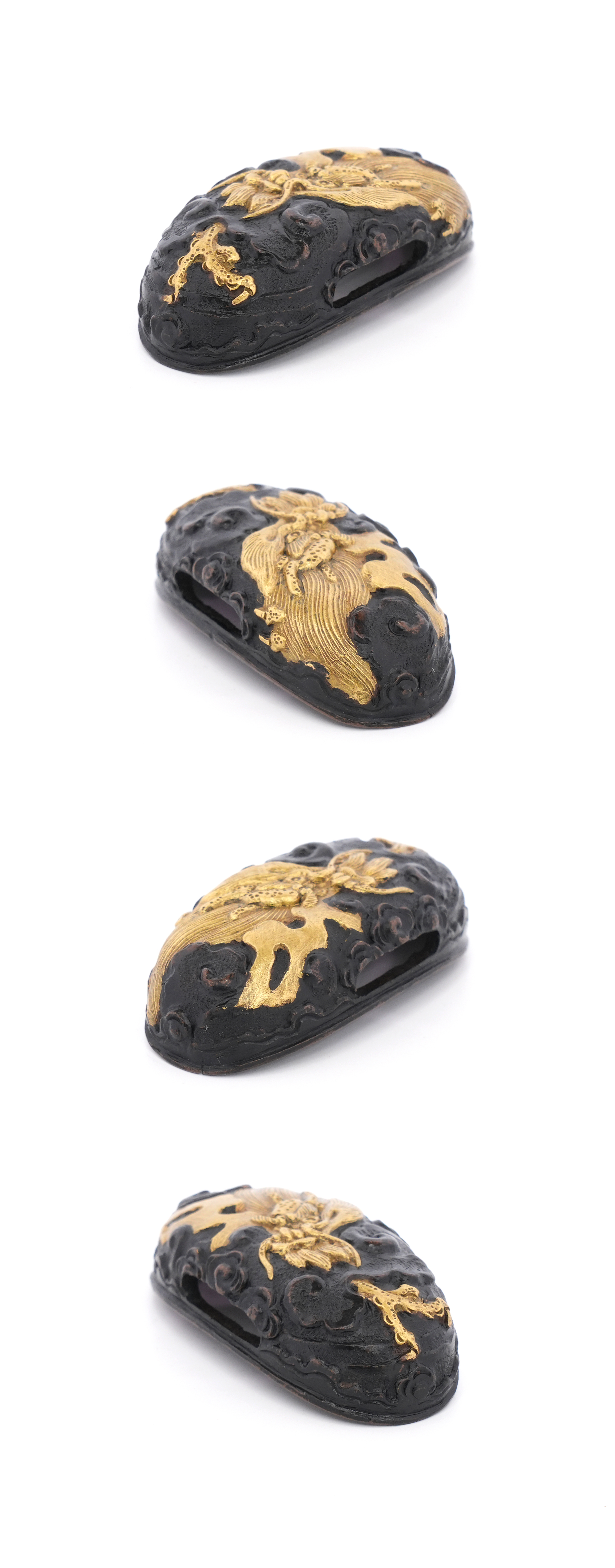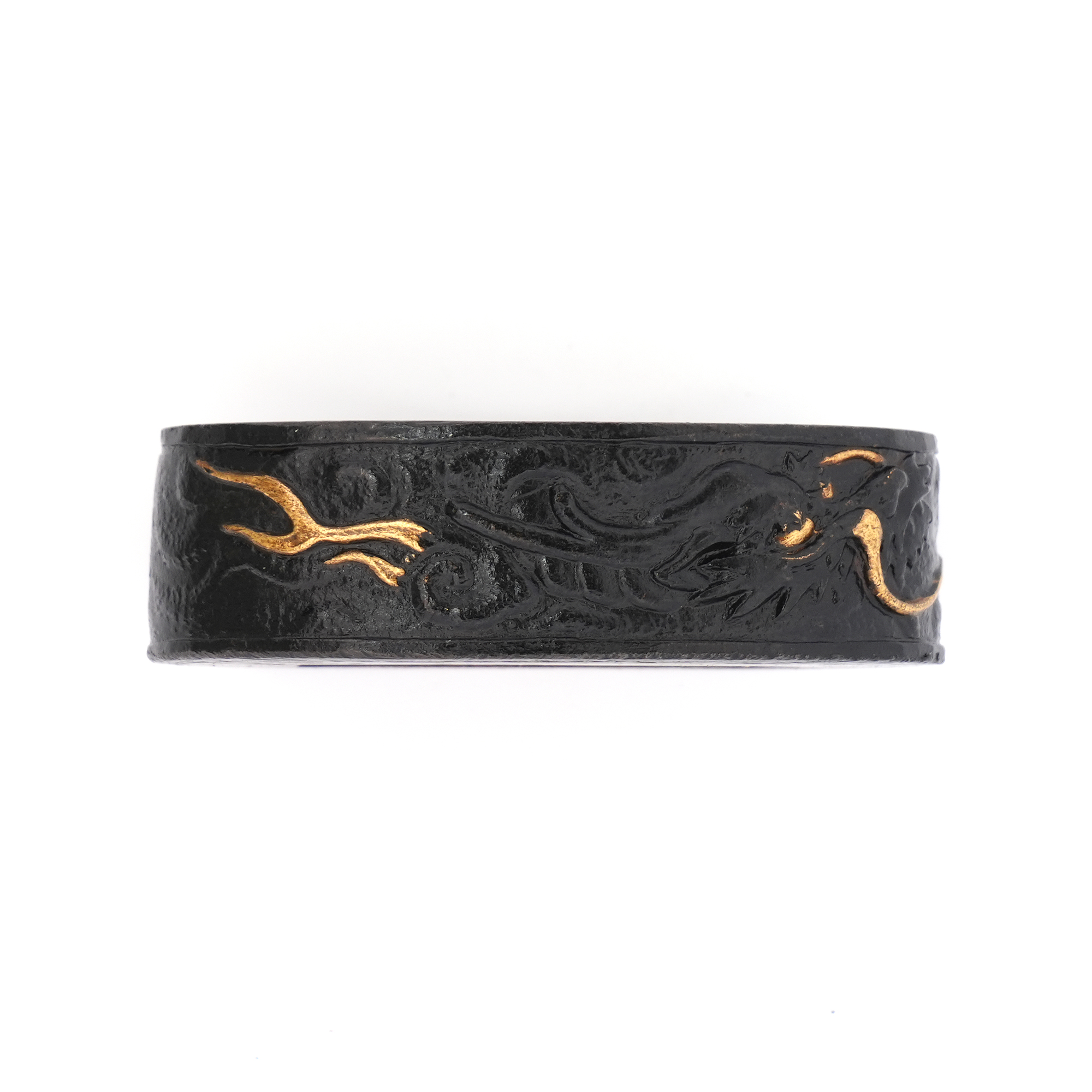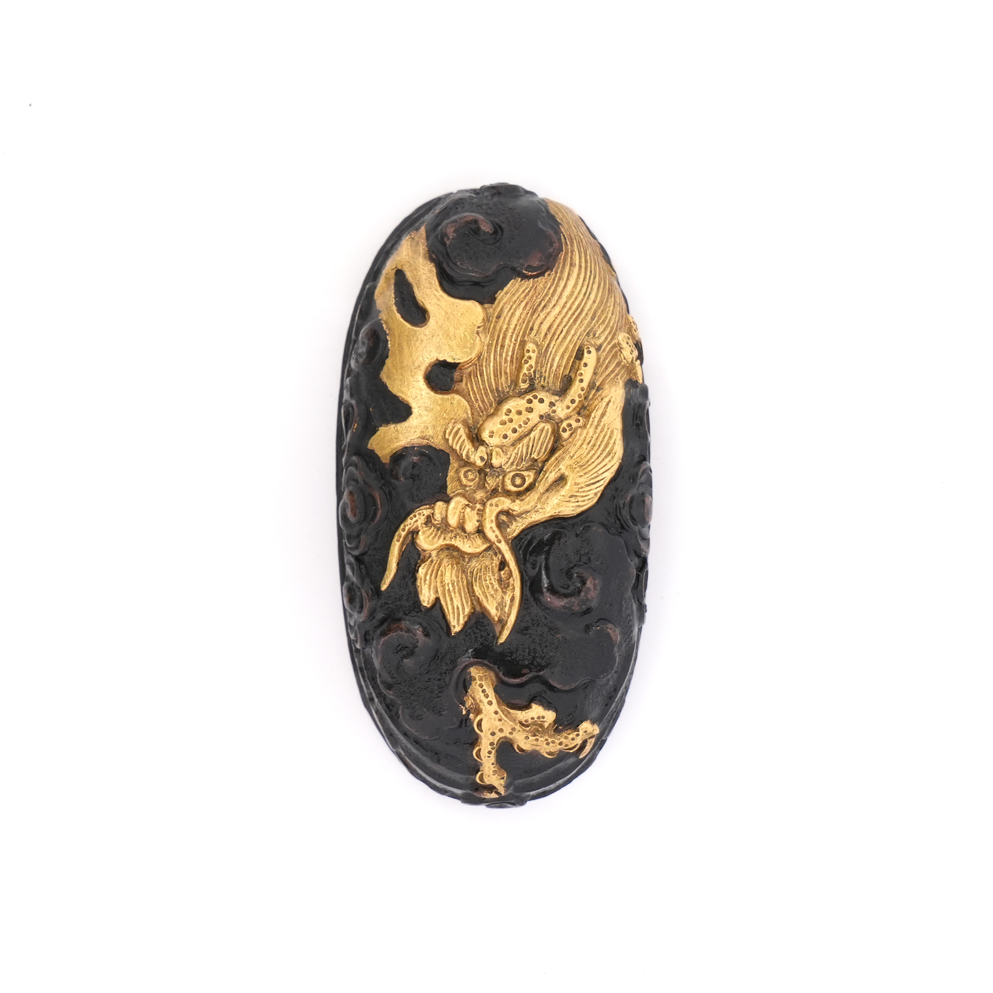 40.8ミリと大振りな縁頭で、雲龍を主題に力強く彫り表した一作です。量感ある造りのため、身幅の広い刀の拵にも無理なく用いることができ、拵全体を引き締める存在感を備えています。