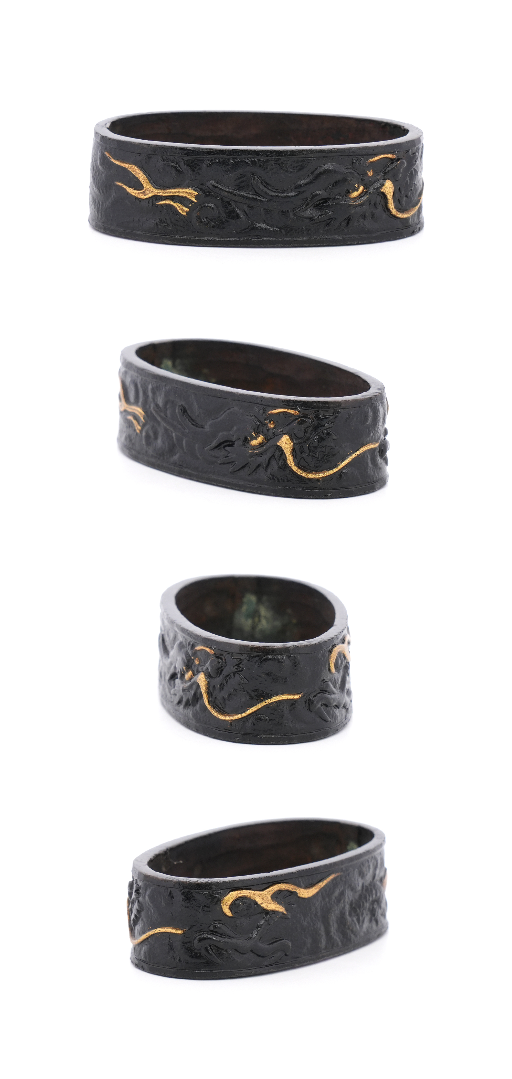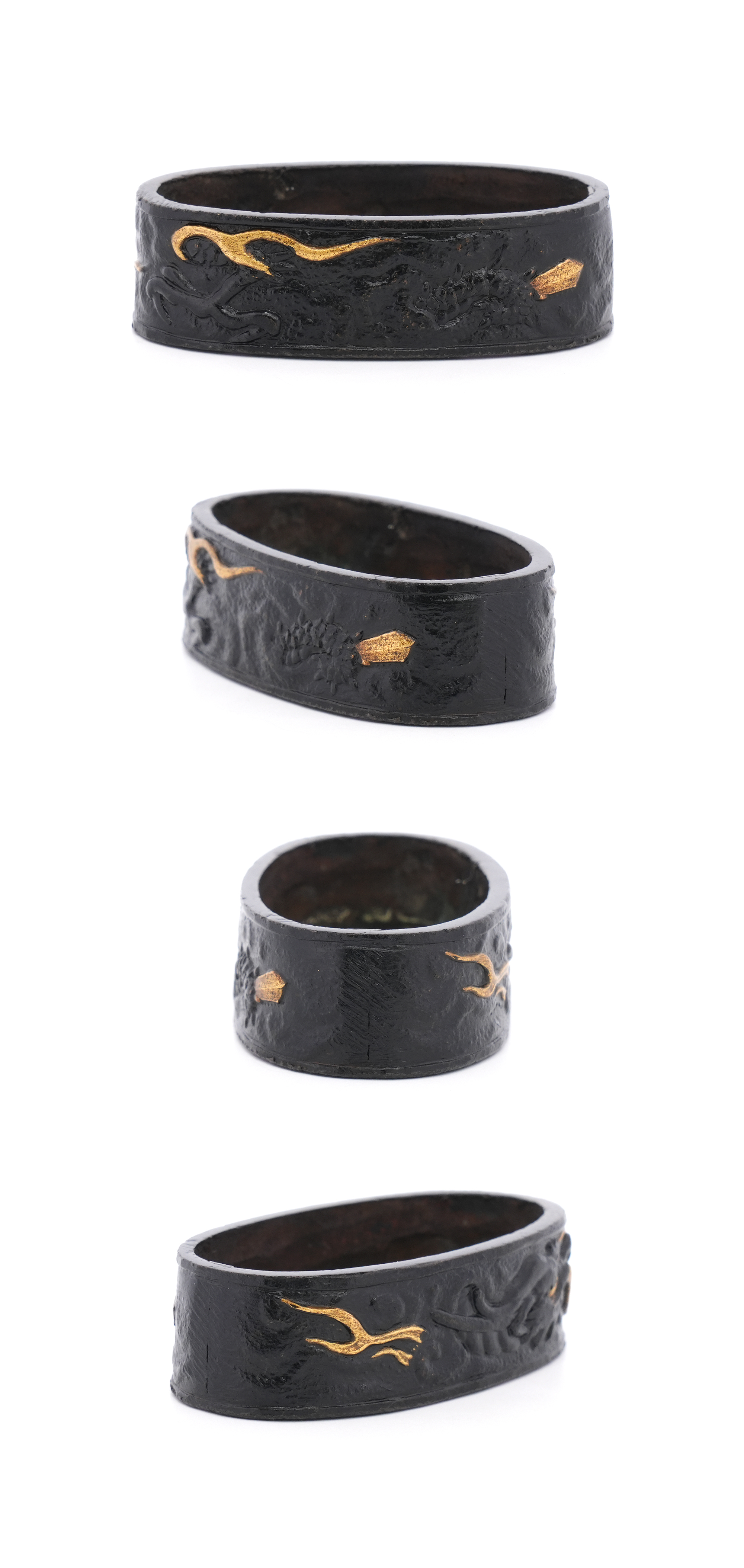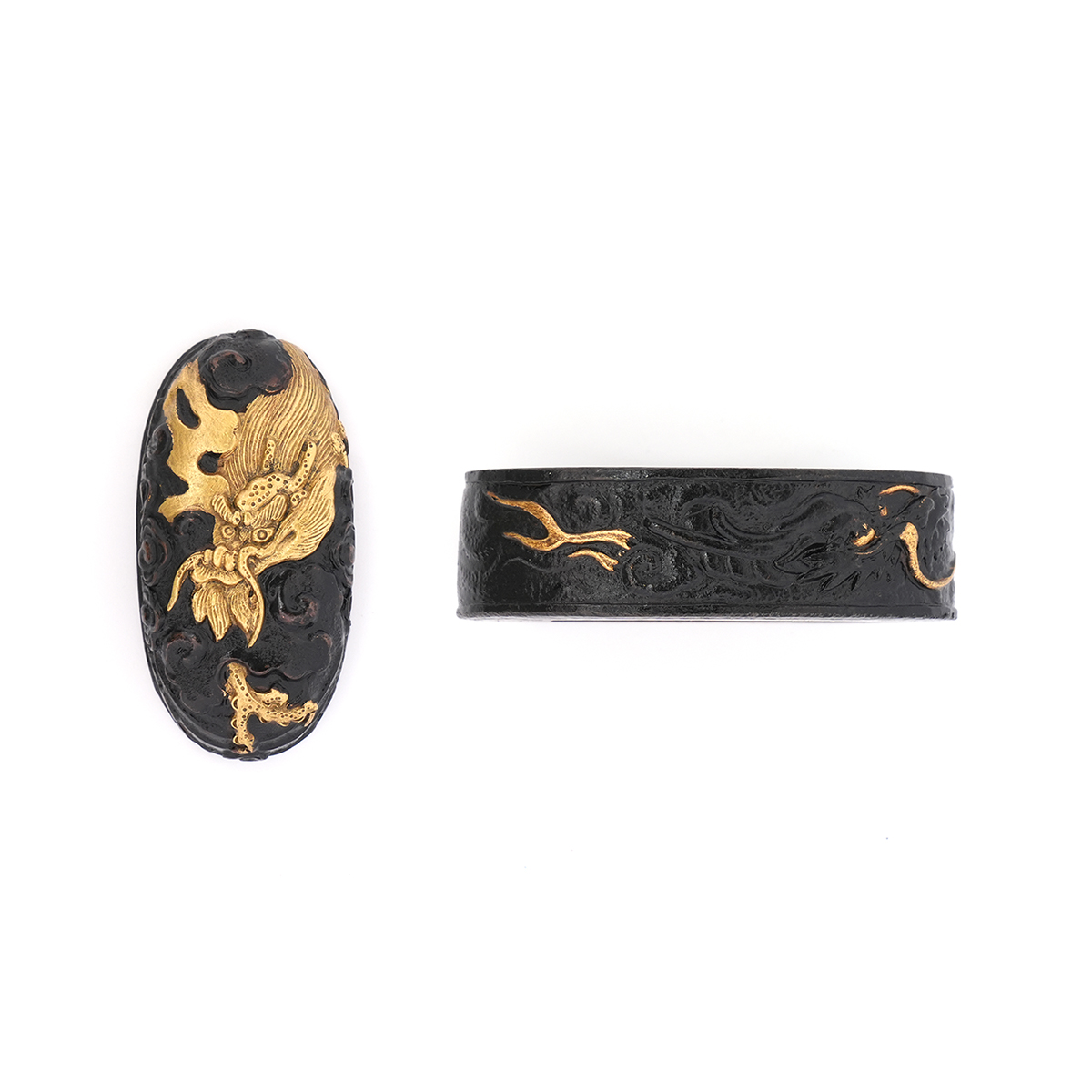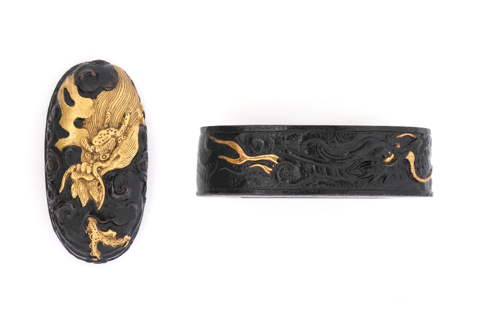 40.8ミリと大振りな縁頭で、雲龍を主題に力強く彫り表した一作です。量感ある造りのため、身幅の広い刀の拵にも無理なく用いることができ、拵全体を引き締める存在感を備えています。