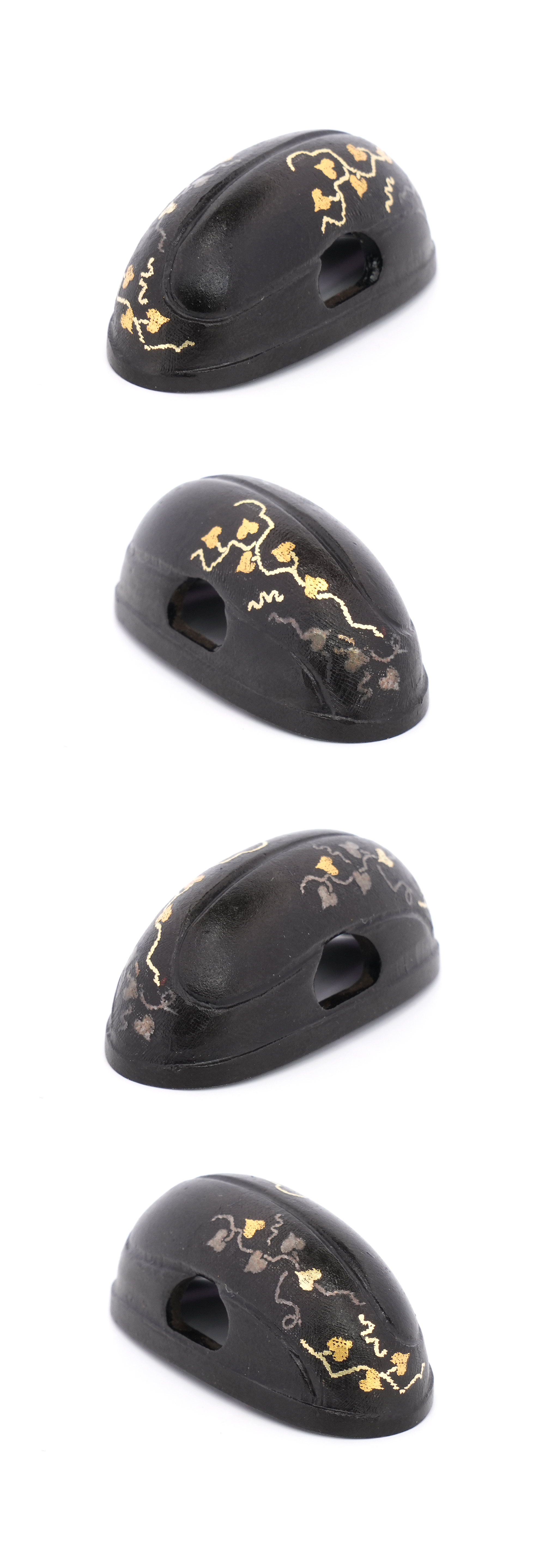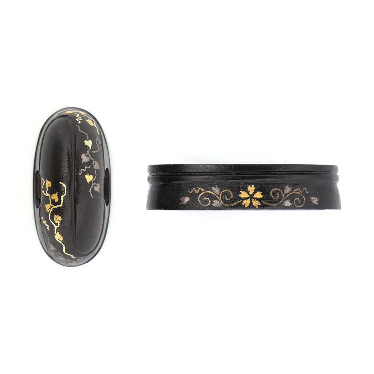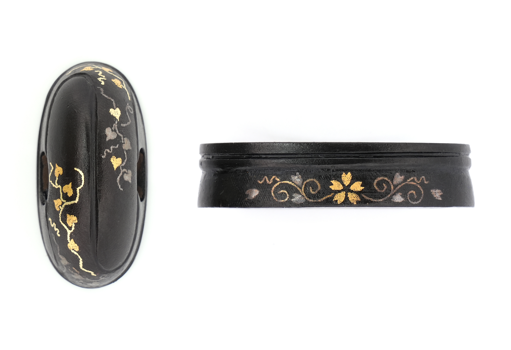 鉄地に桜花と唐草文様を配し、金銀の布目象嵌によって華やかに仕上げられた縁頭です。鋳造による居合刀用の大量生産品ではなく、現代金工が手造りで仕上げたもので、寸法は41.8ミリとかなりの大振りですから、身幅の非常に広い刀の拵にも無理なく用いることができ、重厚な拵を志向する方に特におすすめできる一作です。