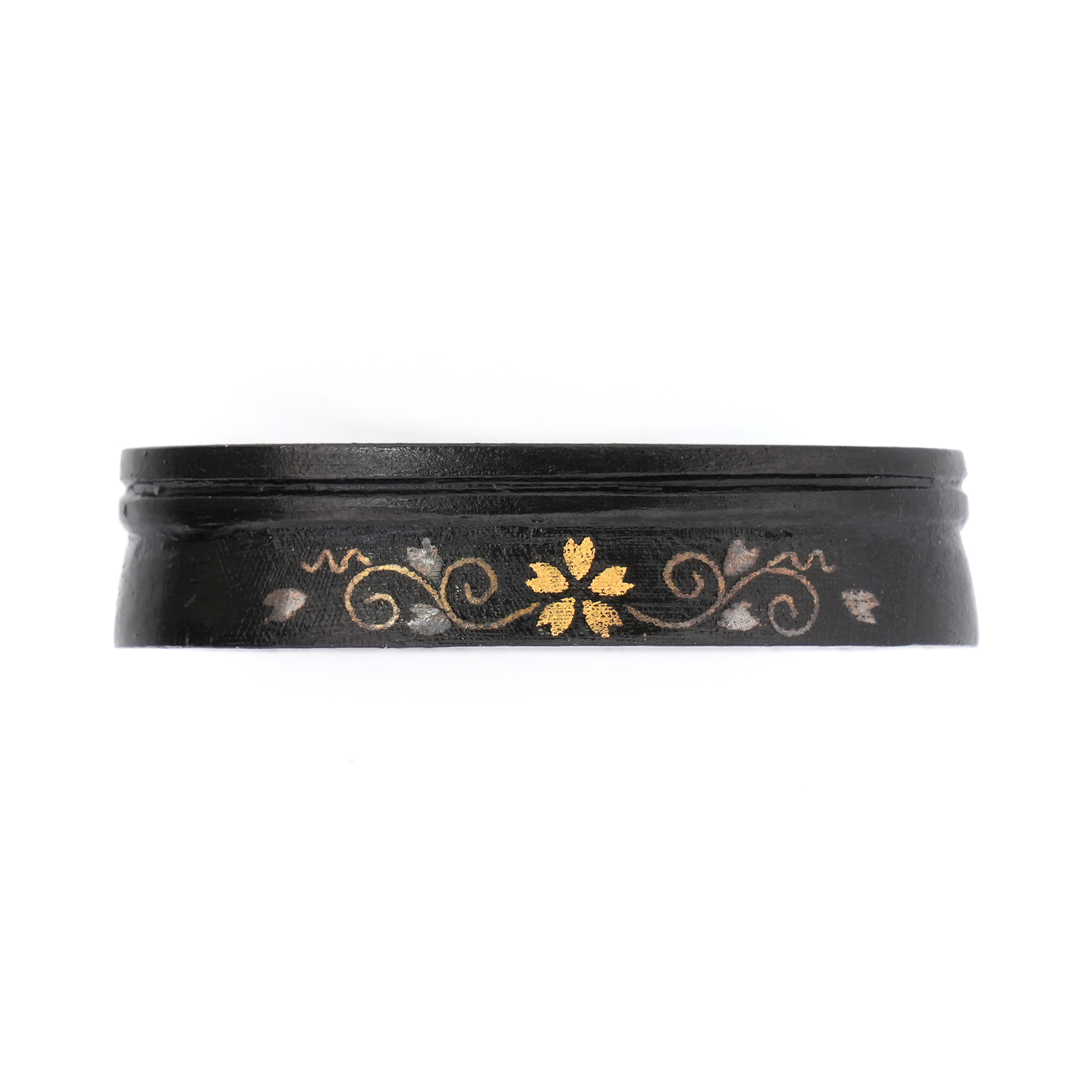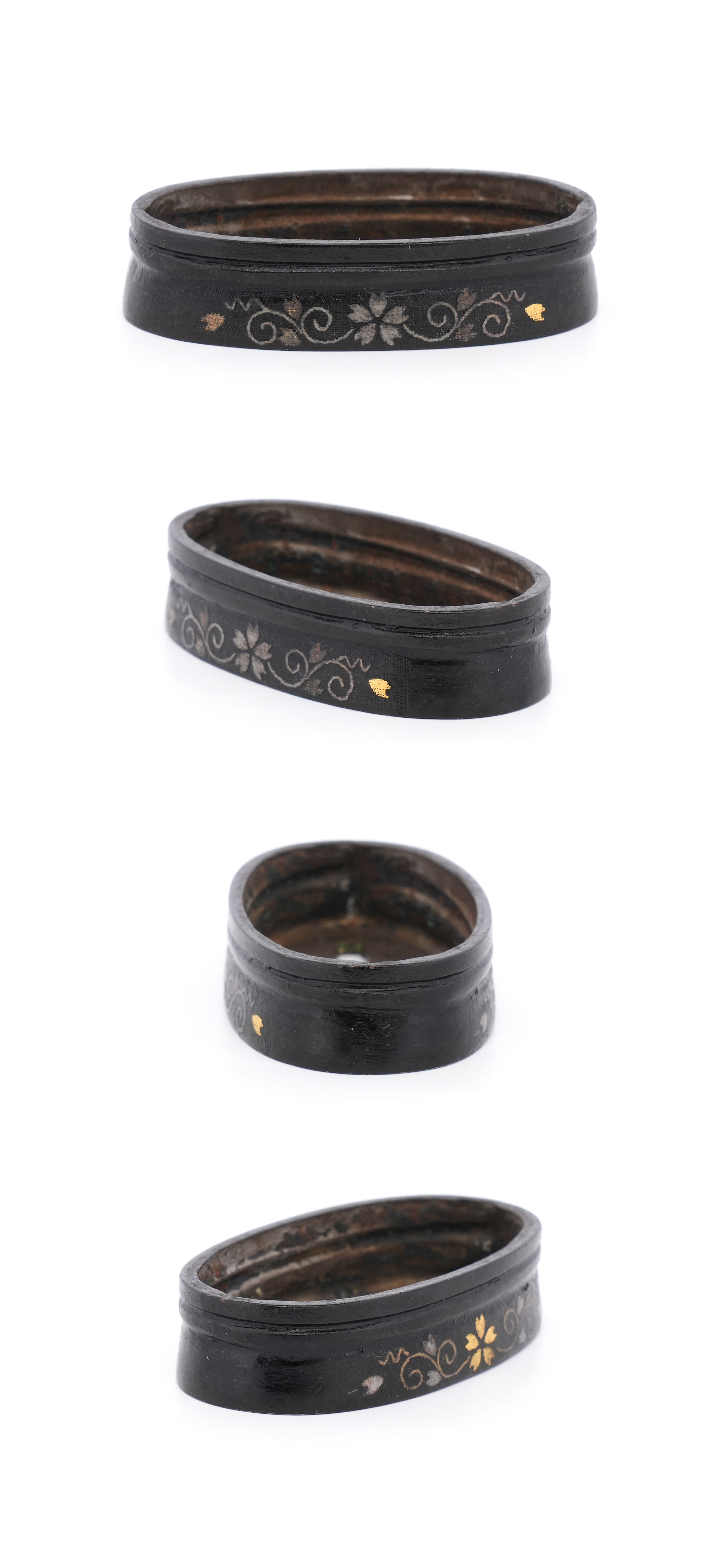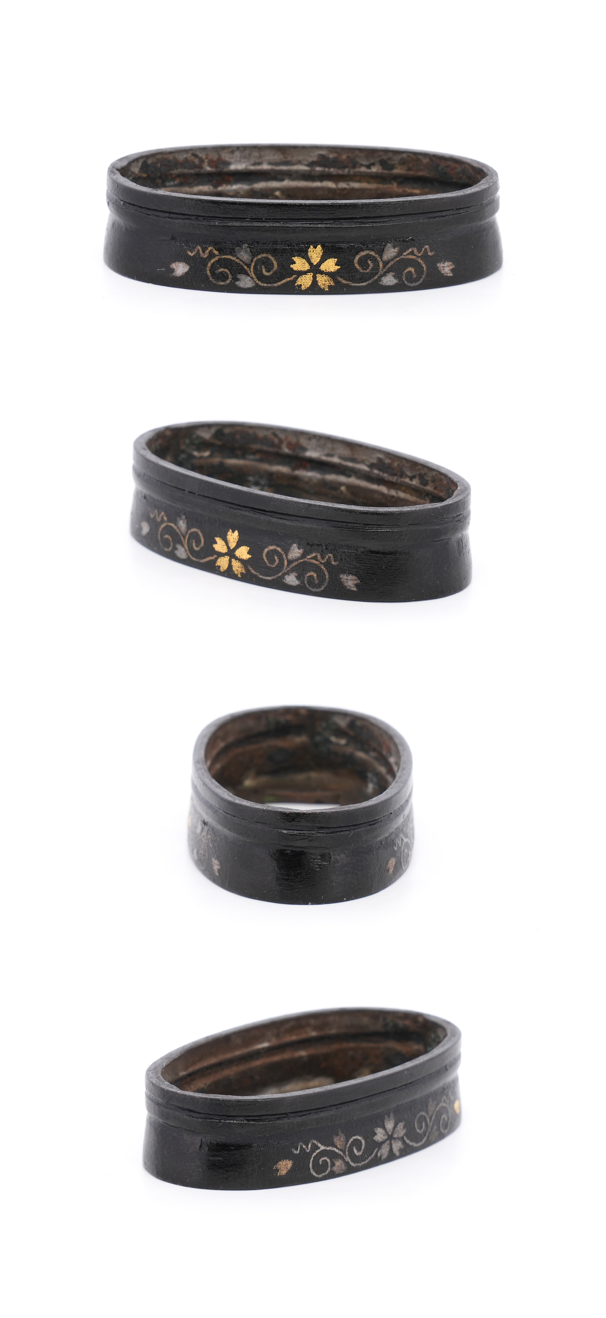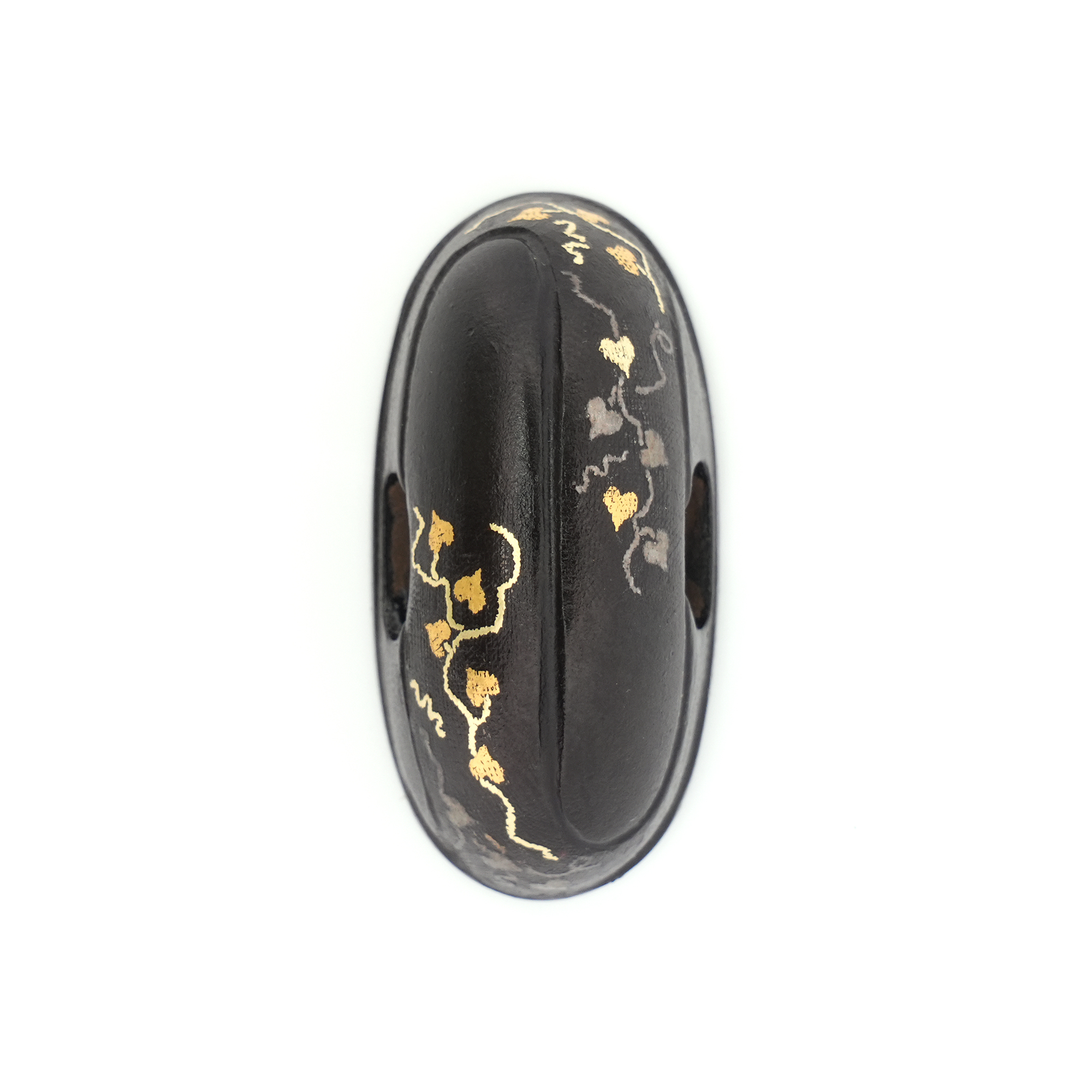 鉄地に桜花と唐草文様を配し、金銀の布目象嵌によって華やかに仕上げられた縁頭です。鋳造による居合刀用の大量生産品ではなく、現代金工が手造りで仕上げたもので、寸法は41.8ミリとかなりの大振りですから、身幅の非常に広い刀の拵にも無理なく用いることができ、重厚な拵を志向する方に特におすすめできる一作です。