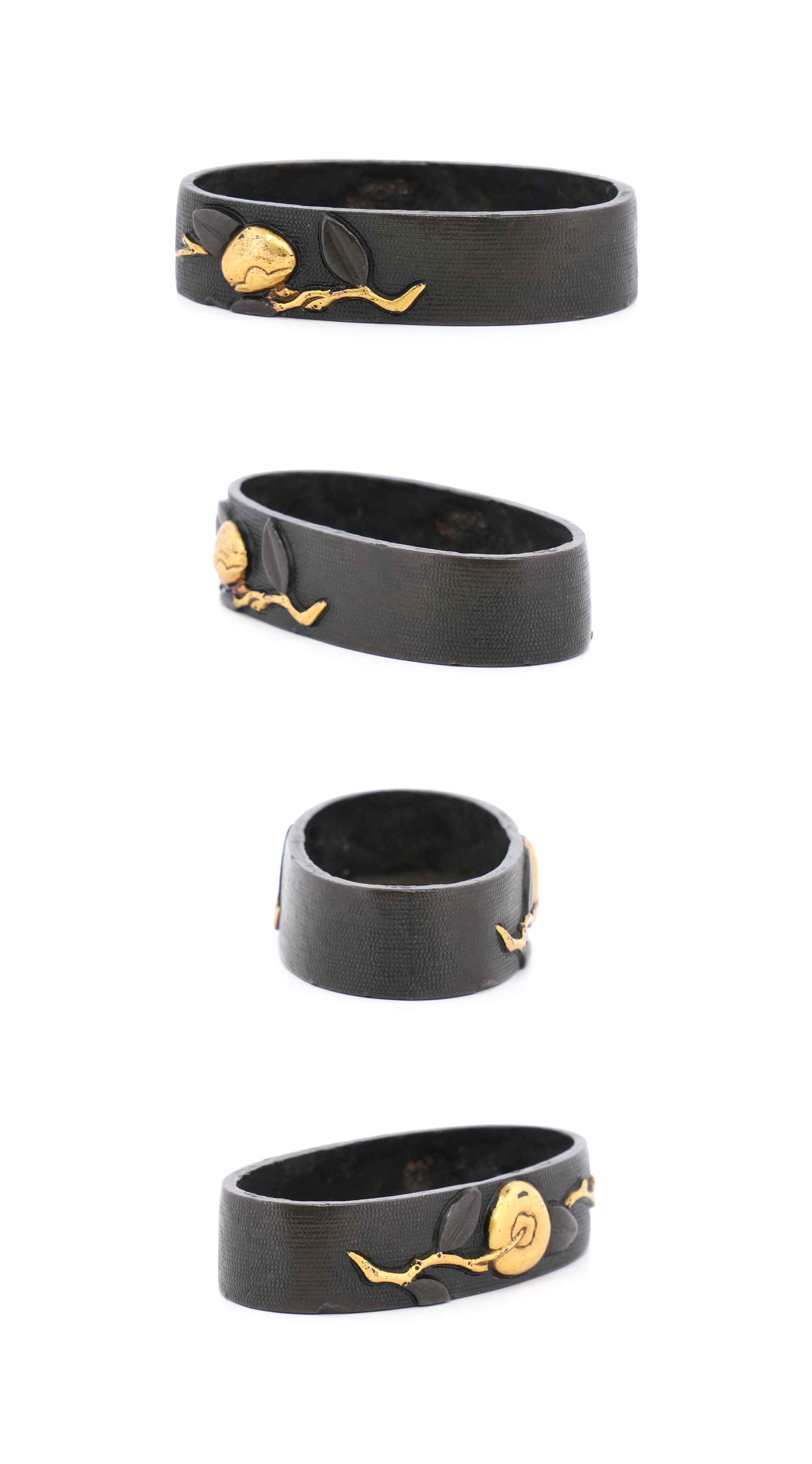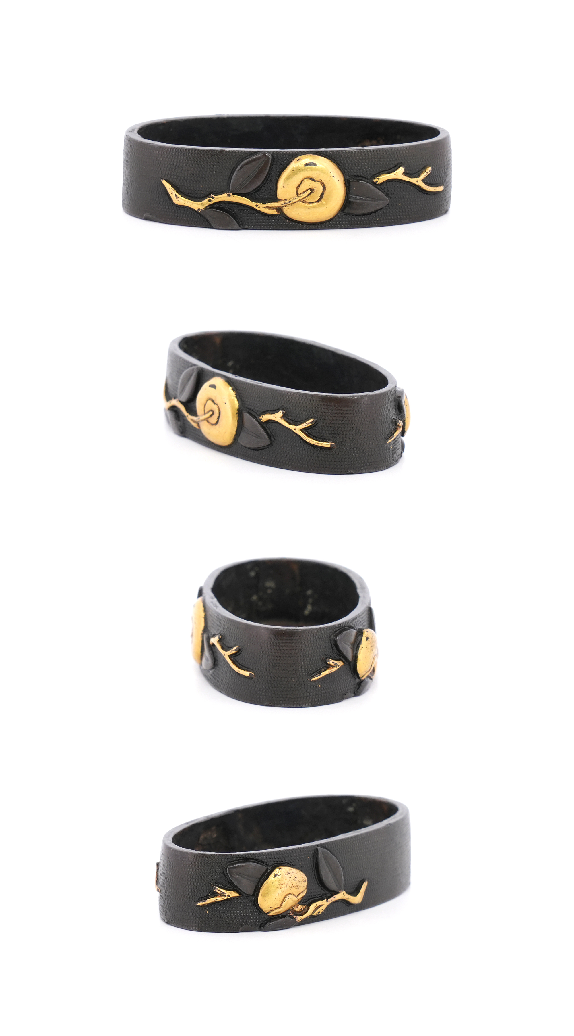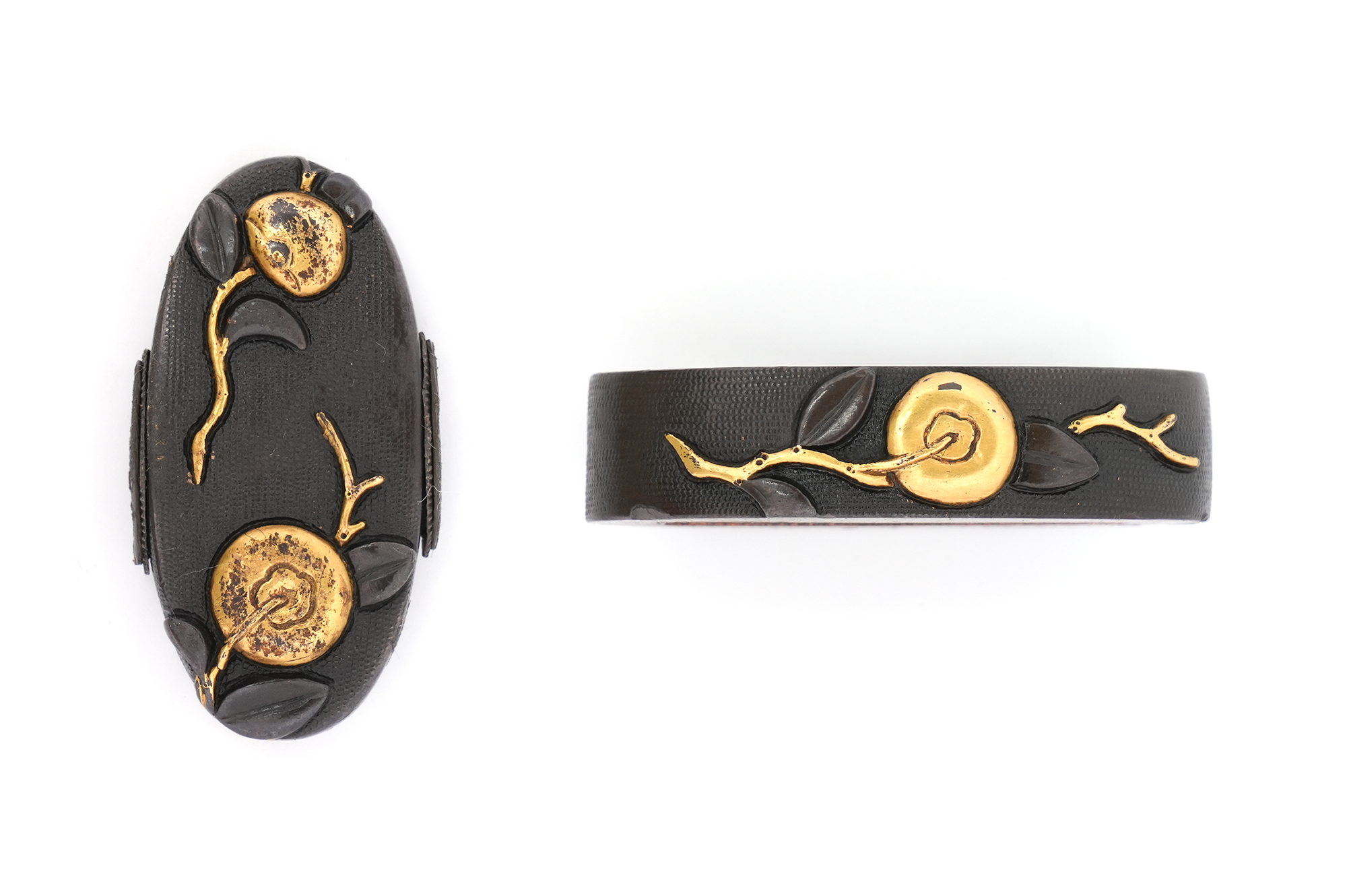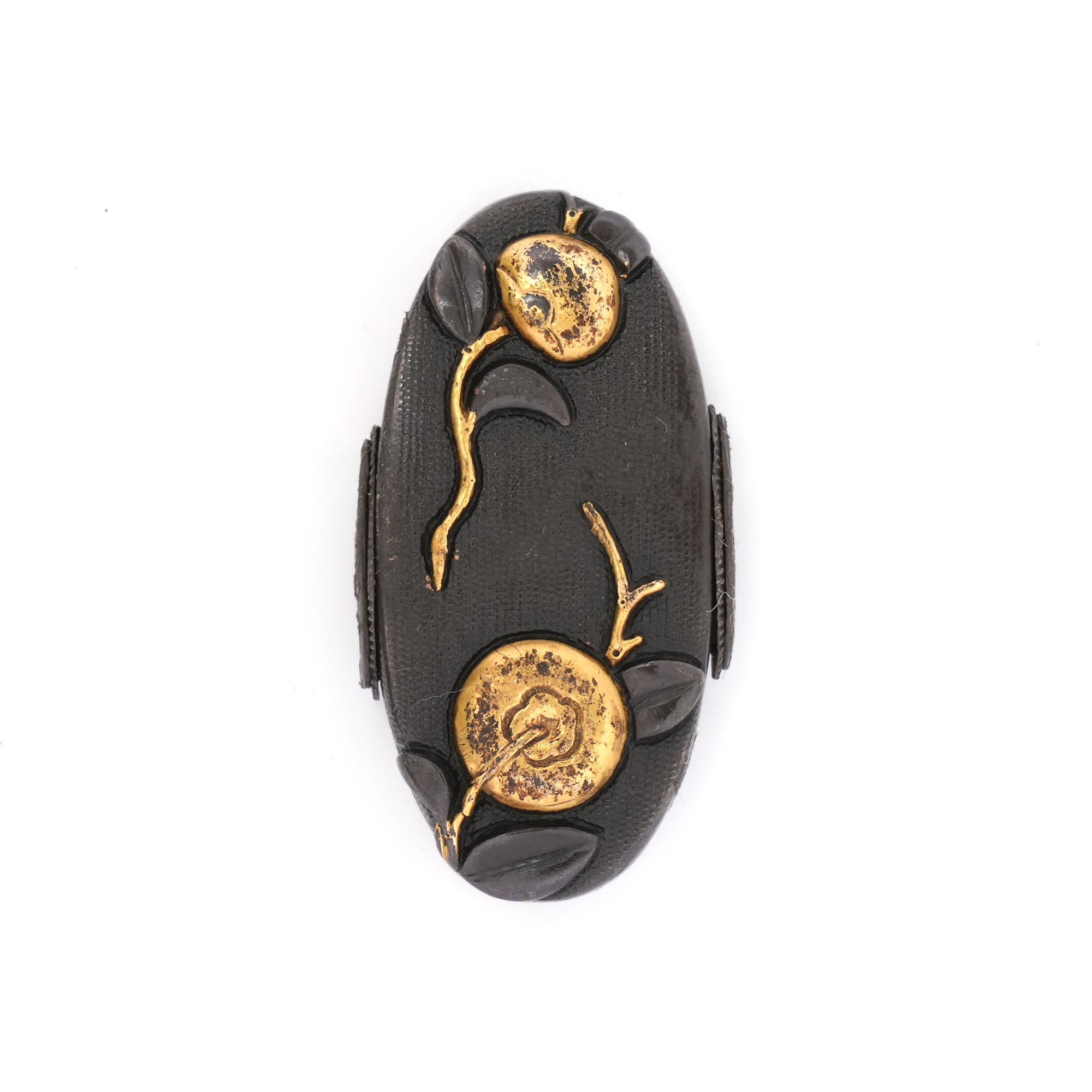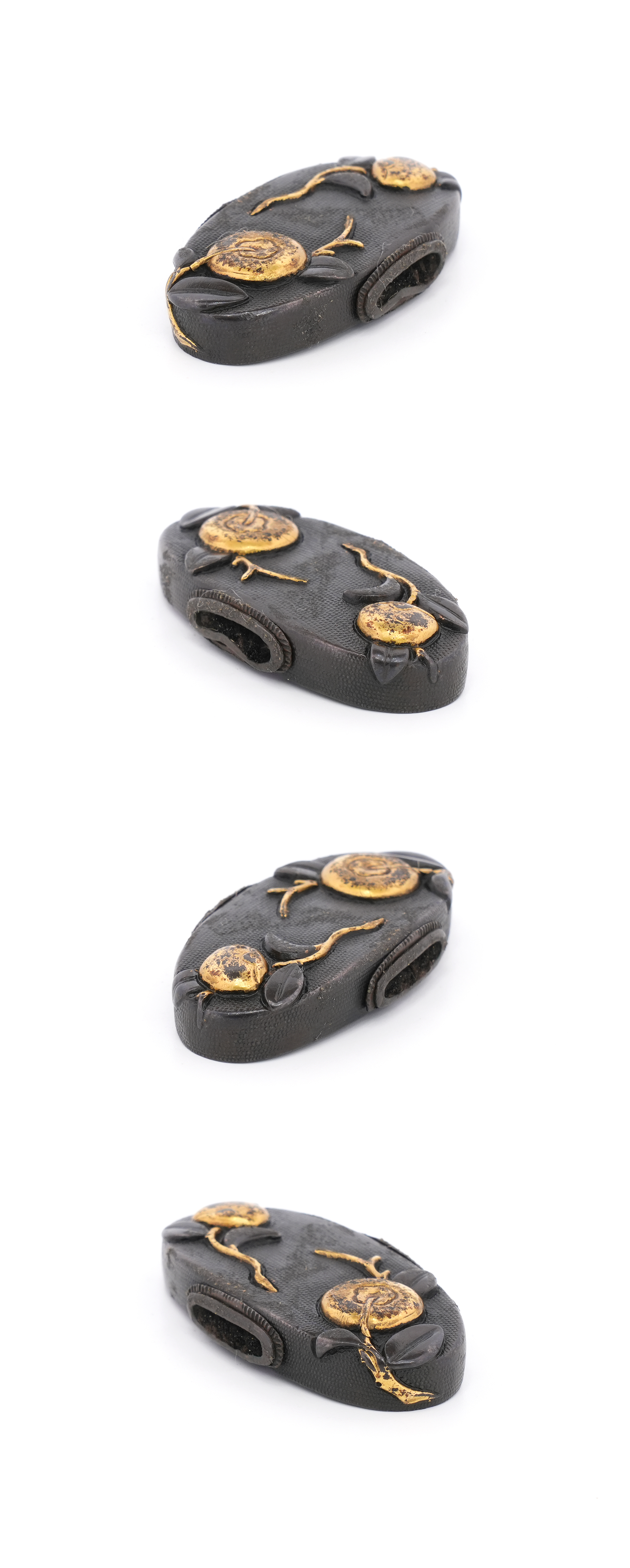 赤銅地に細やかな魚子を打ち、たわわに実った柿を大胆に彫り上げた作品です。ぎっしりと詰まった実の量感と、枝ぶりの力強さが印象的で、簡潔な構成ながら季節感と豊かな実りを端的に表しています。赤銅の落ち着いた地色に柿の意匠がよく映え、拵の中で確かな存在感を放つ一作です。