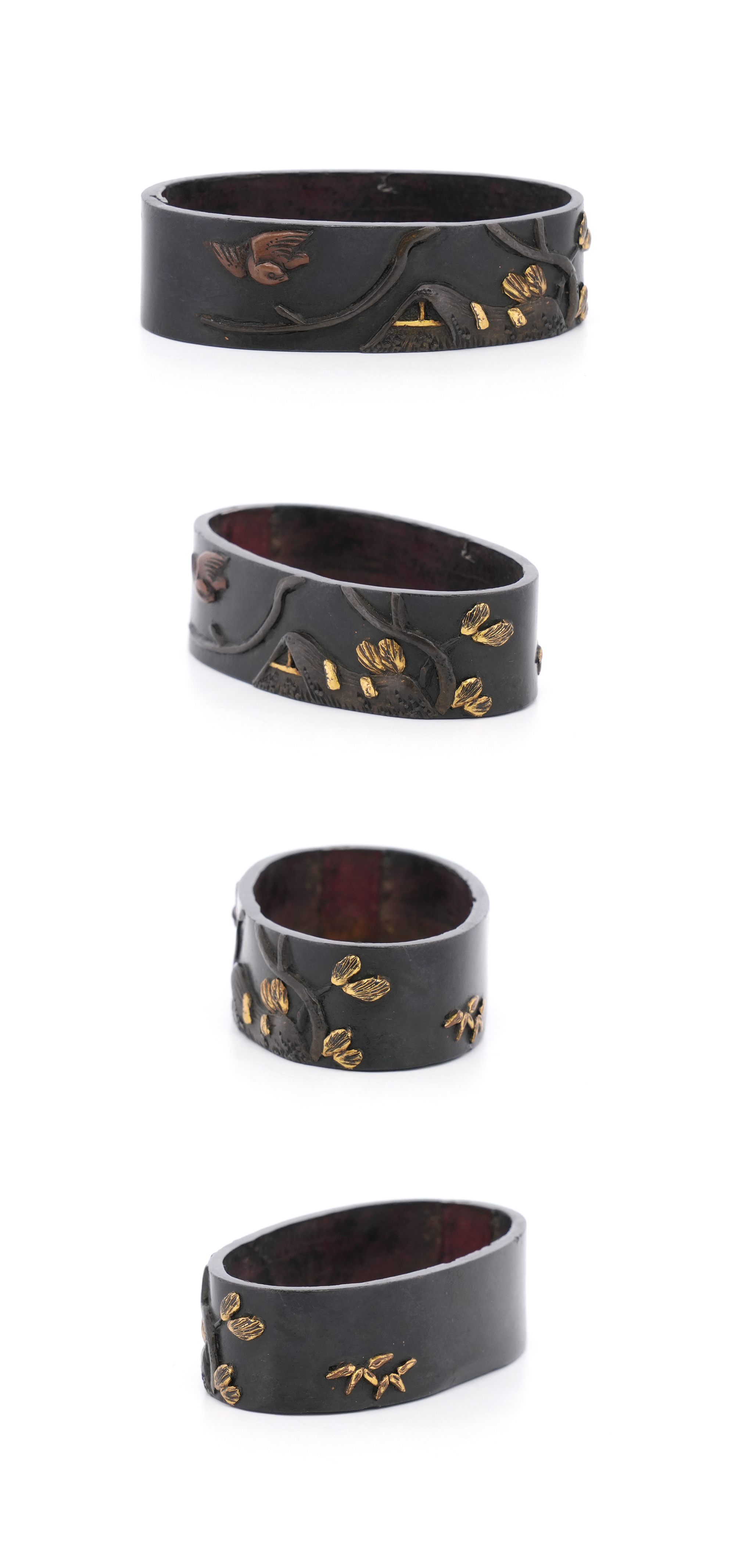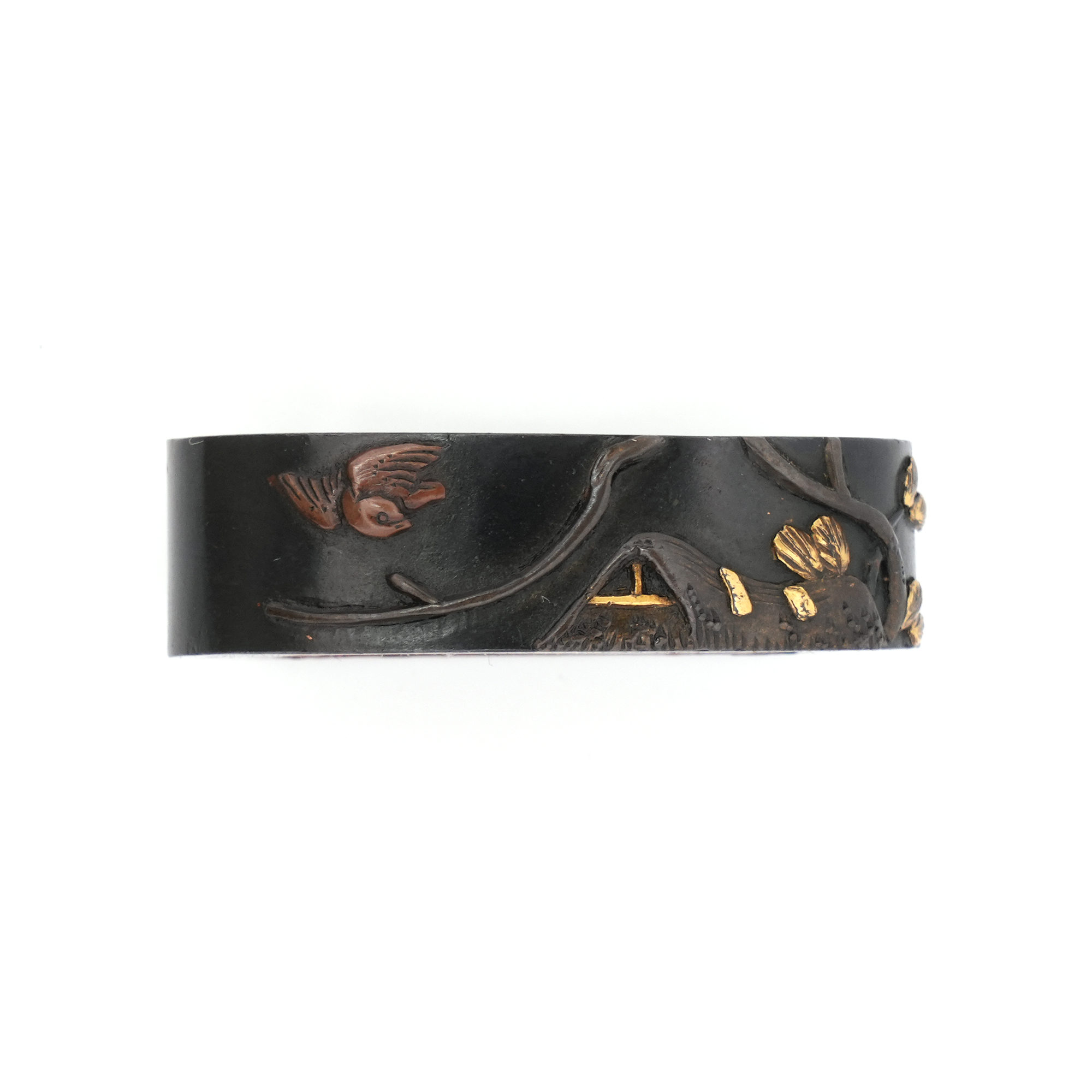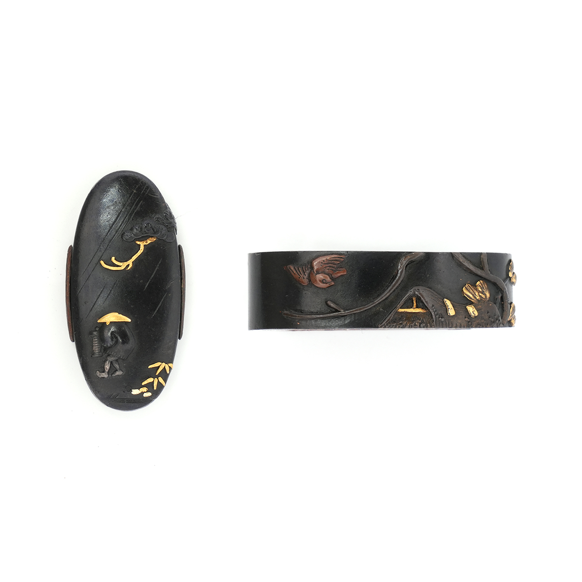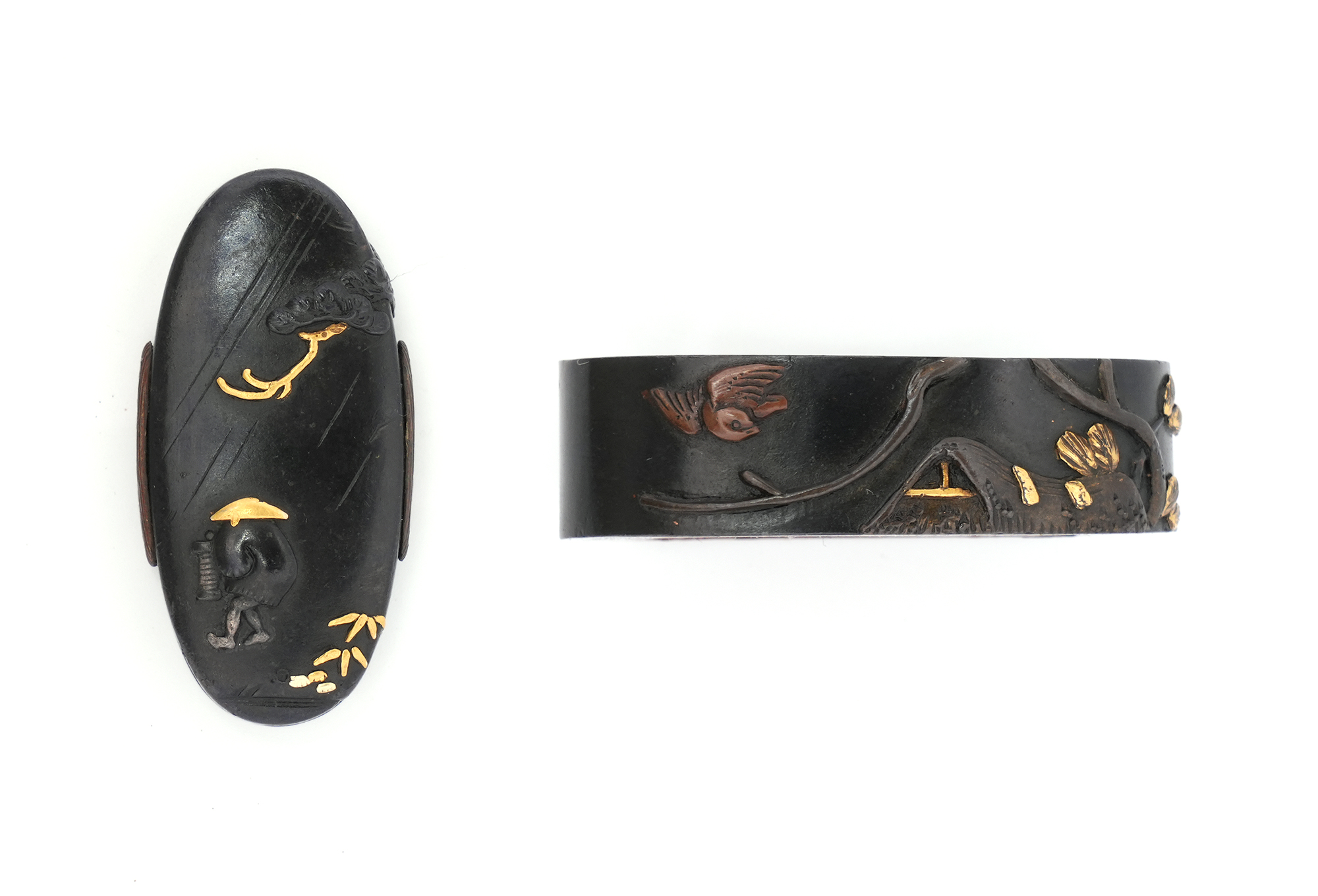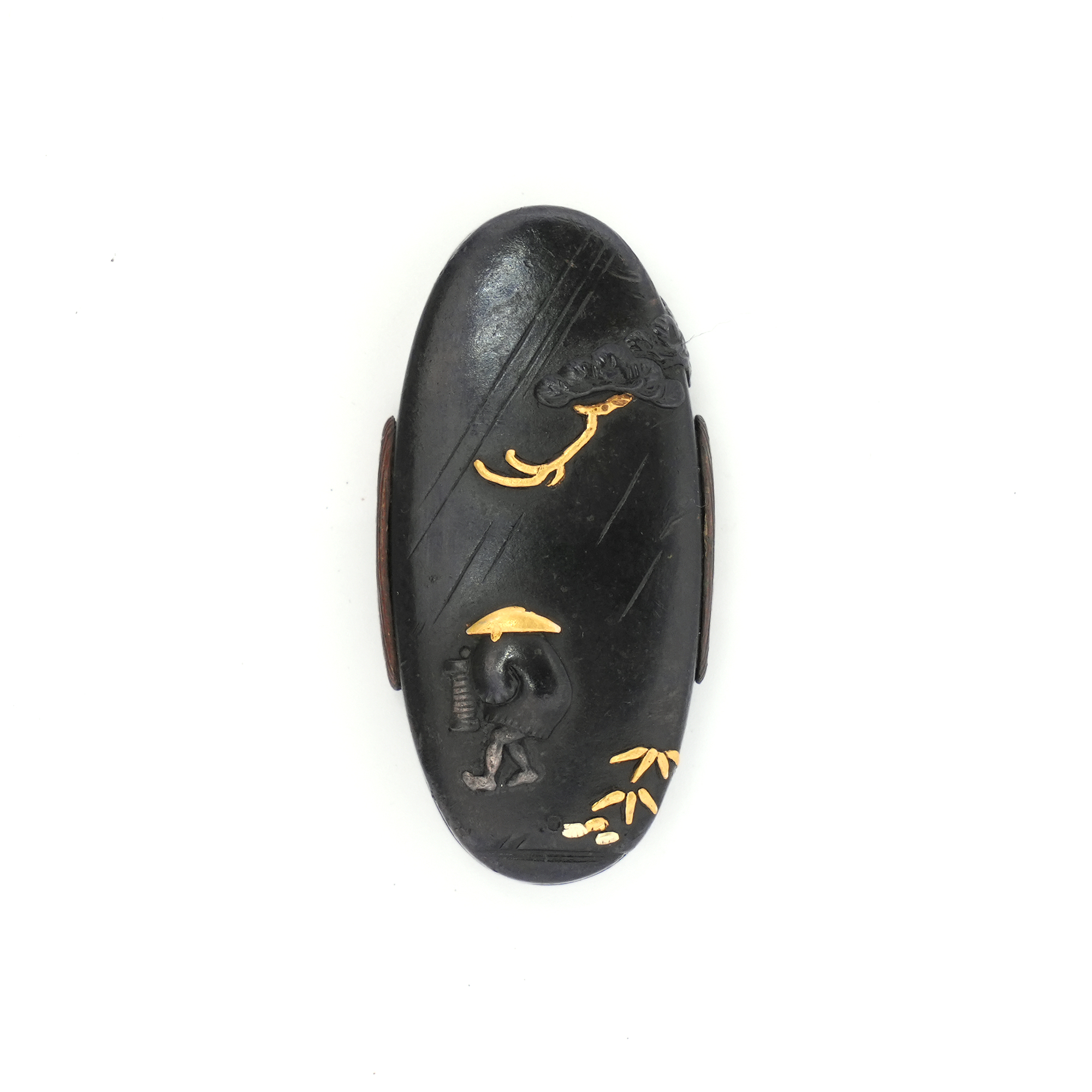 赤銅磨地の落ち着いた地鉄に、風情ある情景を彫り表した縁頭です。