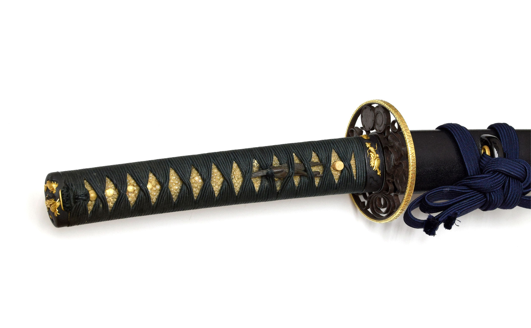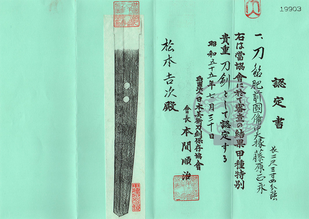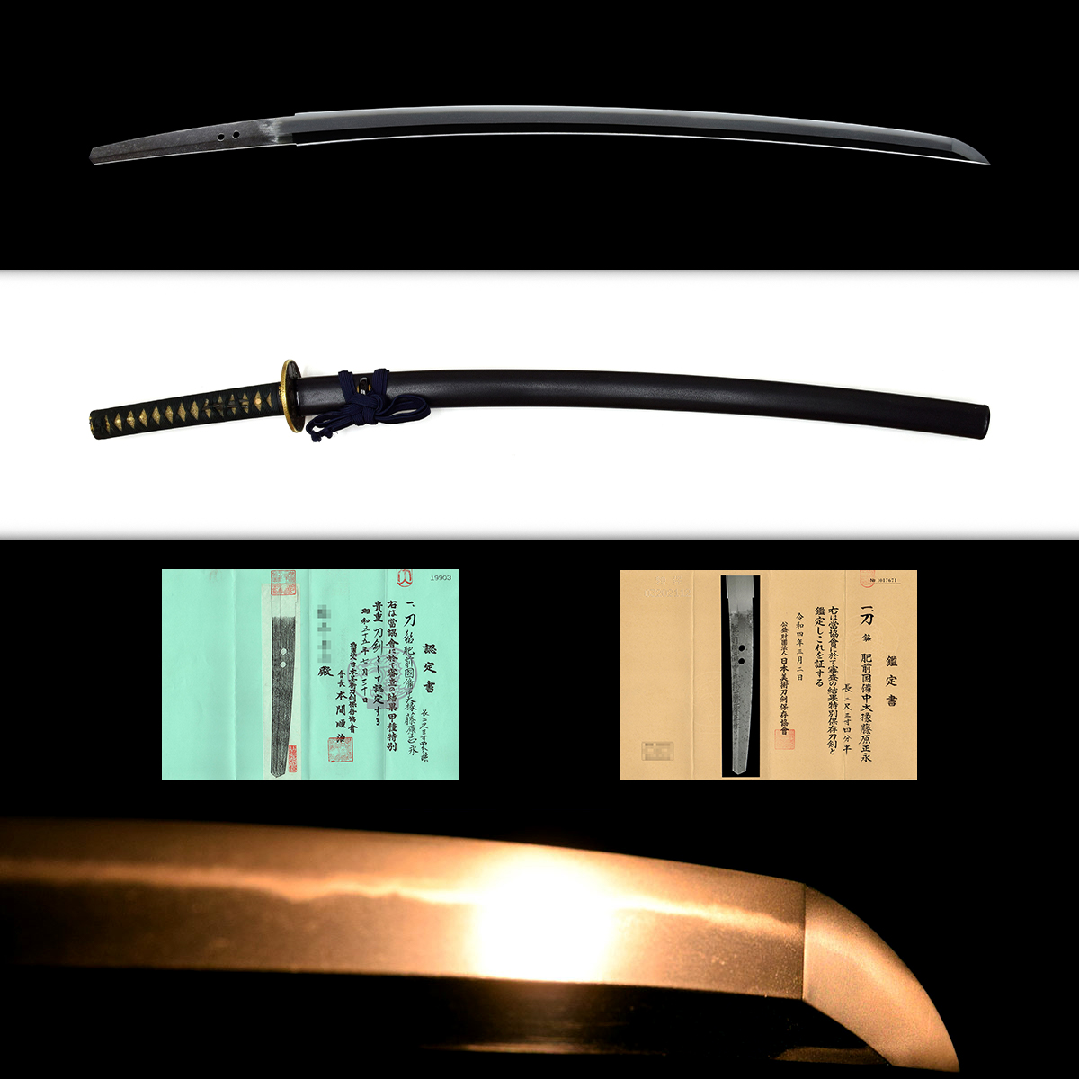 附属 特別保存刀剣鑑定書、甲種特別貴重刀剣認定書、宣徳地銀着はばき、黒石目塗鞘打刀拵、白鞘、継木