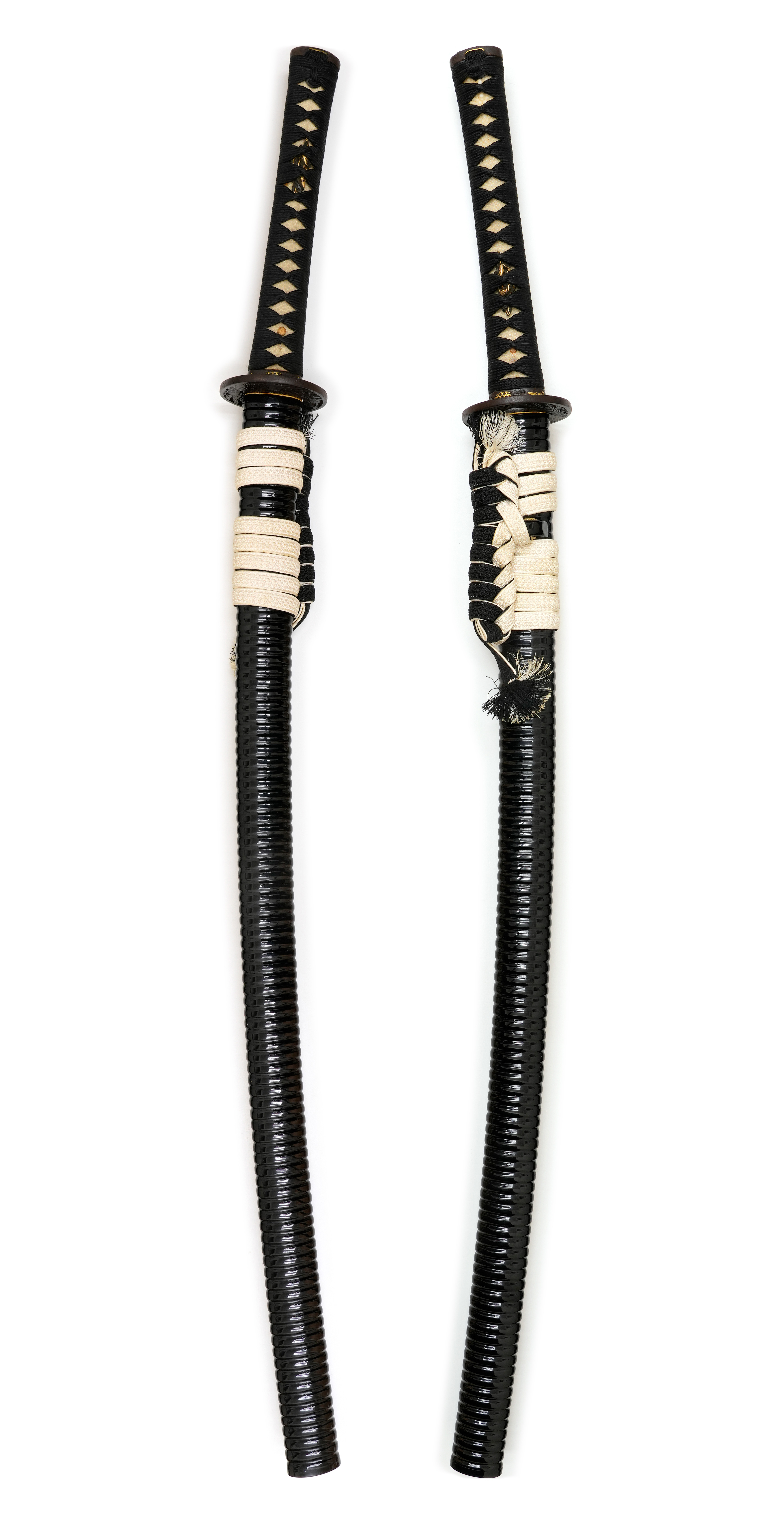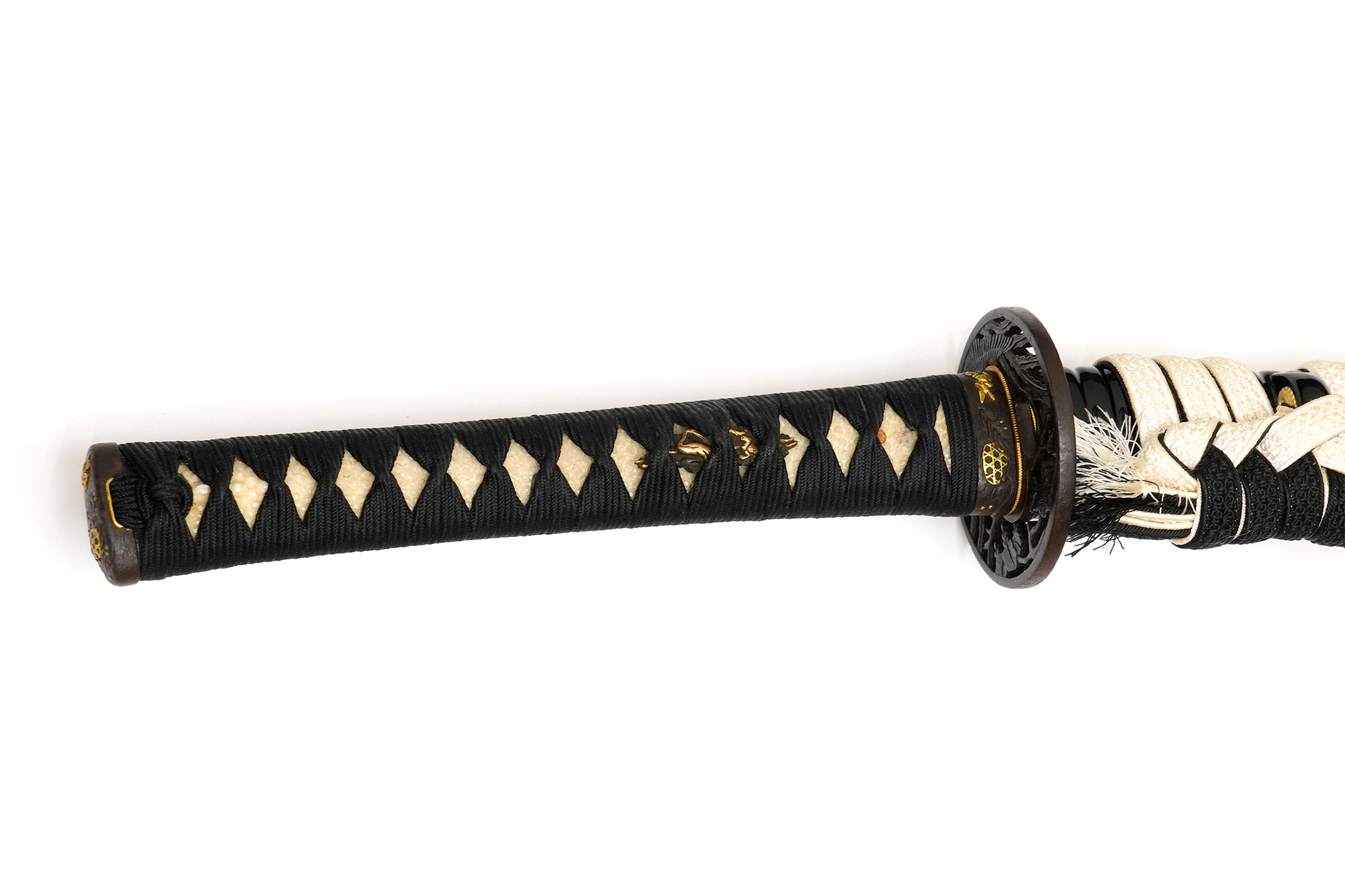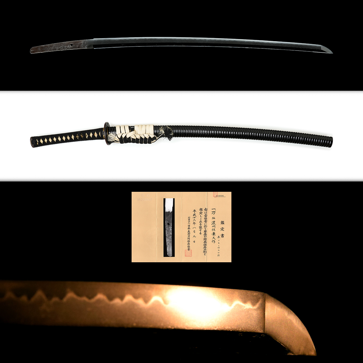 附属 保存刀剣鑑定書、素銅地金鍍金はばき、黒蝋塗鞘打刀拵、白鞘 / 継木