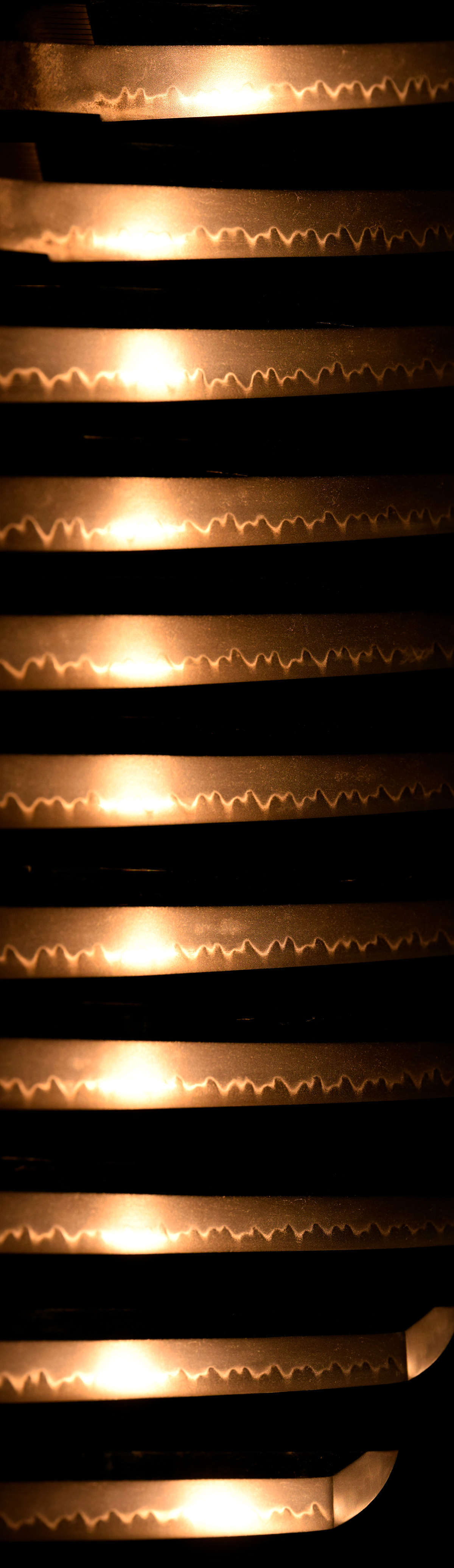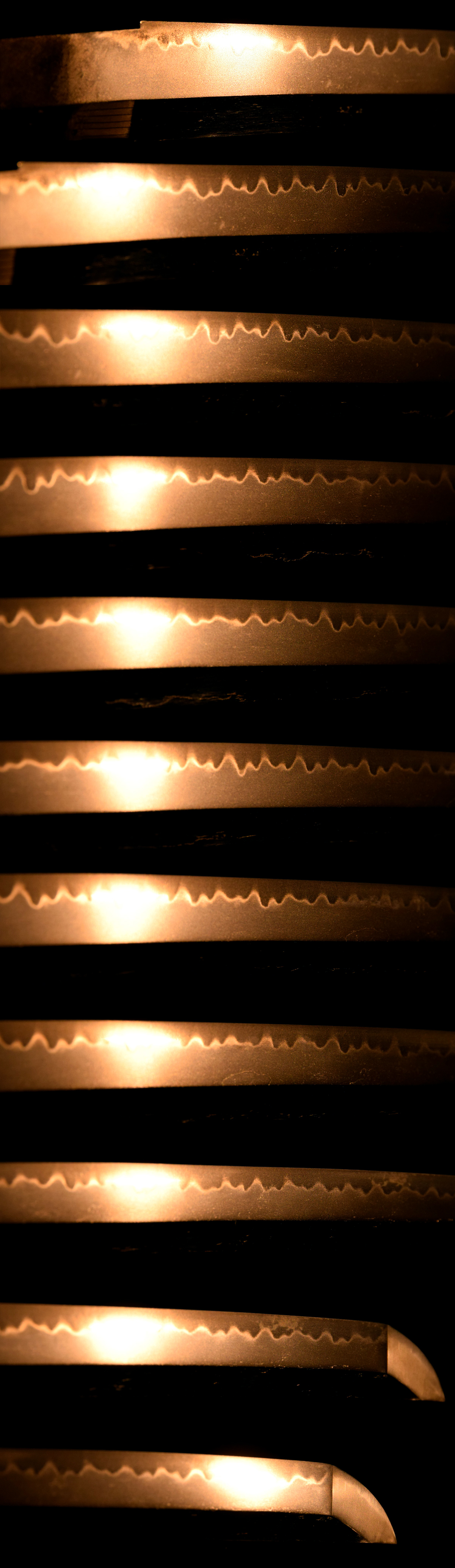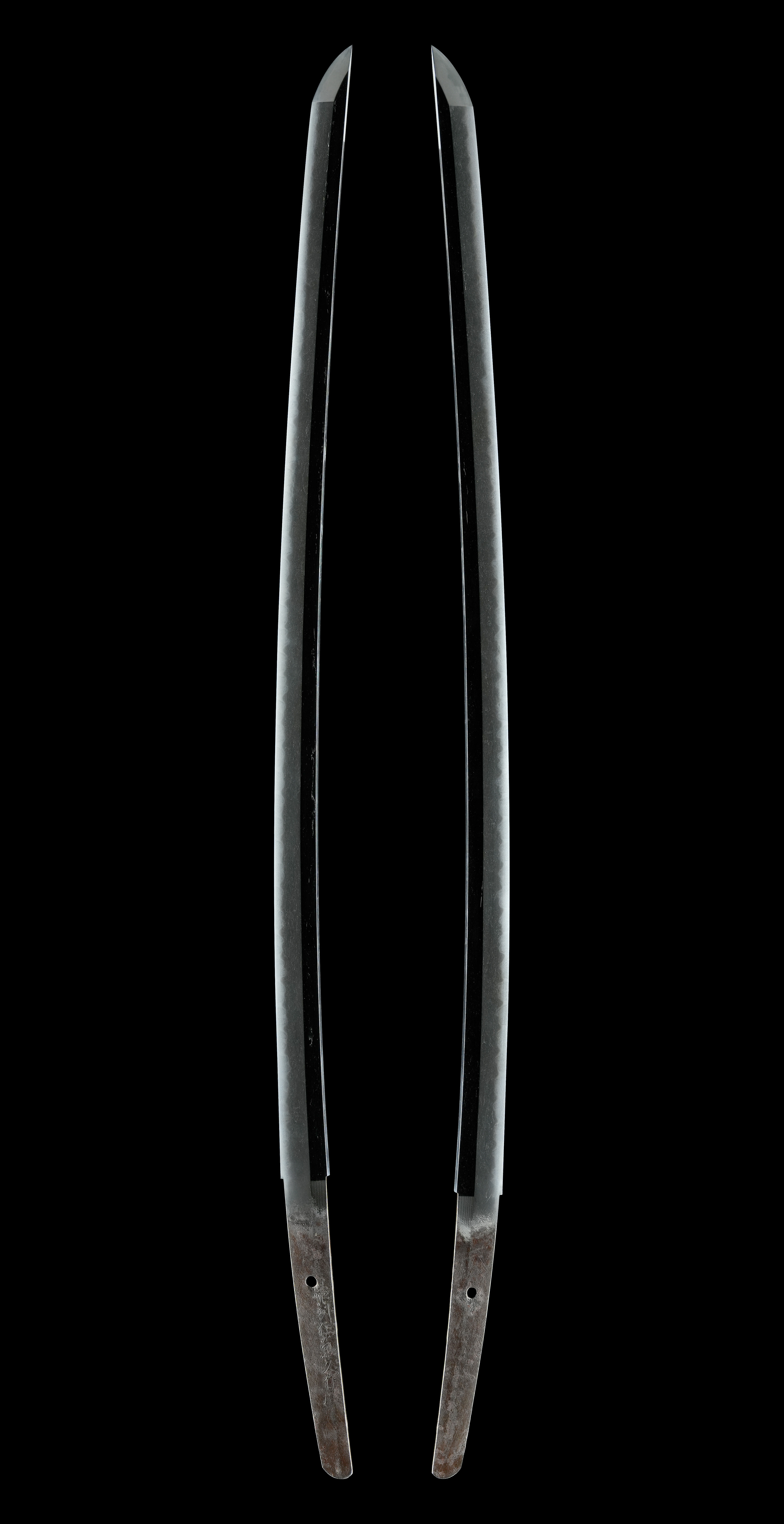 元先の幅差は目立って開かず、切先はやや延びごころ。区から上は総体的に反りを浅目としながらも、茎に反りを付けた体配を見せており、室町後期における太刀と刀の併用期を如実に物語る、時代感に富んだ姿です。実戦性と様式美が交錯する過渡期ならではの趣が感じられます。