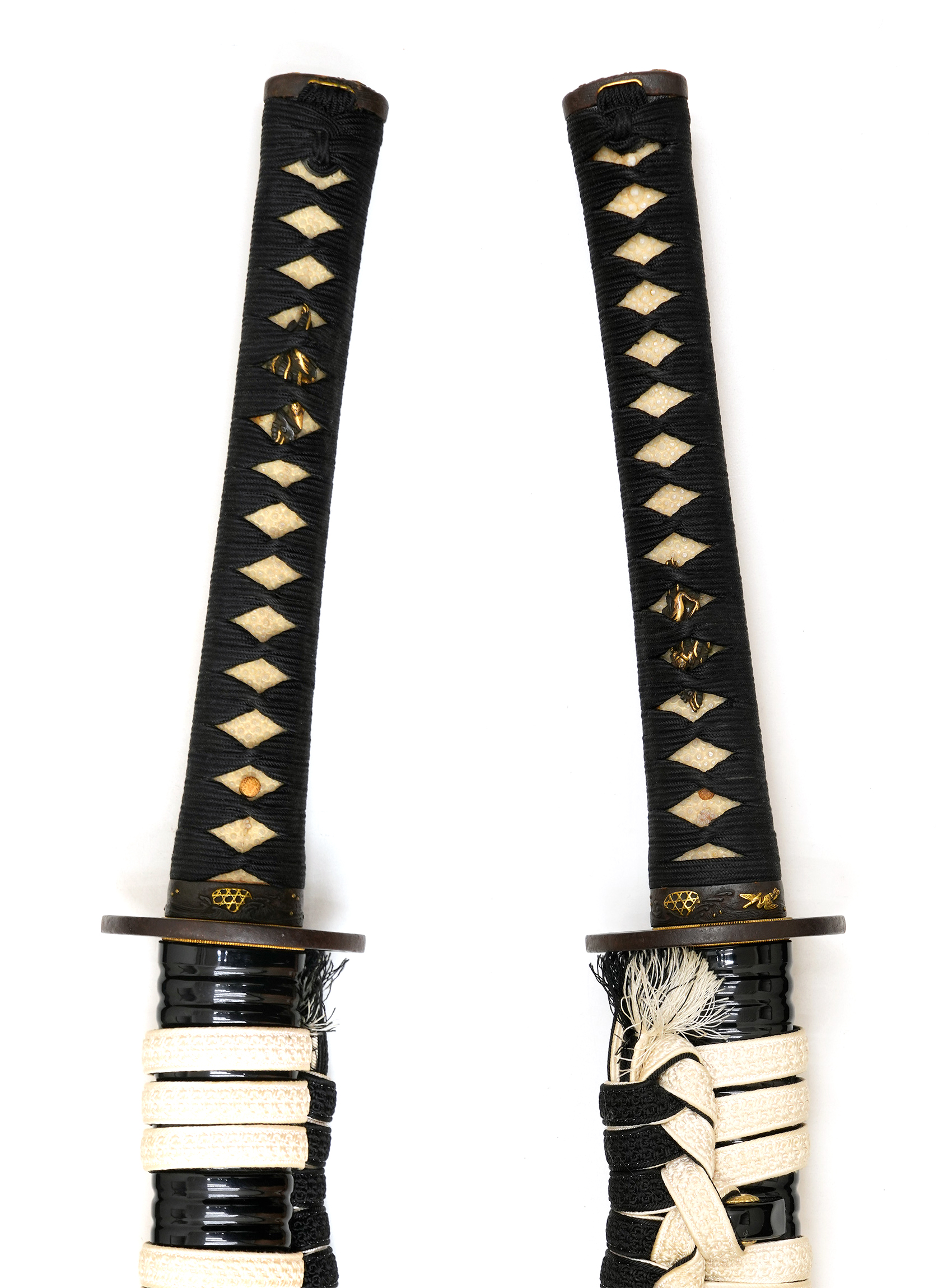地鉄は杢目が緻密に練れて詰み、地沸が良く付き、地景入りて精美。刃文は匂口明るく冴えた互ノ目乱れを基調とし、大小一組に瓢箪状を成して焼き上げられ、刃中には砂流しかかり、太く力強い足が盛んに入るなど、躍動感に富んだ景色を呈しています。鋩子は乱れ込み火炎がかった趣を見せ、先丸く返るなど、見どころに事欠きません。