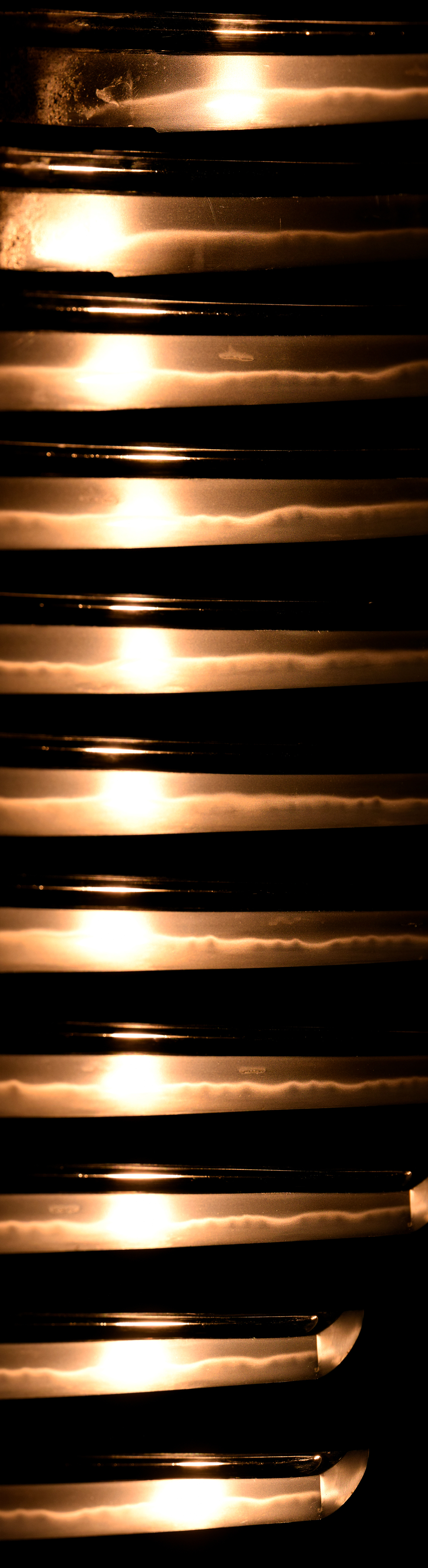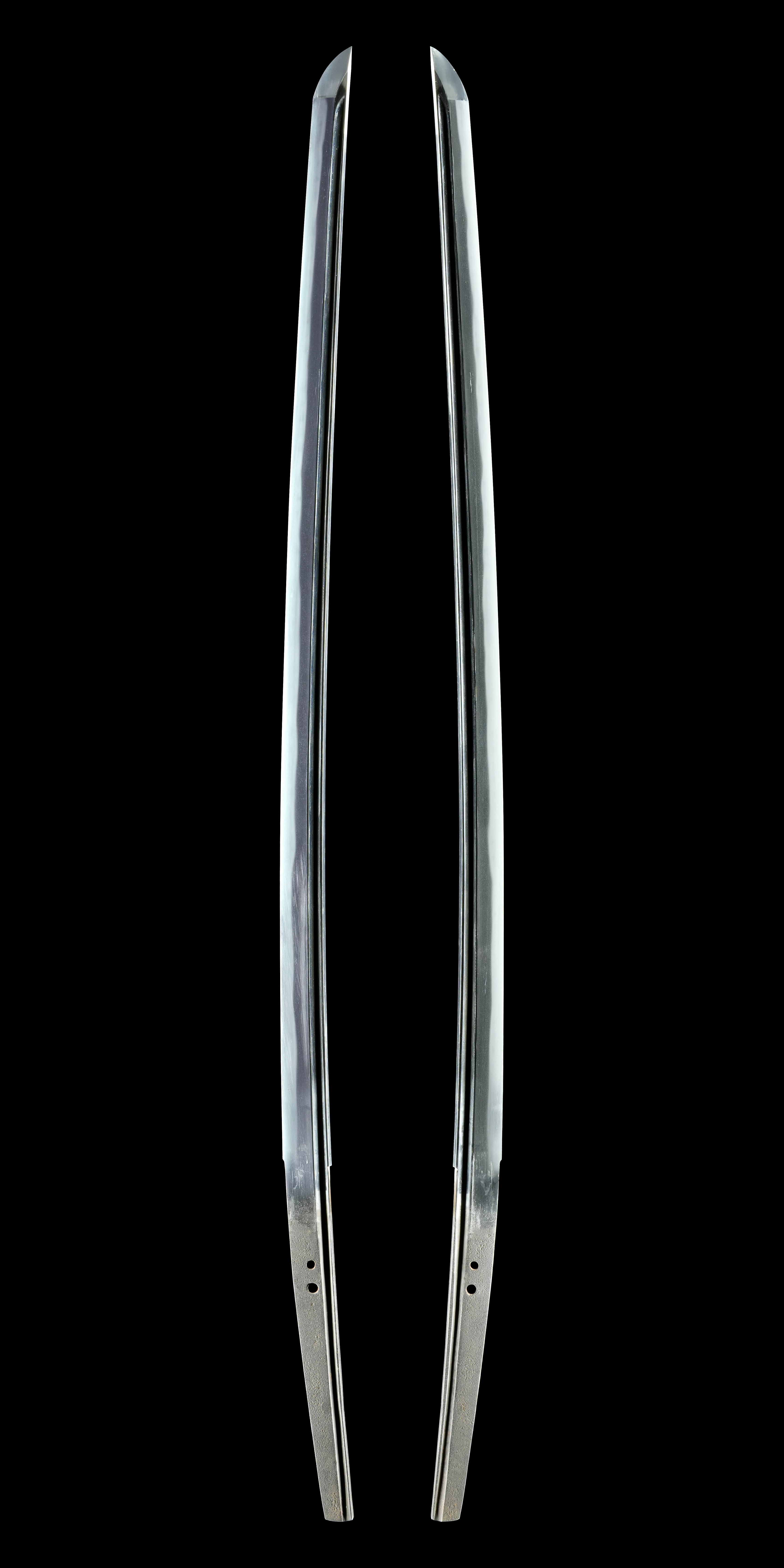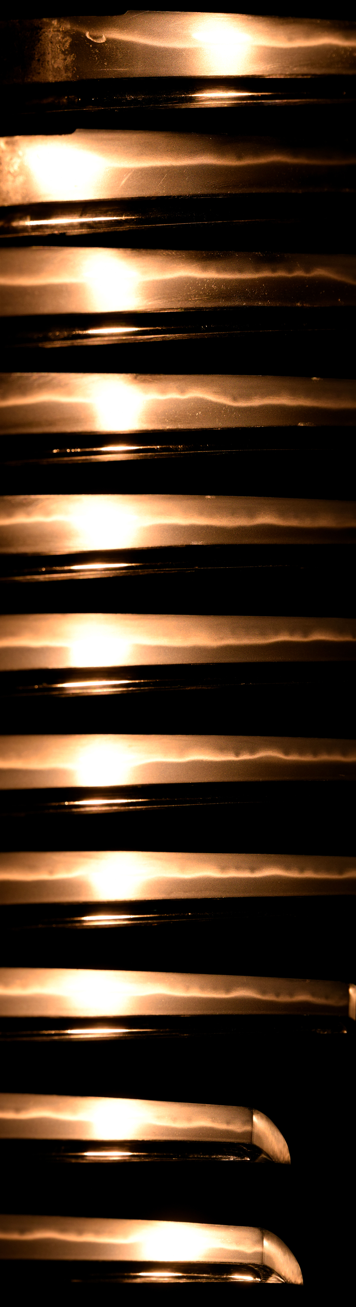 元先の幅差頃好く開いて中切先。表裏に刀樋を掻き通し、地鉄は小板目よく練れて詰み、微細な地景入って地沸付き精美。刃文は匂口明るく、湾れ調子に互ノ目を焼き上げ、匂口深く、刃縁に繊細な砂流を見せ、太く短い足が入り、鋩子は焼きたっぷりと一枚に近く先大丸に返る。