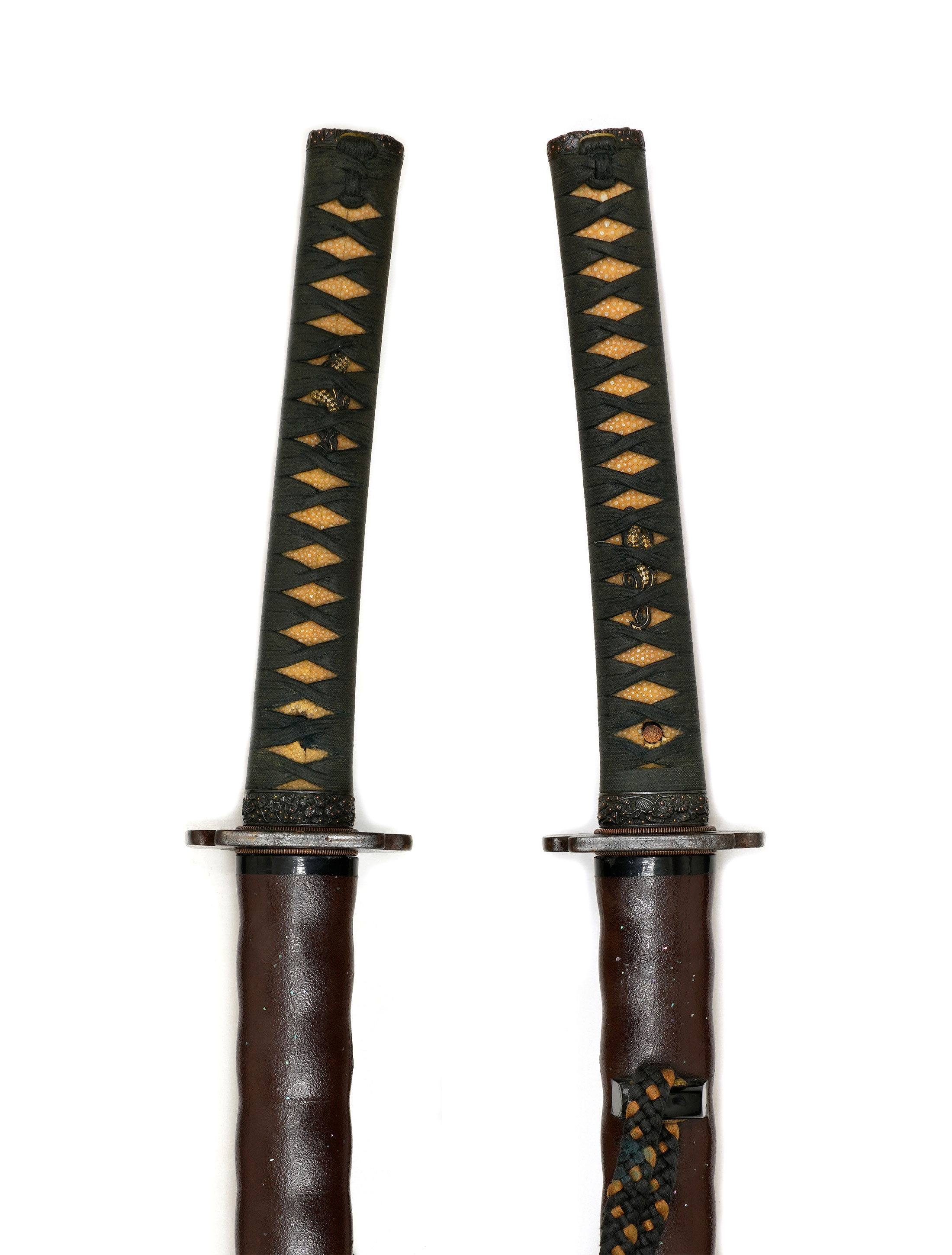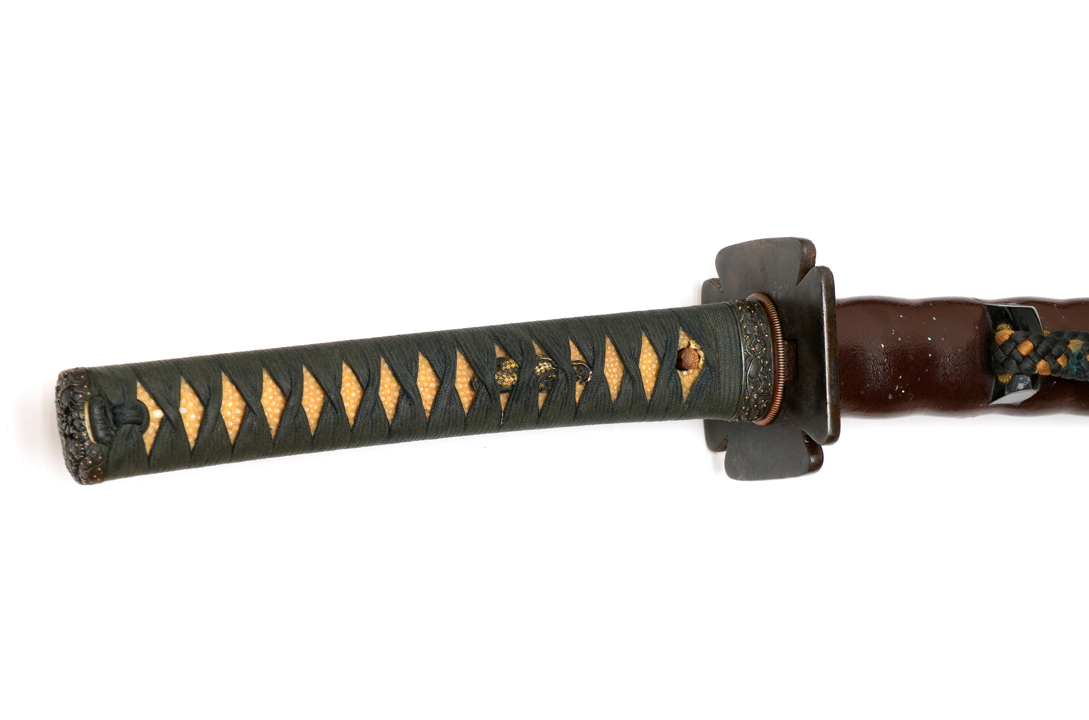 付属の拵は、茶石目地に細やかな蝶貝を蒔いた変わり塗り。落ち着いた色調の中に、光の加減でほのかに煌めく蝶貝が映え、静かな中にも洒脱な趣を湛えています。