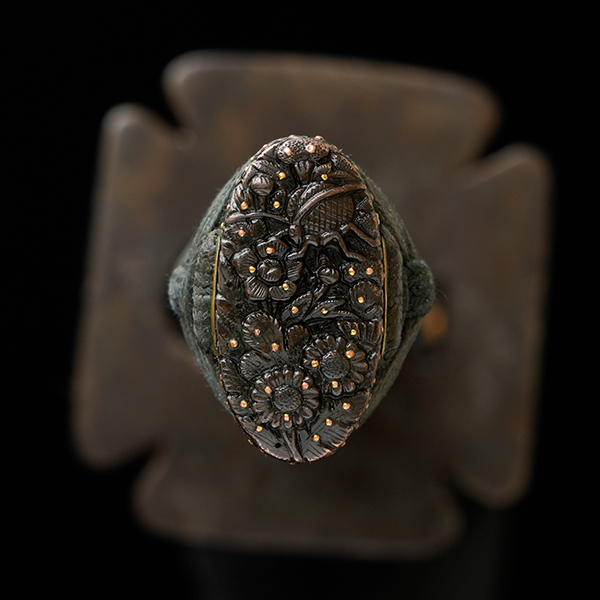一方で、現在は柄に少しガタツキが見られ、鐔鳴りも生じています。これは歴代の所有者が好みに応じて鐔を替え、その都度、無理に目釘を打ち込んだことにより、柄の目釘孔が広がったためと考えられます。