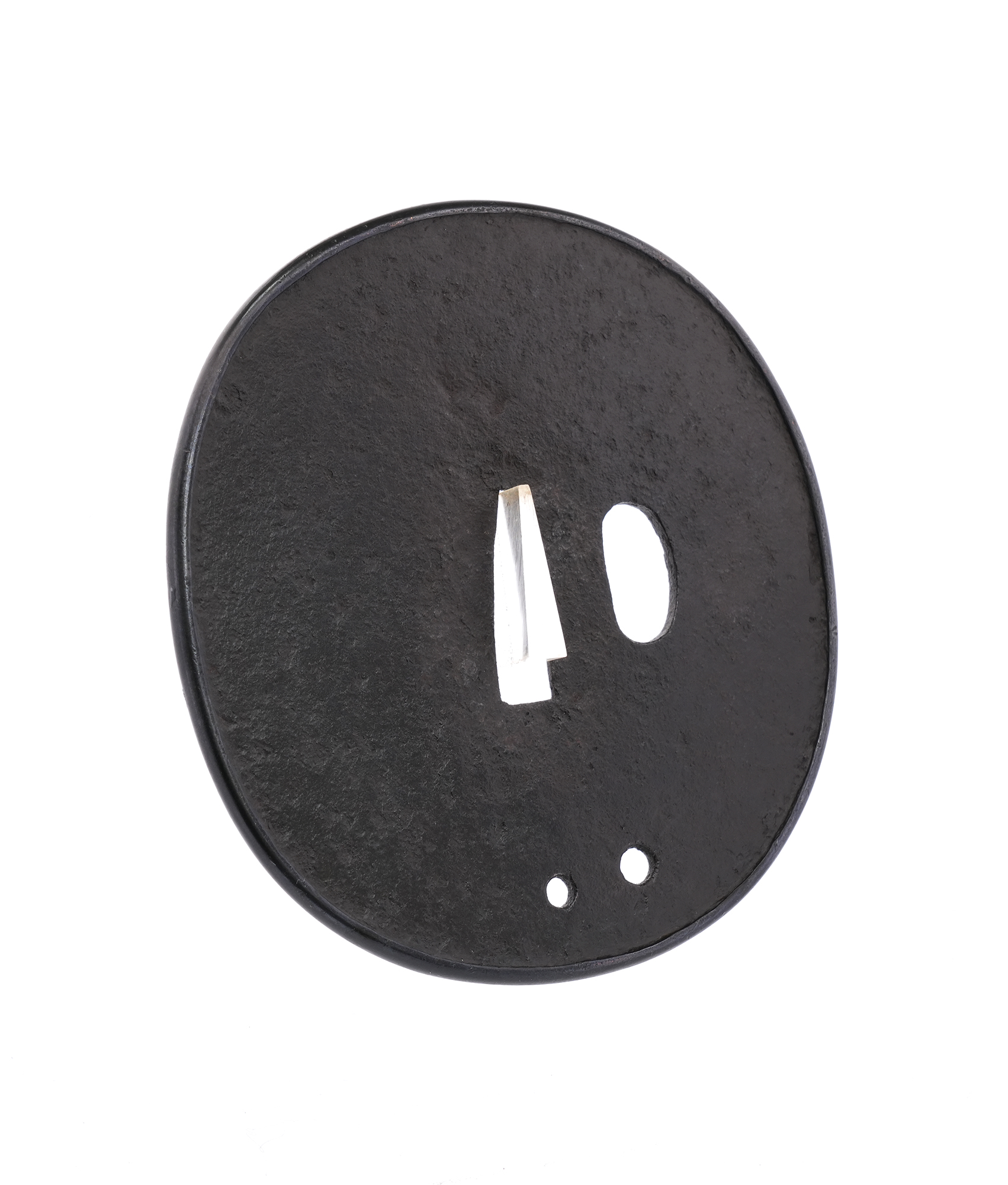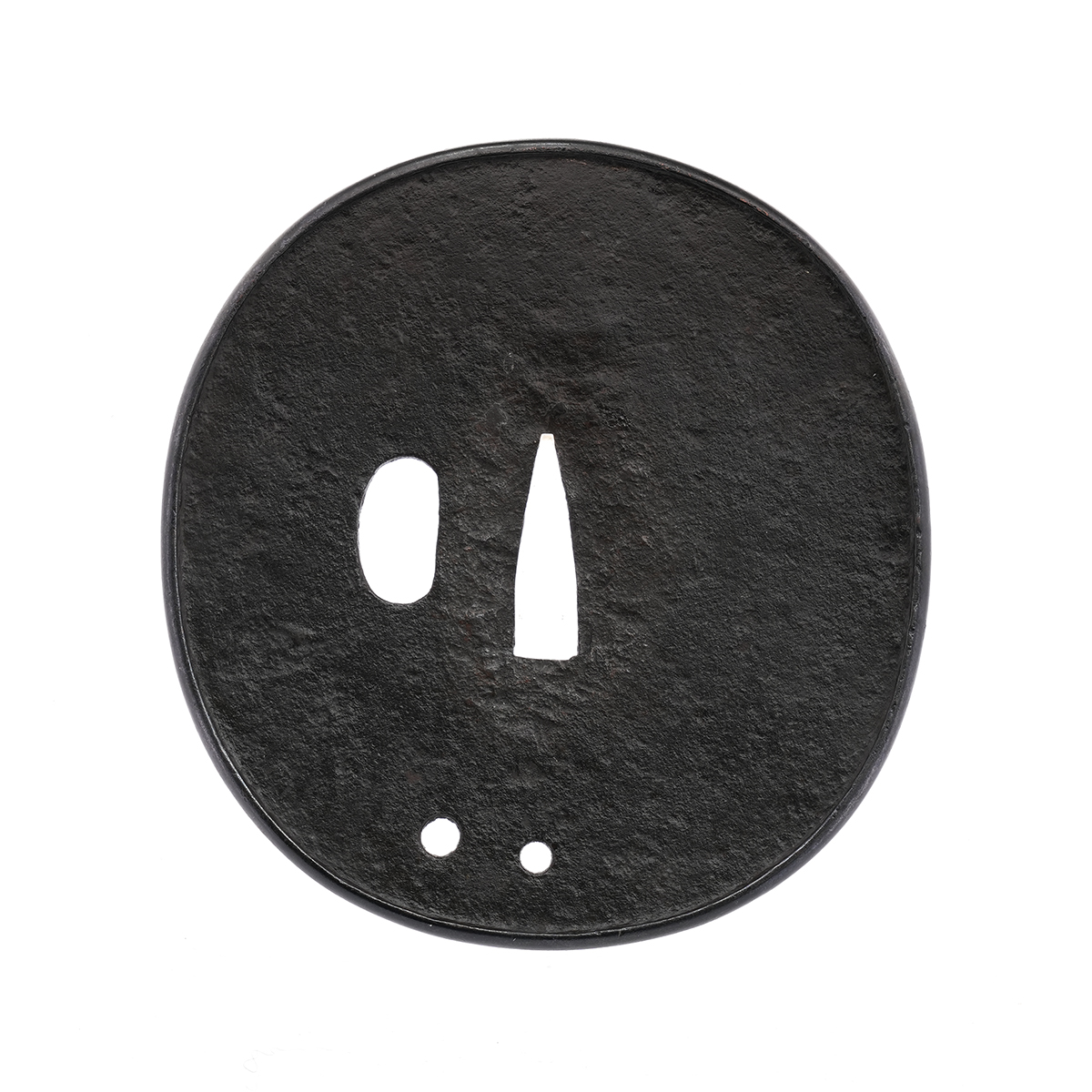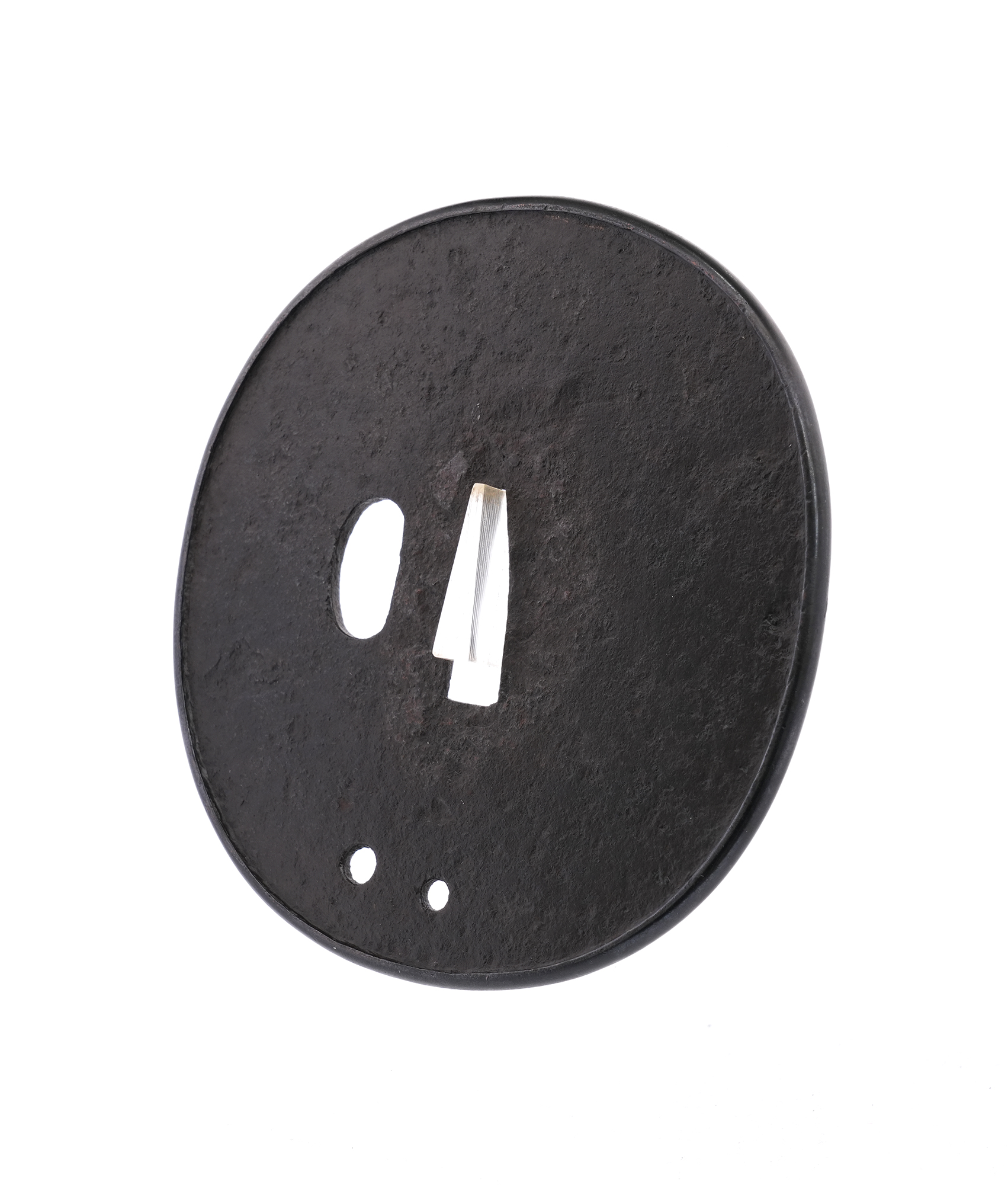耳には赤銅の覆輪を巡らせ、さらに小振りな手貫緒孔を設けるなど、実用性を重んじた造り込みも見逃せません。その一方で、手貫緒の存在が、無骨な鉄味の中にさりげない華やぎを添え、全体の印象を引き締めています。