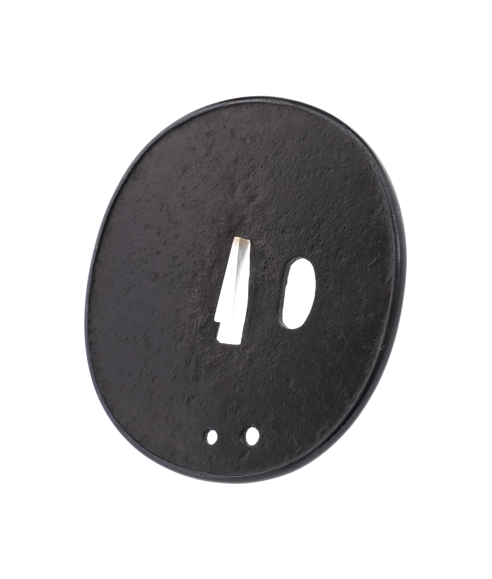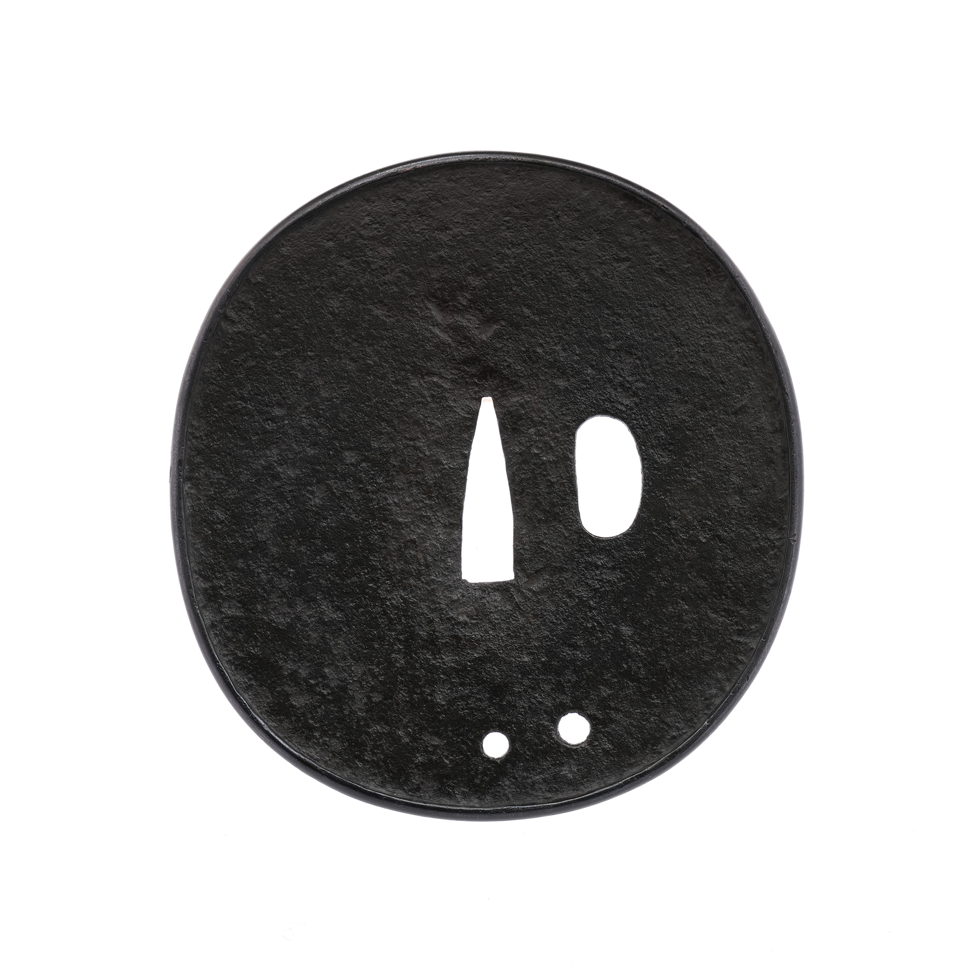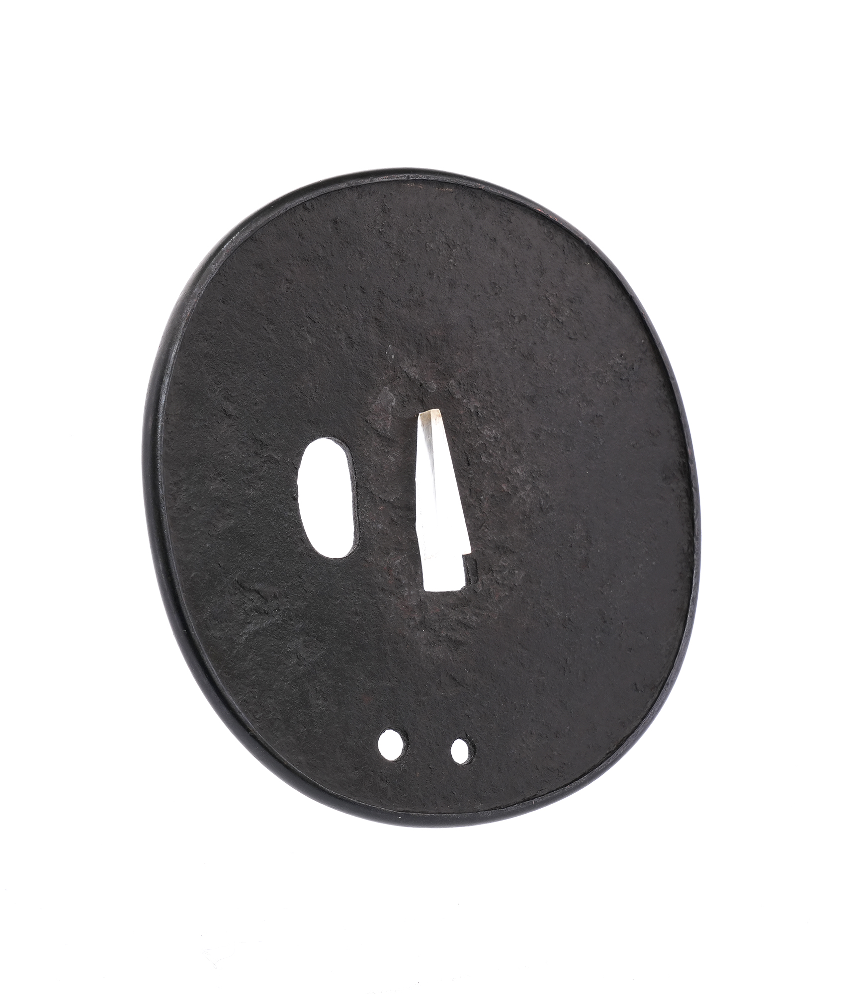 耳には赤銅の覆輪を巡らせ、さらに小振りな手貫緒孔を設けるなど、実用性を重んじた造り込みも見逃せません。その一方で、手貫緒の存在が、無骨な鉄味の中にさりげない華やぎを添え、全体の印象を引き締めています。