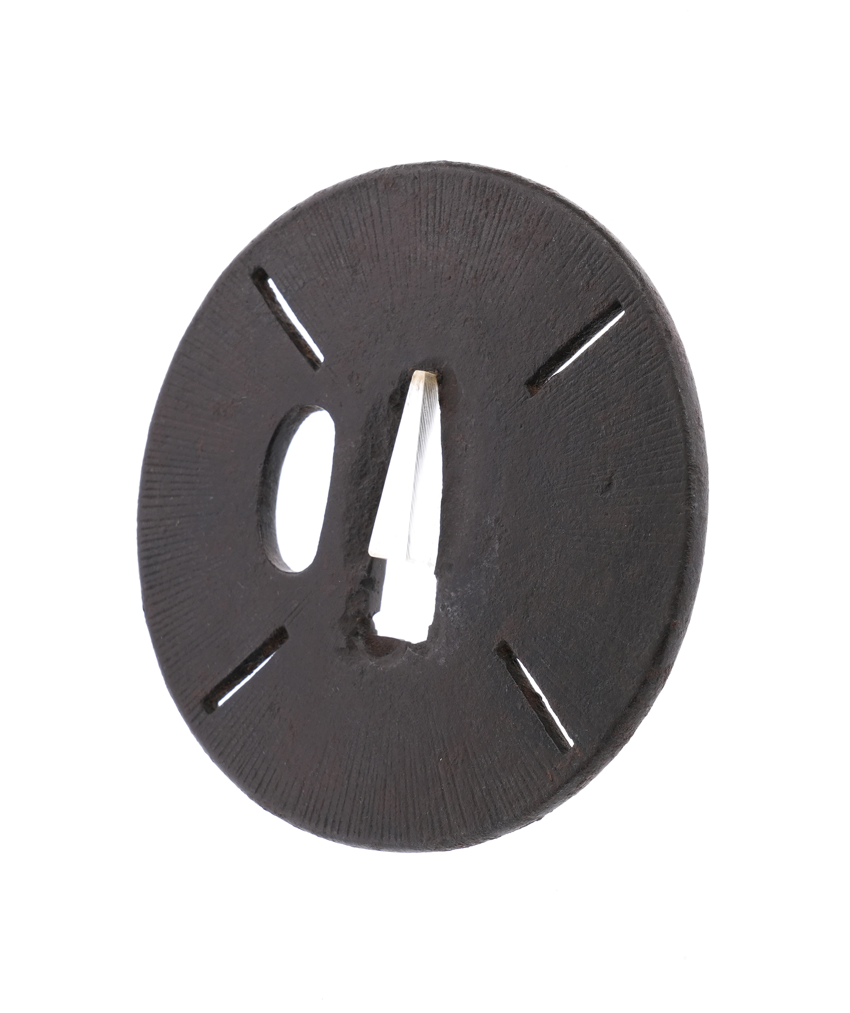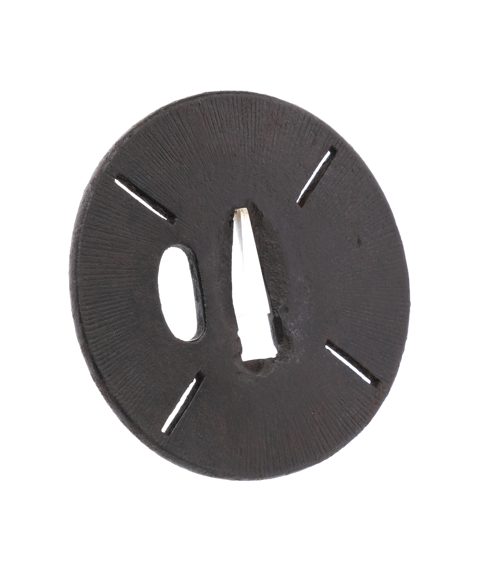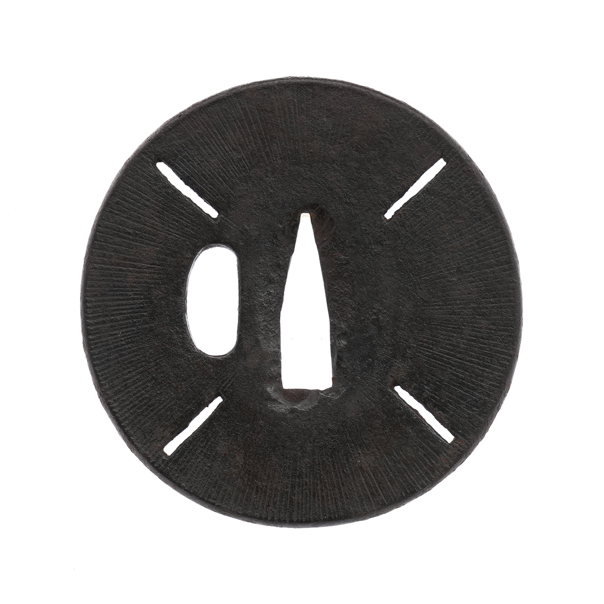 鉄地に斜め四方へ樋を透かし、全体には放射状に阿弥陀鑢をかけた作品。