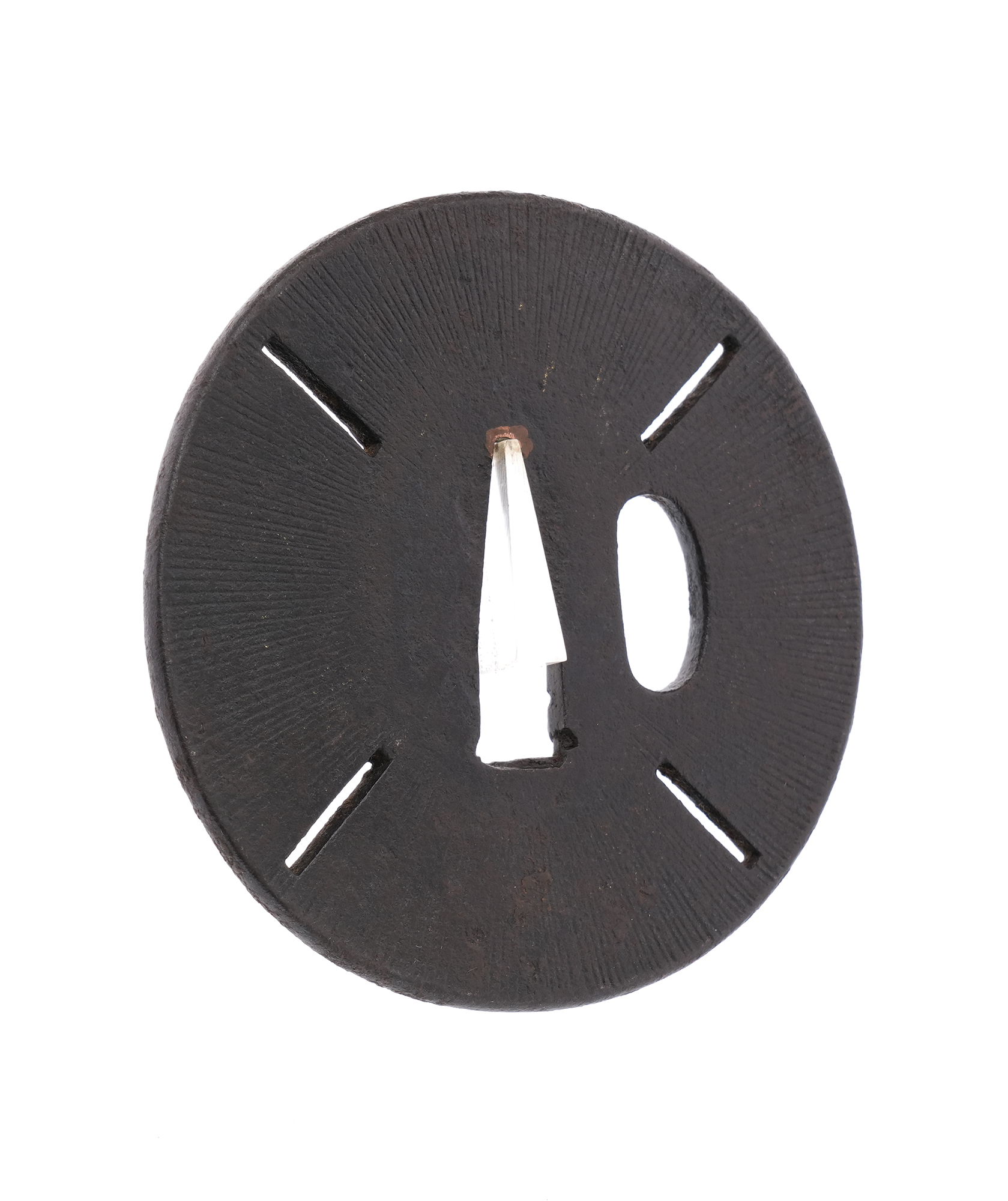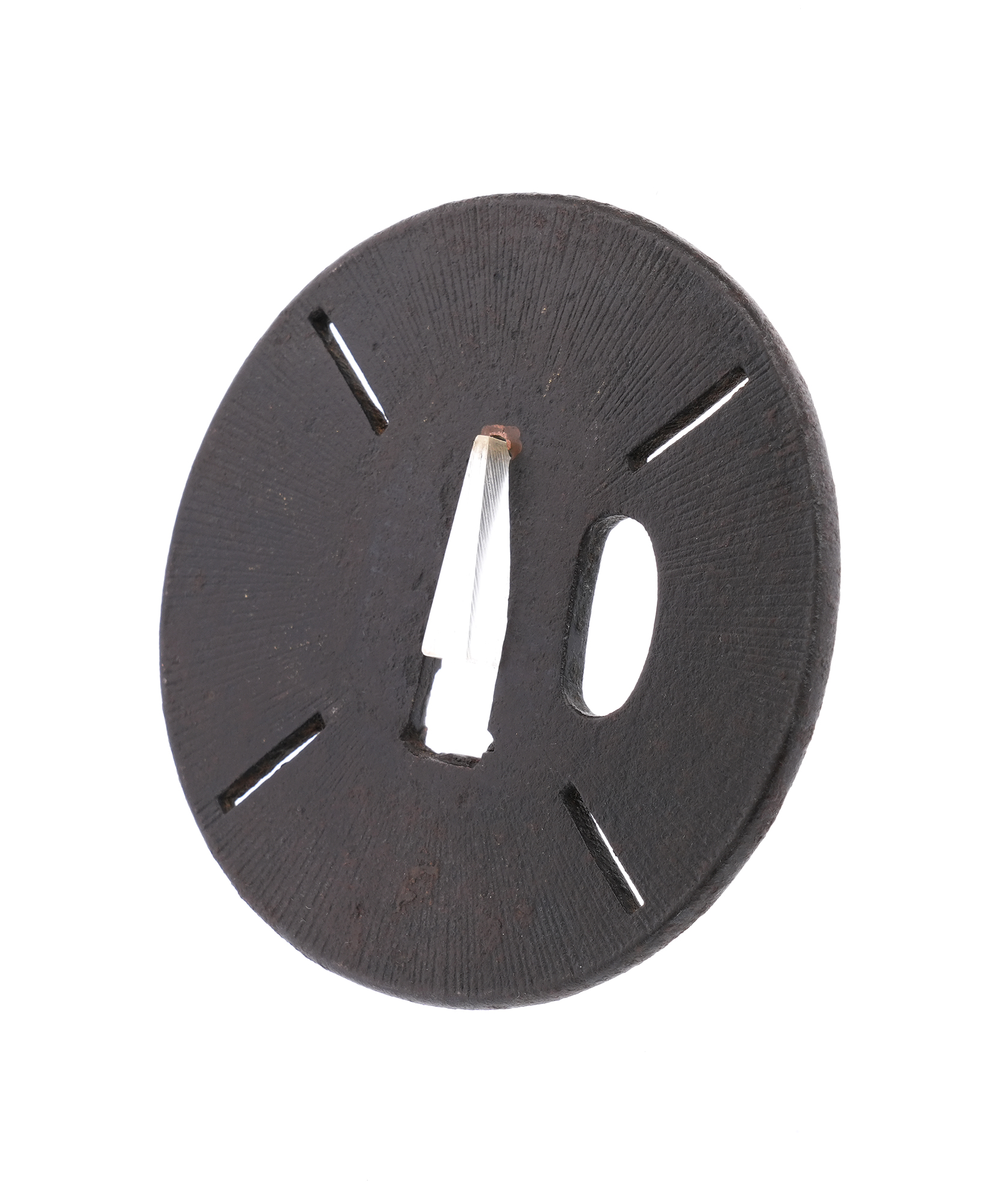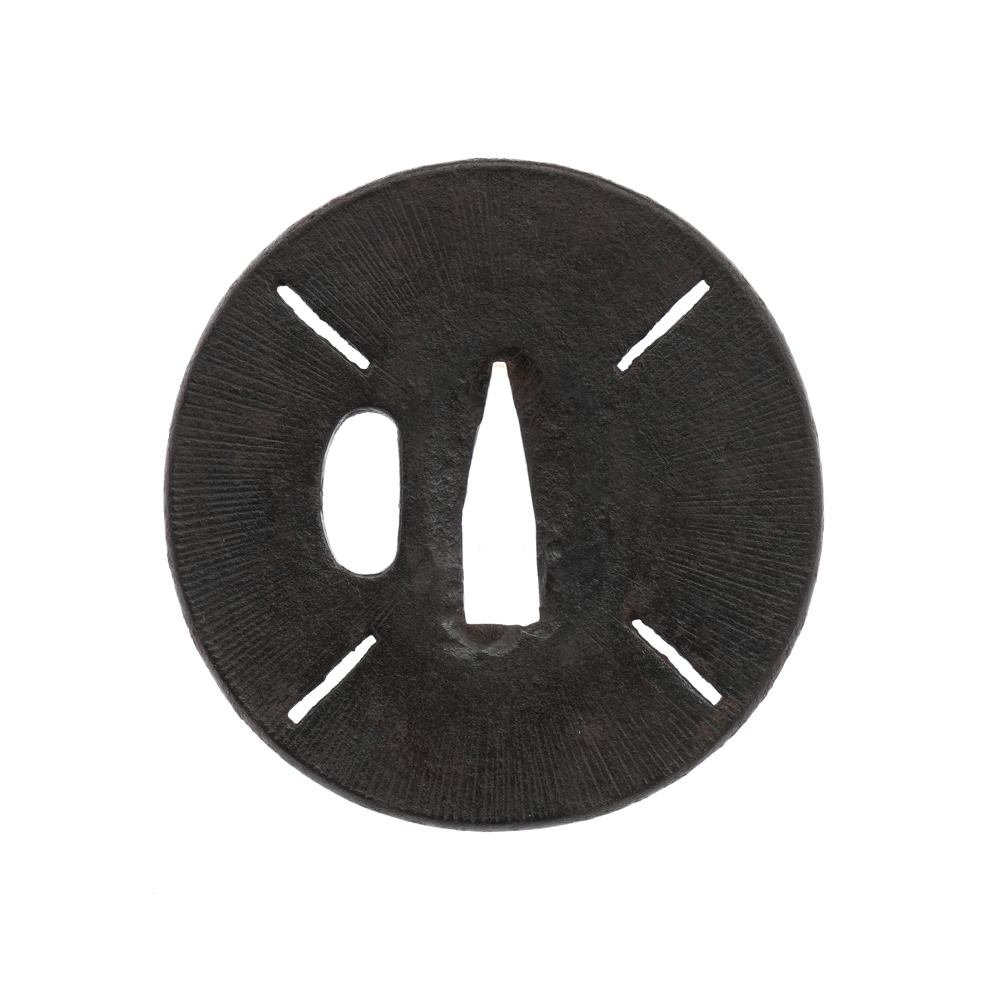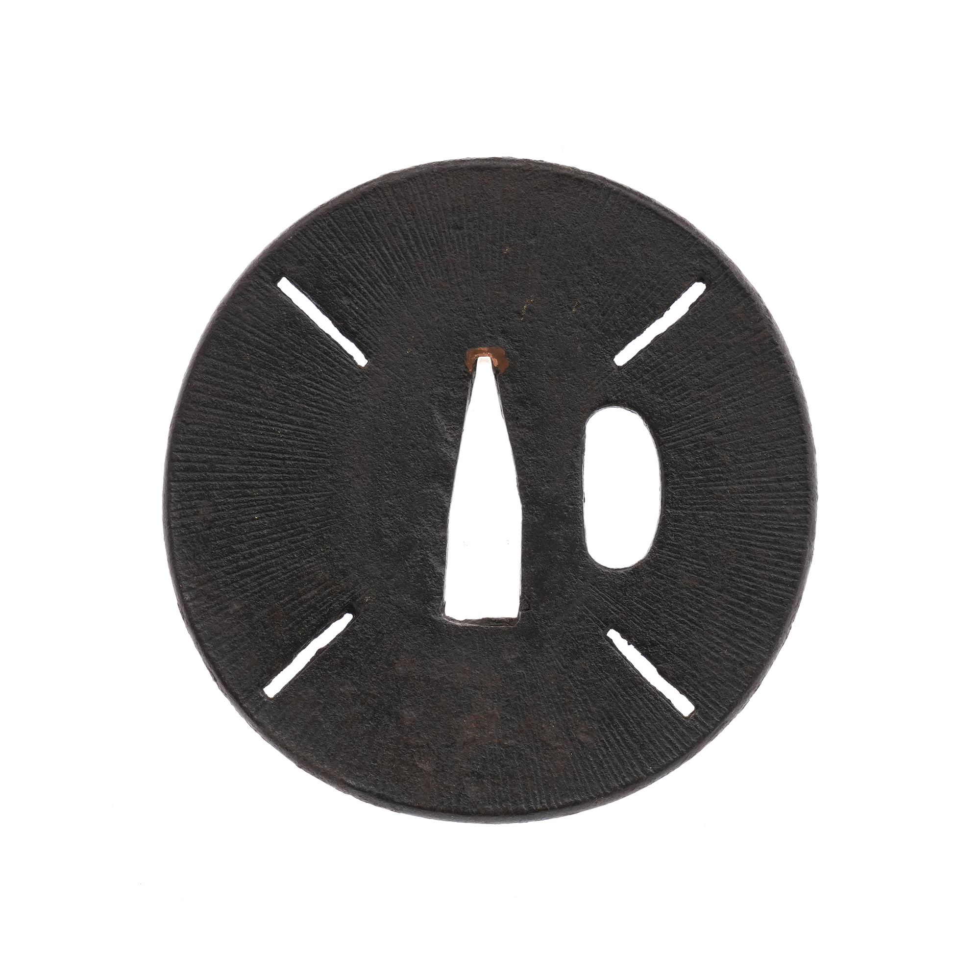 簡潔ながらも味わいある構成で、透かしと鑢目が呼応した、装飾性を抑えつつ鉄味と造形の力で見せる作行きで、実用を重んじた中に確かな美意識が感じられる鐔である。