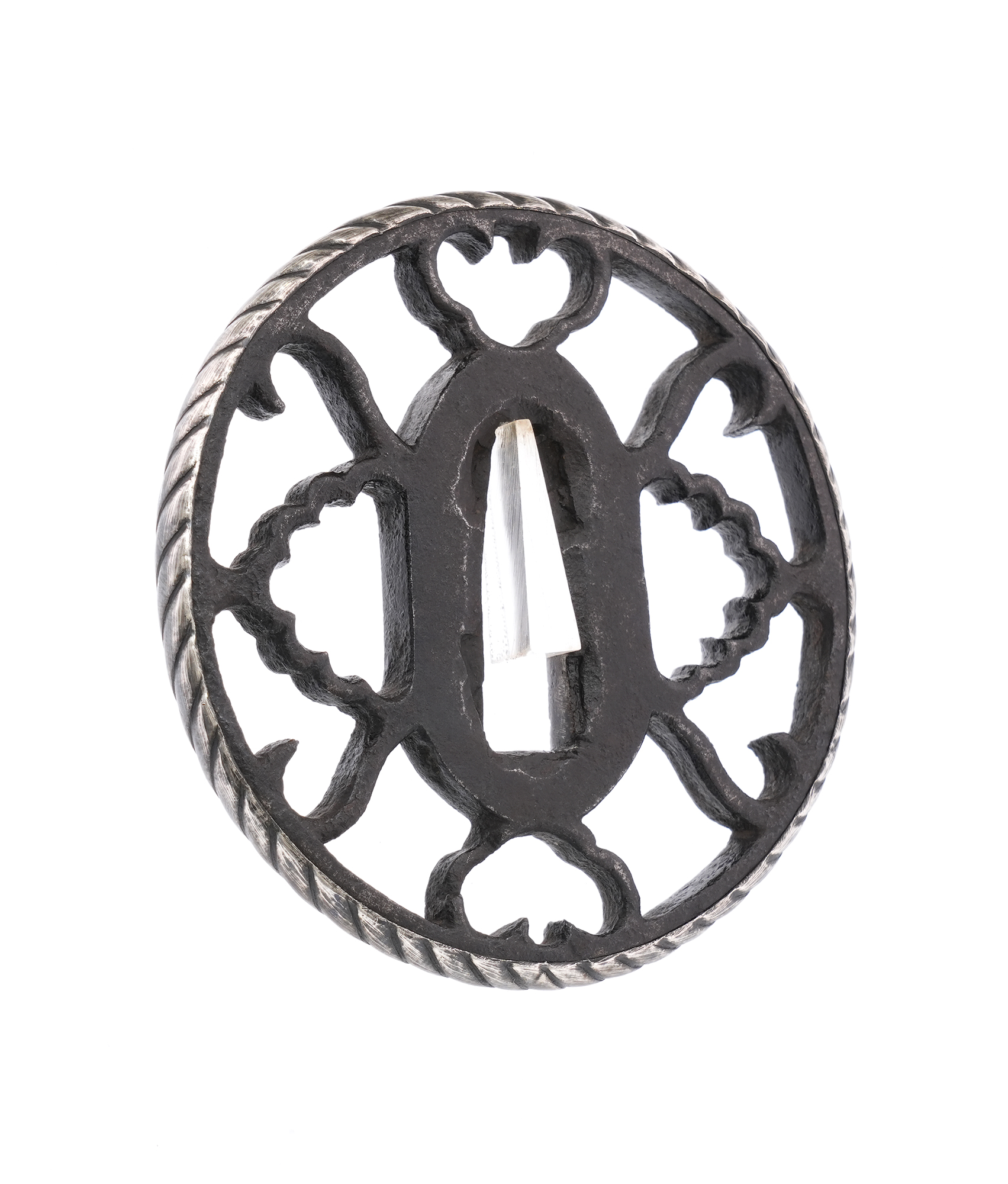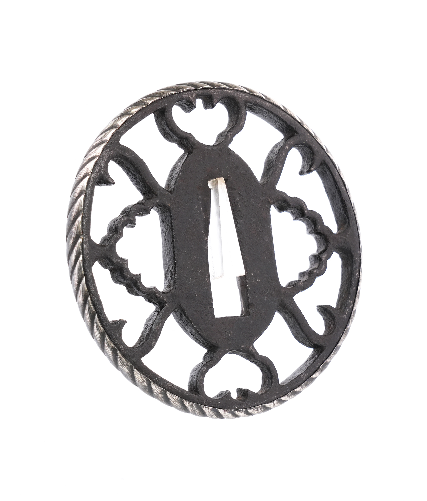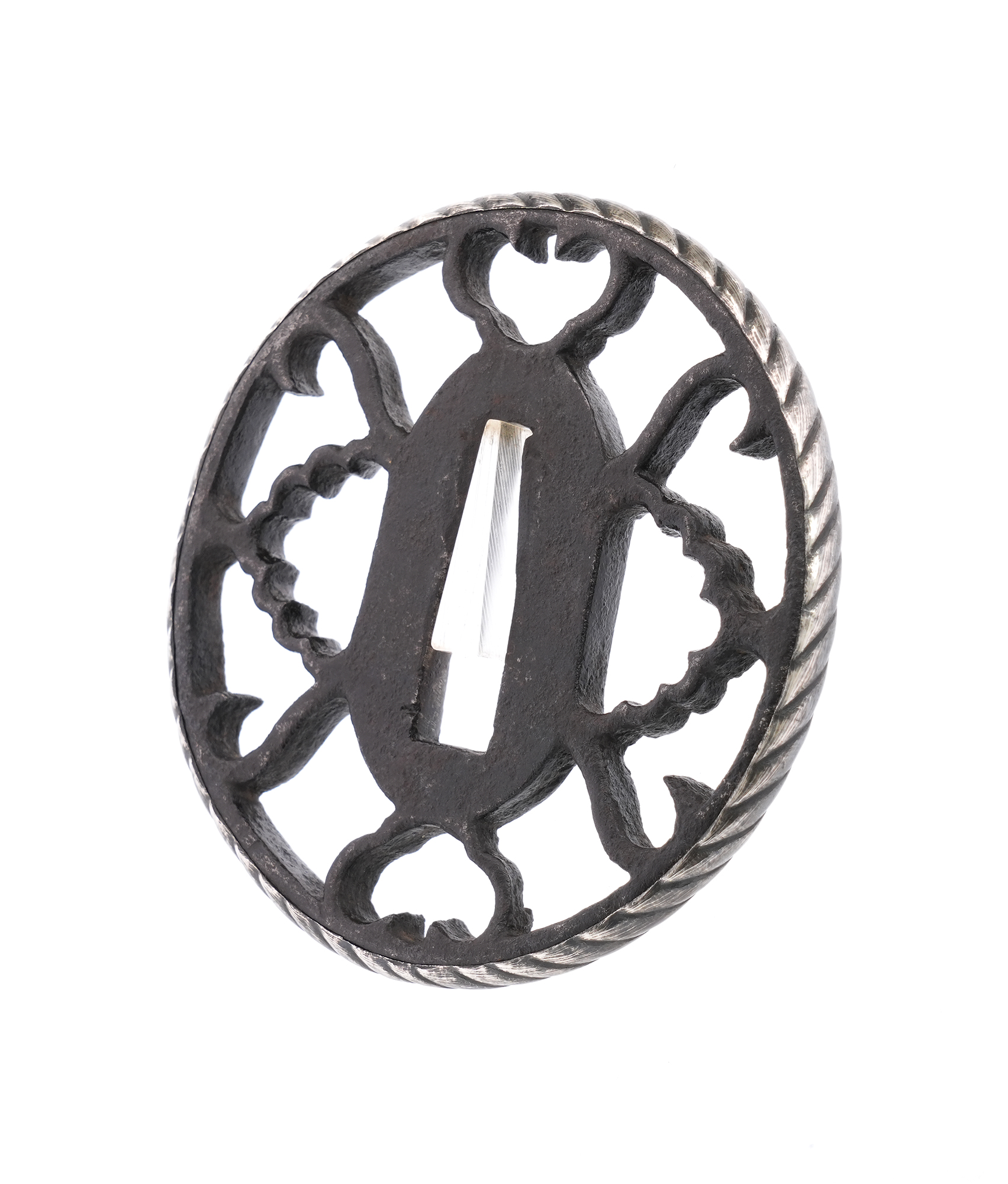 鉄地に蕨手文を大胆に透かし彫りとし、耳には綱模様を表した銀の覆輪を巡らせた、実にいきな趣の鐔。