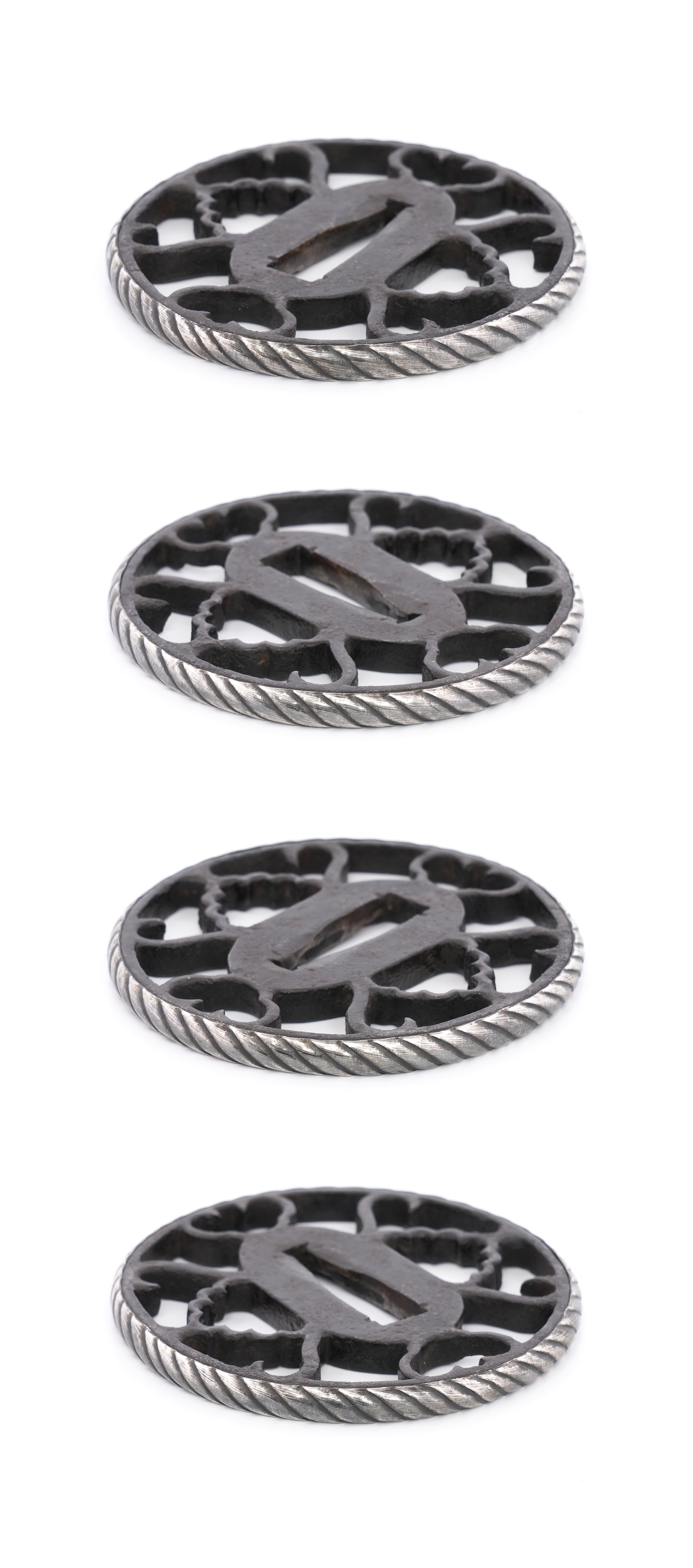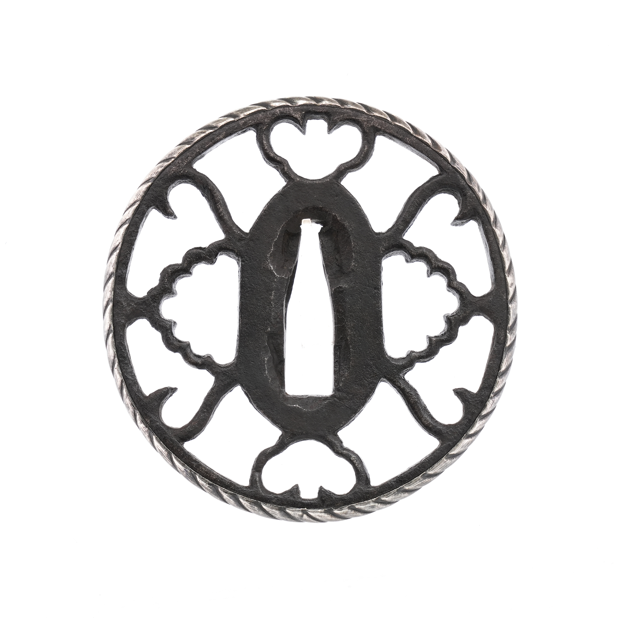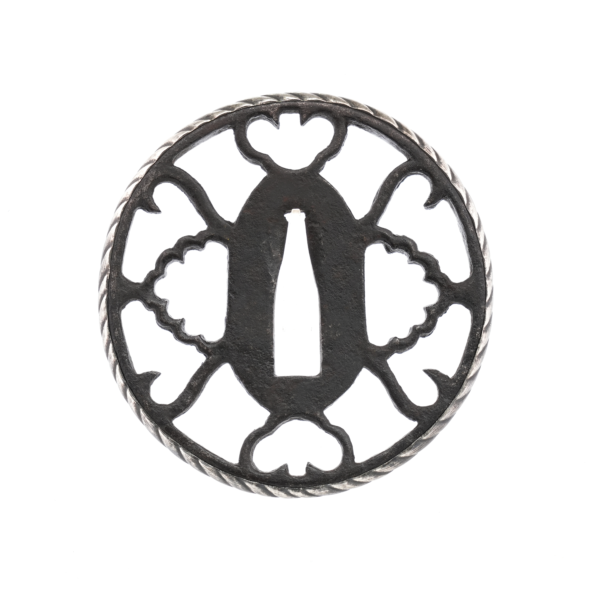 鉄地に蕨手文を大胆に透かし彫りとし、耳には綱模様を表した銀の覆輪を巡らせた、実にいきな趣の鐔。