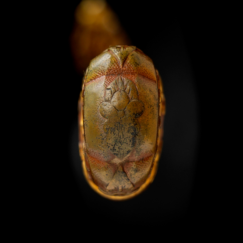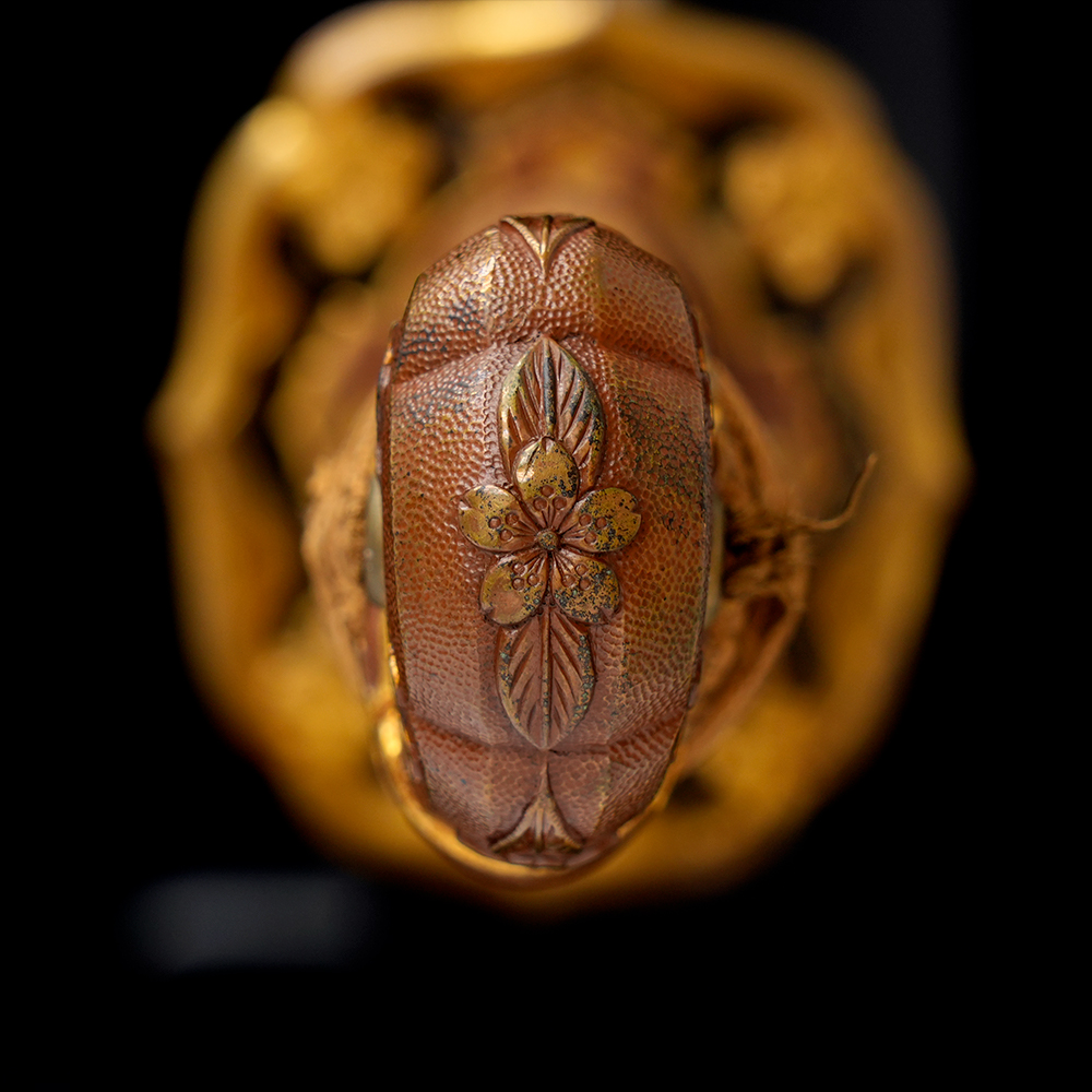目貫には下がり藤紋が据えられており、凛とした気品を備えた意匠が印象的で、特筆すべき点は、厚さ1.02センチを誇る厚い透鐔。その量感と存在感は量産品とは明確に一線を画します。黄金色の鍍金も極めて健全な状態を保っており、当時の製作水準の高さを現在に伝えており、駐爪釦には桜花意匠が用いられ、陸軍軍刀としての格式を明確に示しています。