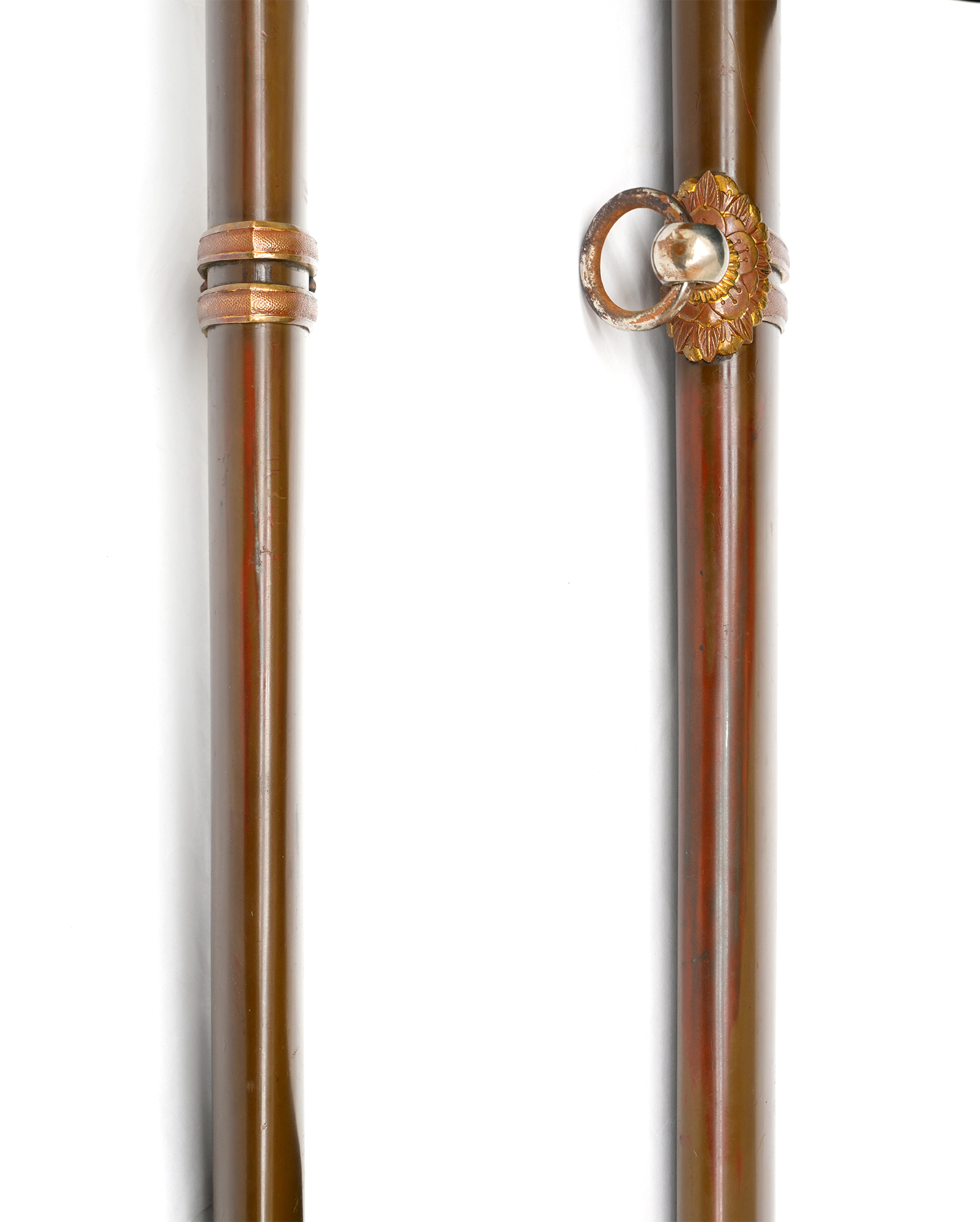 本品は、鉄鞘を備えた陸軍旧九四式軍刀拵 初期型です。着脱式の第二佩鐶は失われていますが、初期型ならではの端正な姿はよく保たれており、全体の印象を損なうものではありません。