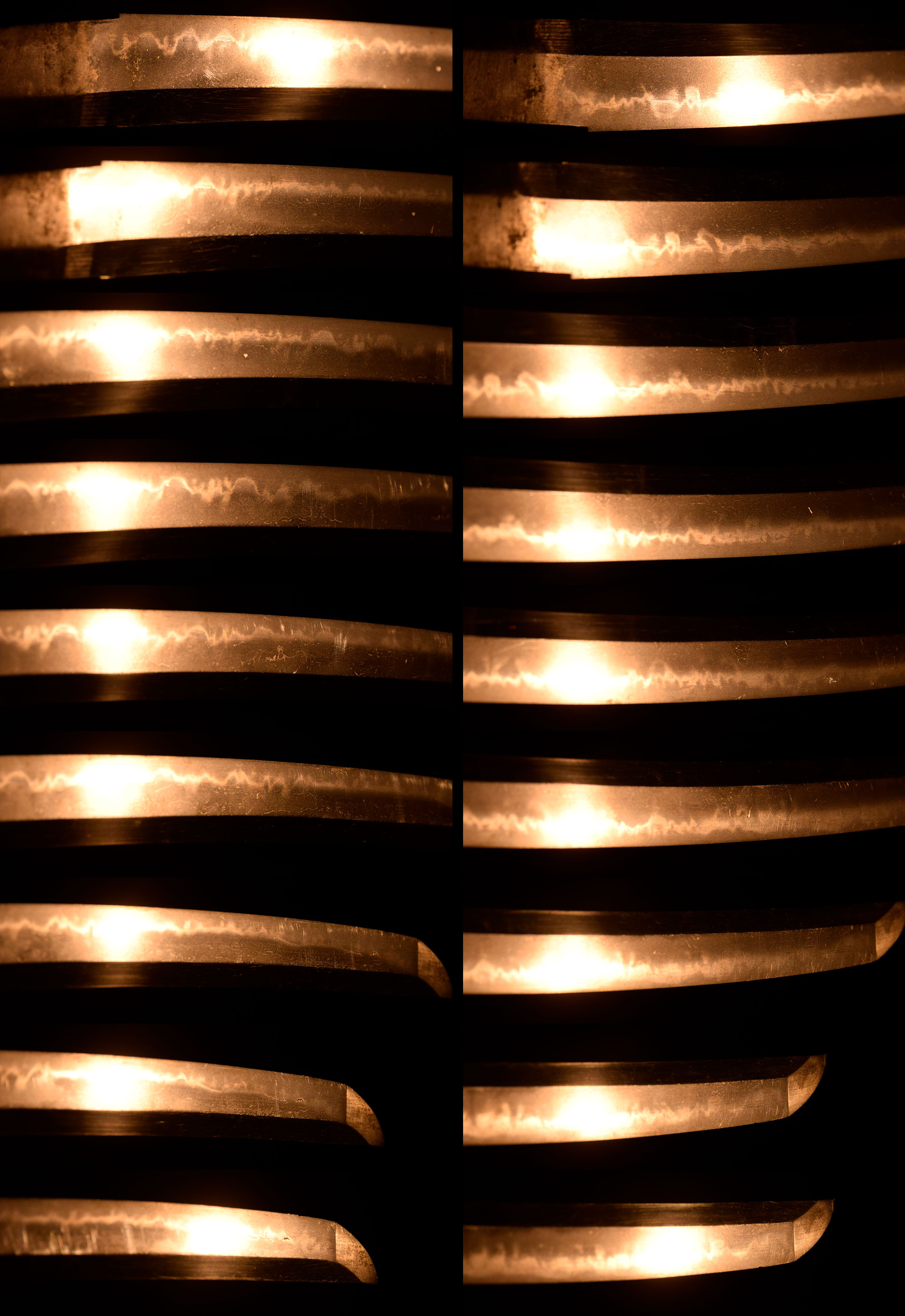 地鉄は杢目がよく錬れ、少しく肌立って地景が入り、淡く映りごころを見せ、刃文は匂口明るく、互ノ目を主調に互ノ目丁字や丁字が交じり、足盛んに入り、随所に砂流がかかり、匂口は平地へ向かって煙り込むように変化し、表情に富んだ出来口を示しています。鋩子は乱れ込んで先丸く返り、刃中の働きと呼応する巧みなまとめ方です。