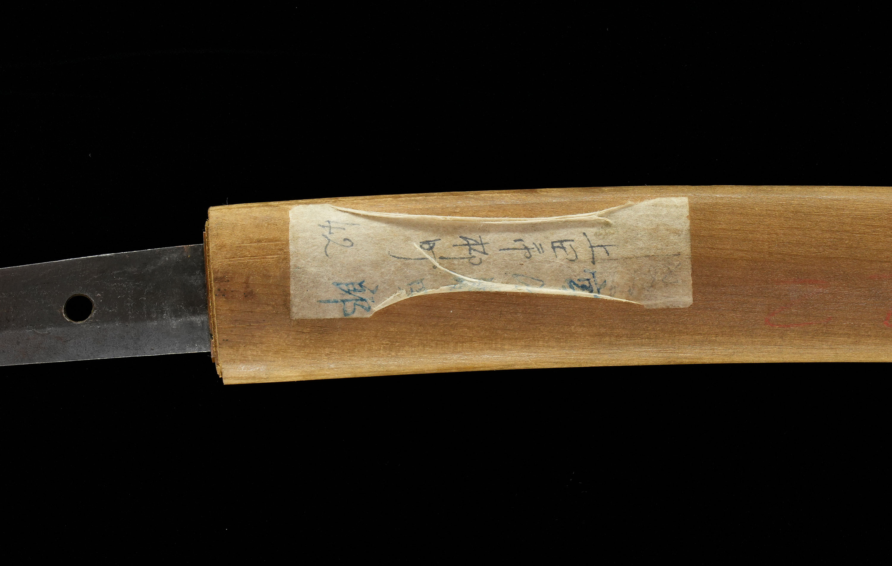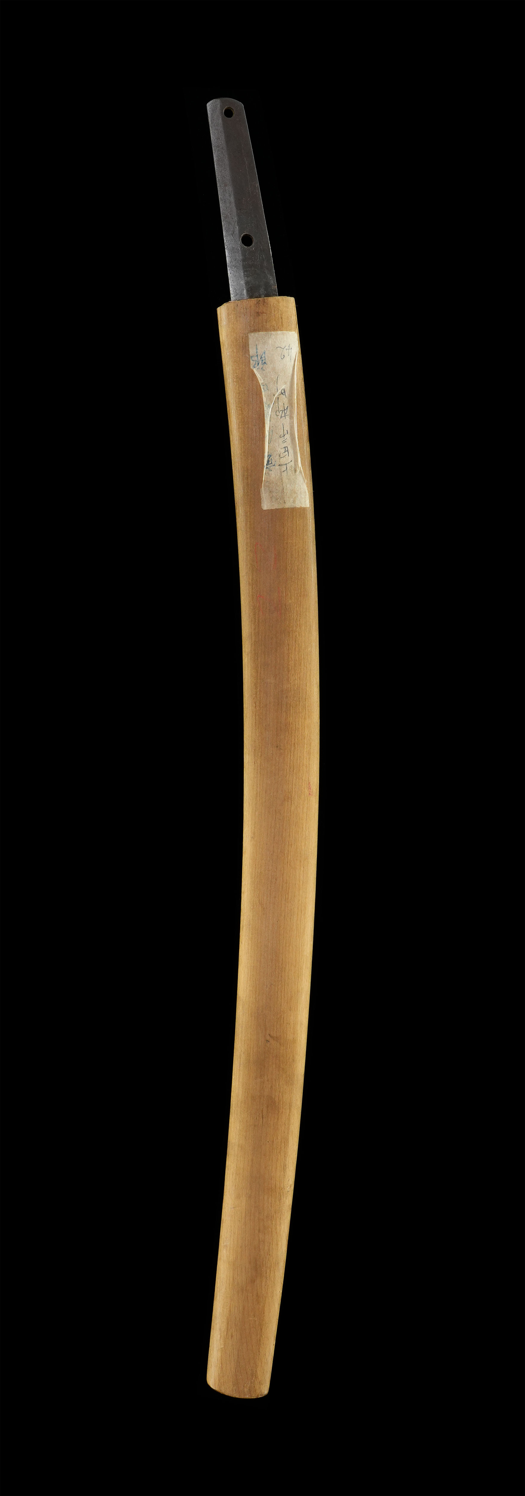 附属のはばきを見ると、元来は金または銀の着せが施されていた高級仕様であったことがうかがえ、本刀が相応しい格を備えた存在であったことを物語っています。指表の物打より先の平地には鍛え筋が認められますが、研磨を施す価値はじゅうぶんにあります。状態を整えたうえで、保存刀剣審査への受審も是非お勧めしたい一振です。 現在、白鞘は柄を欠き、鞘のみの状態ですが、本刀の出来を鑑みれば、白鞘を新調するだけの価値は十分に認められます。これら今後の工作代を考慮し、内容に比して安価にご案内いたします。
