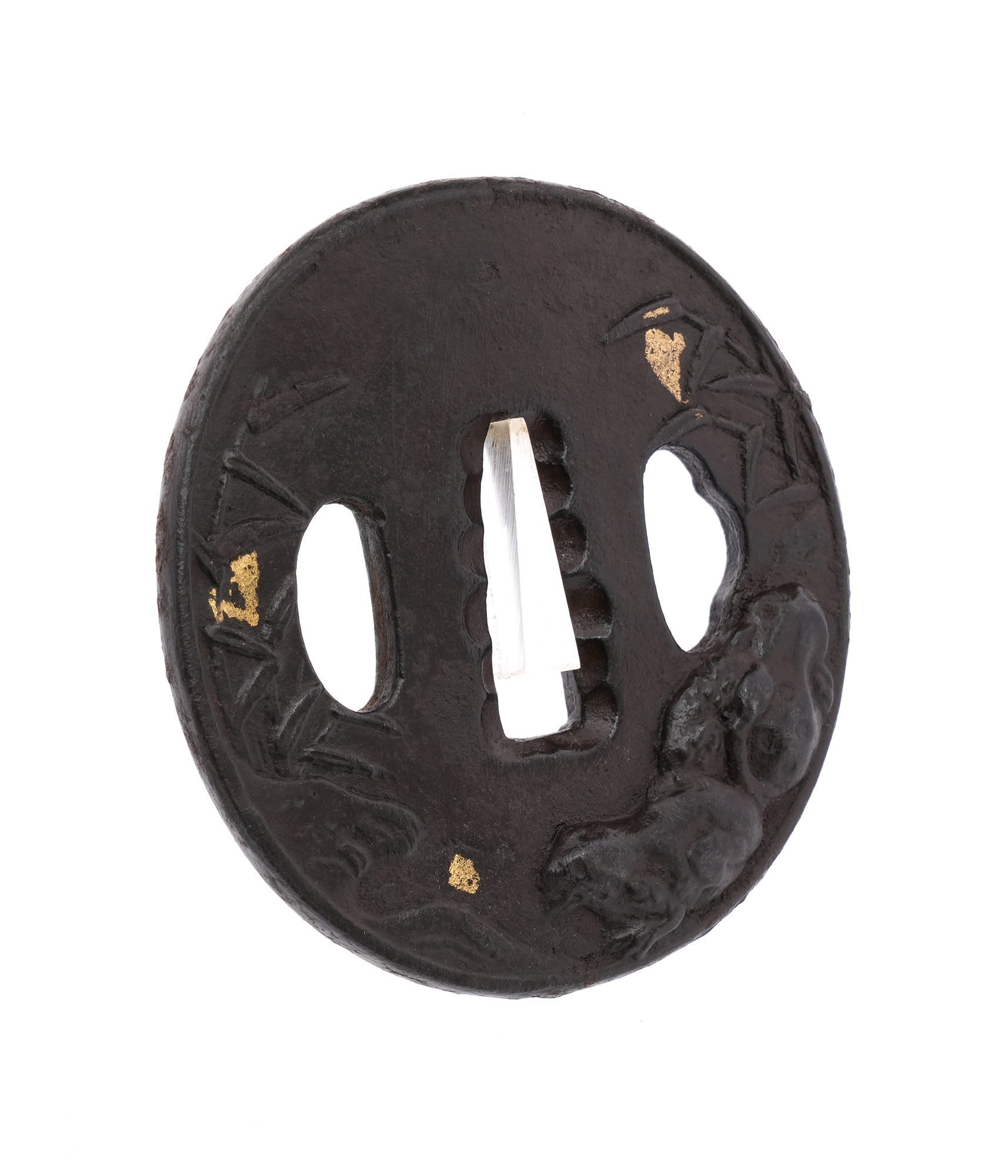 随所に無作為に配された金の布象嵌が、鉄地の渋い風合いに柔らかな華やぎを添え、画面に奥行きと変化をもたらしています。耳は丁寧に打ち返されており、堅牢さと同時に、細部にまで行き届いた仕事ぶりがうかがえます。写実と意匠性を兼ね備えた味わい深い一作です。