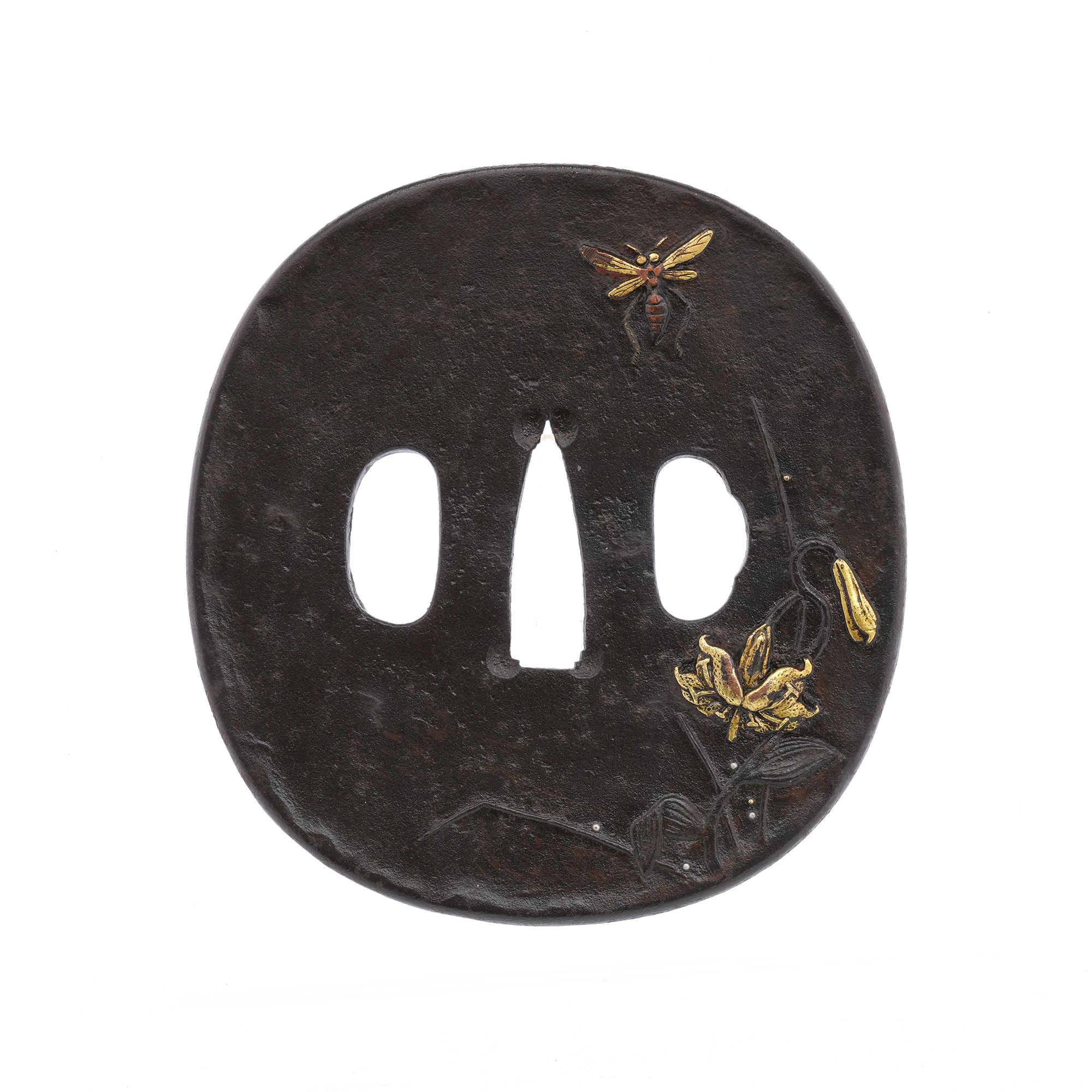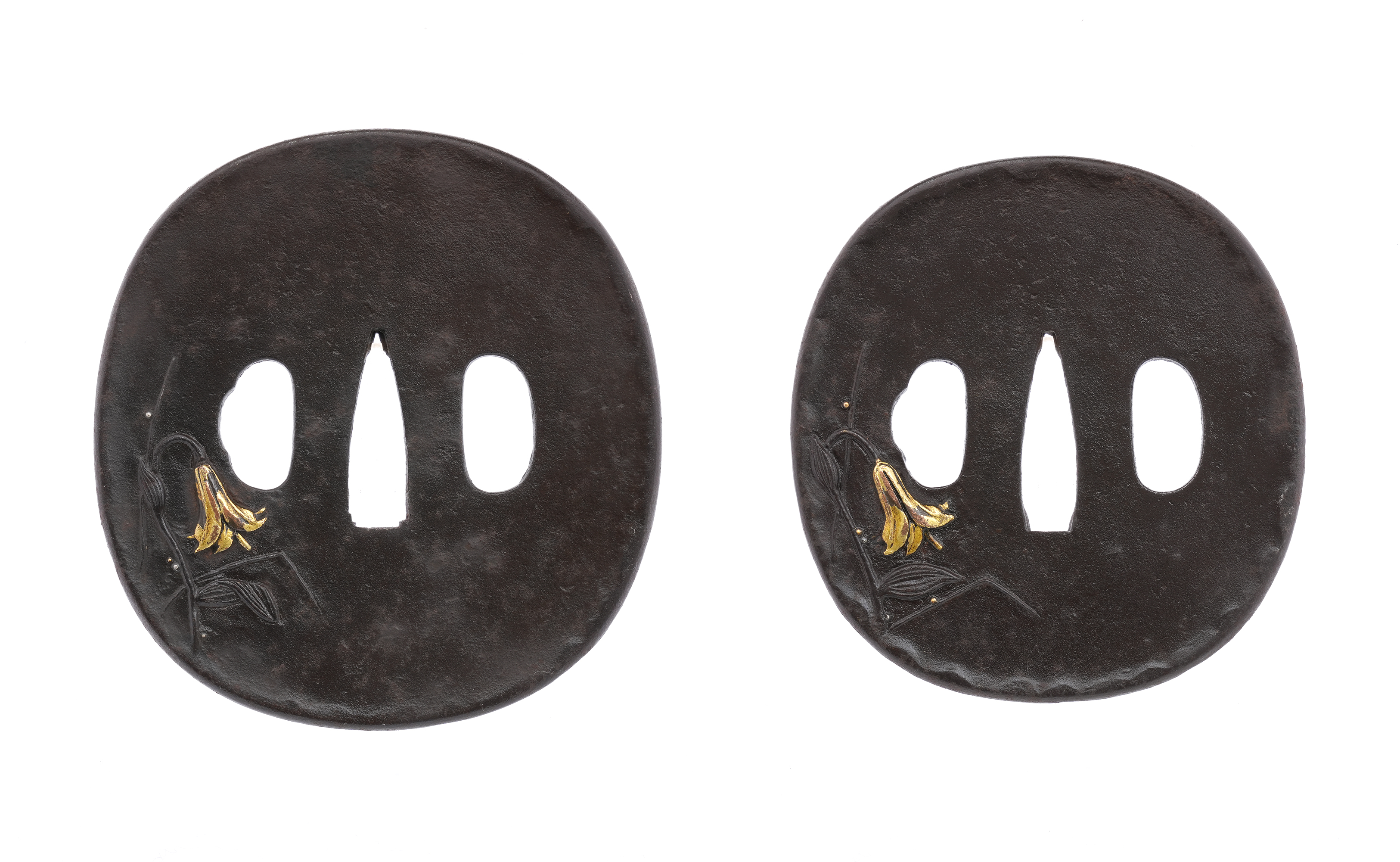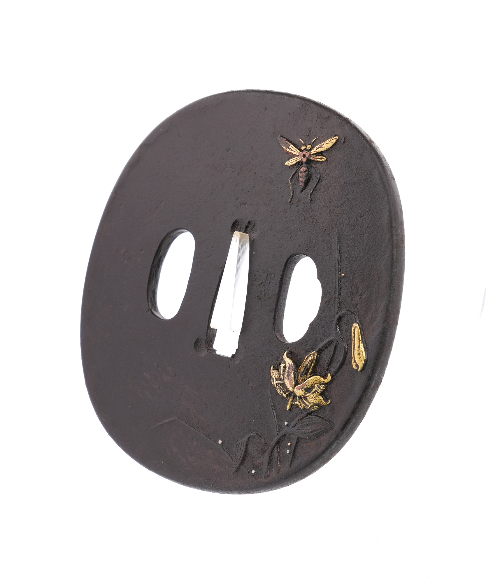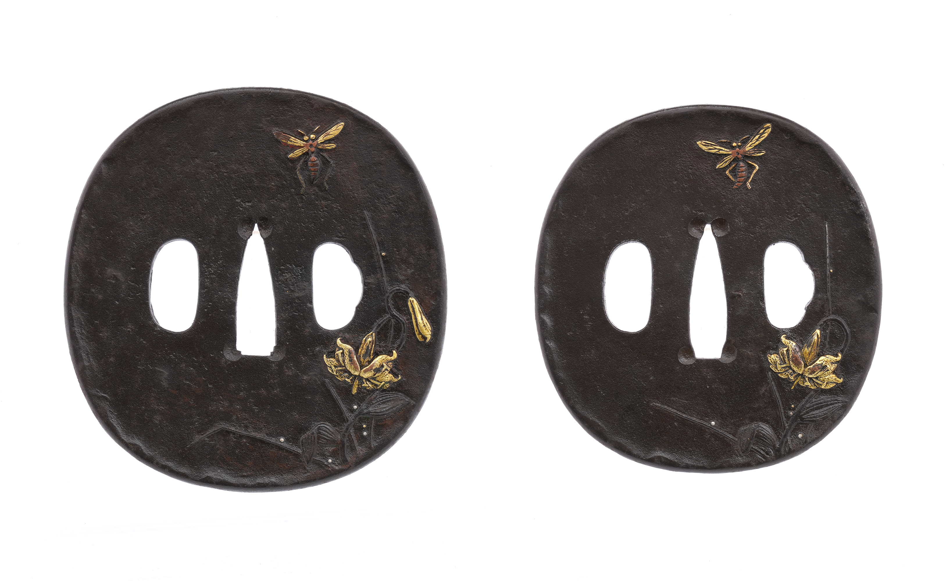 本品は鉄地を用い、可憐に咲く百合の花と、その周囲を飛び交う蜂の姿を生き生きと描いた大小鐔です。静と動の対比が巧みに表現され、画面に心地よい緊張感とリズムを生み出しています。