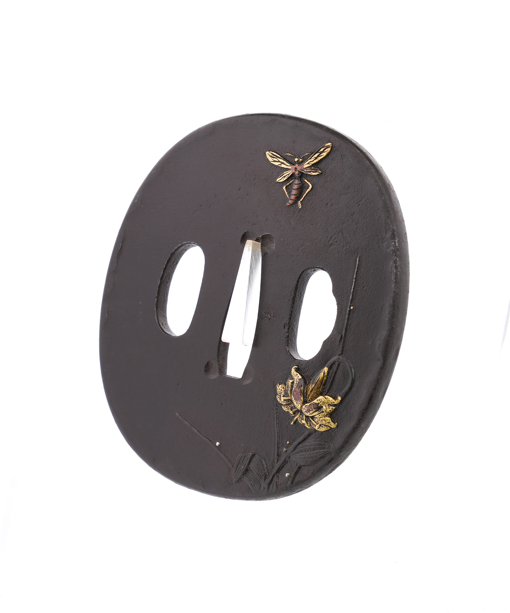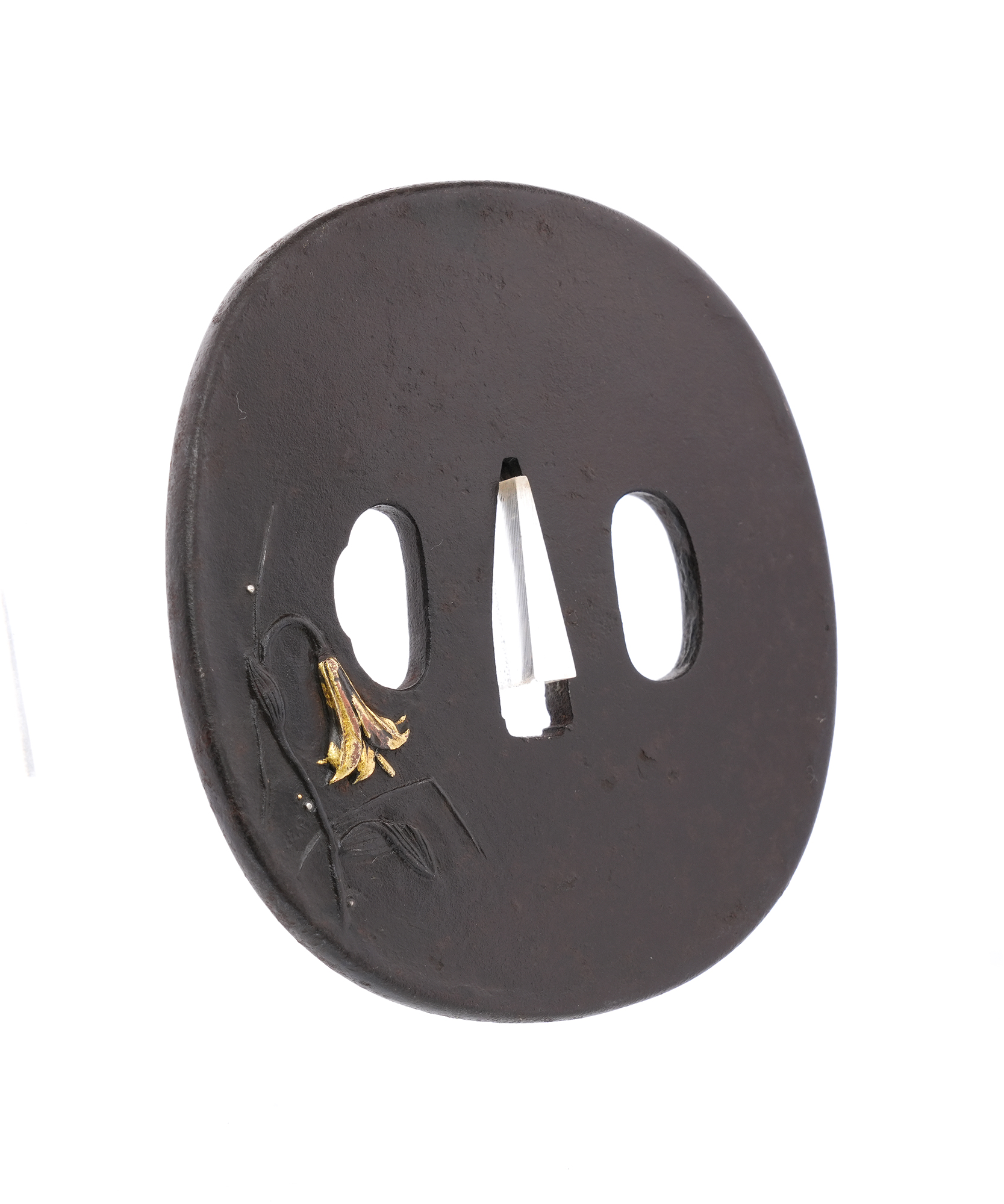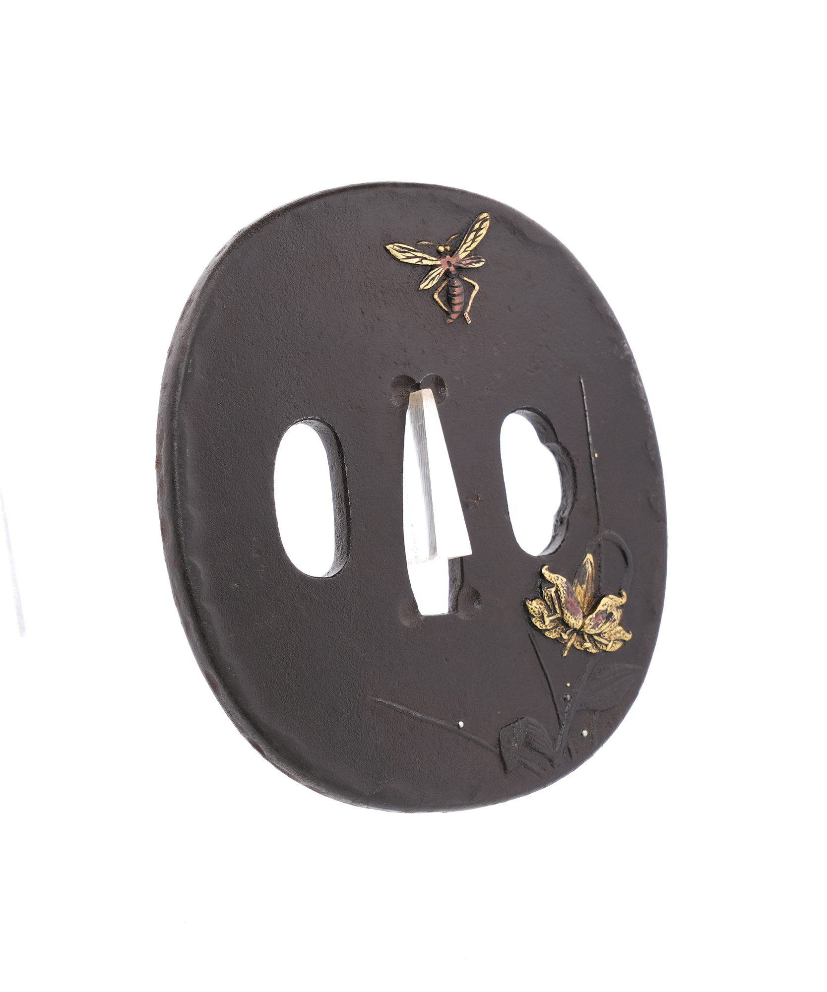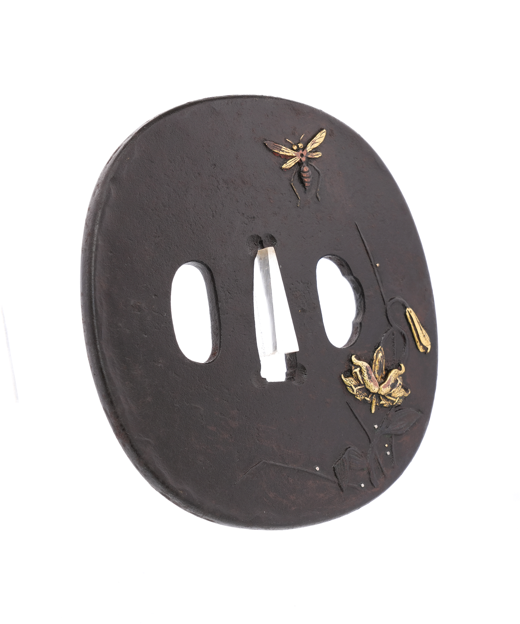 本品は鉄地を用い、可憐に咲く百合の花と、その周囲を飛び交う蜂の姿を生き生きと描いた大小鐔です。静と動の対比が巧みに表現され、画面に心地よい緊張感とリズムを生み出しています。