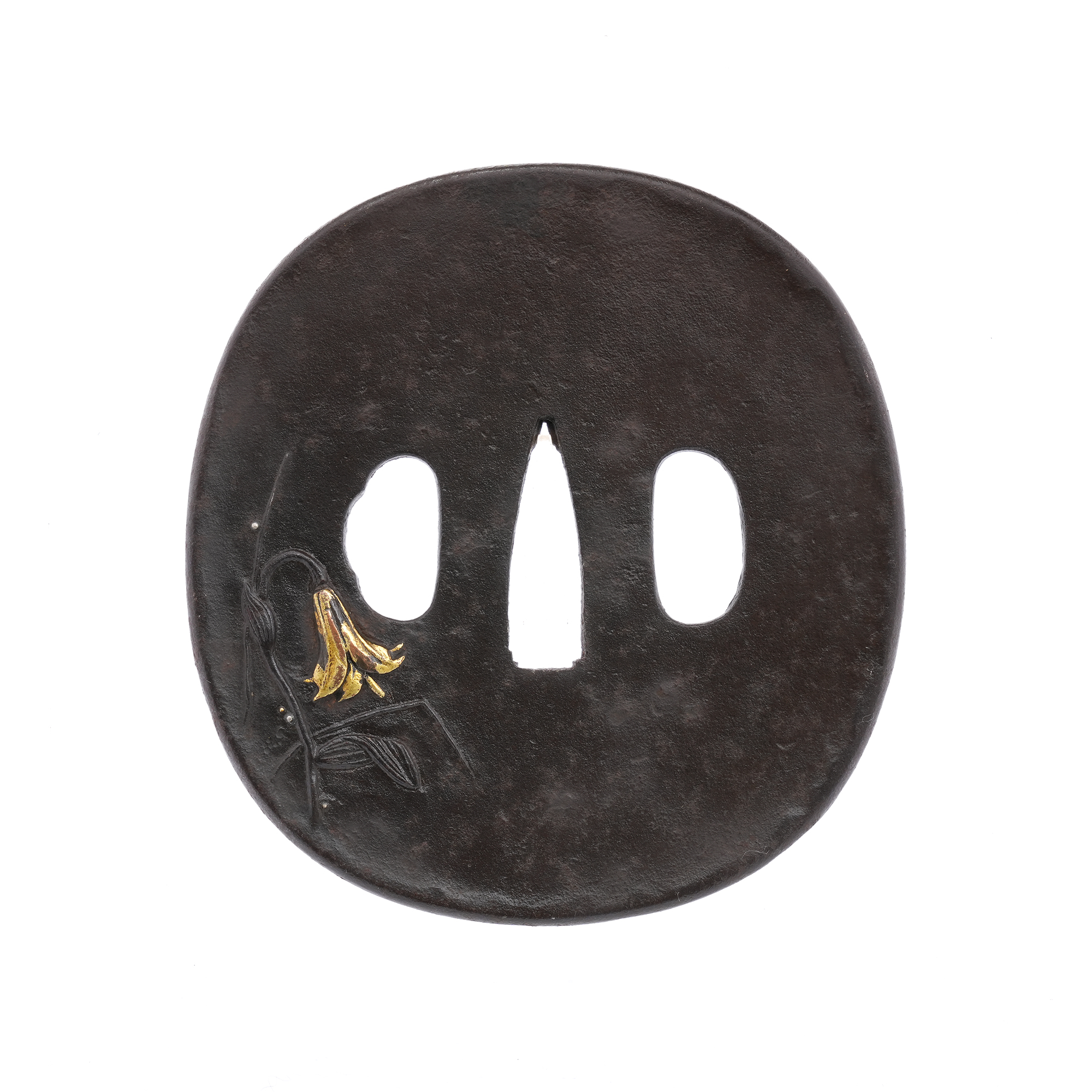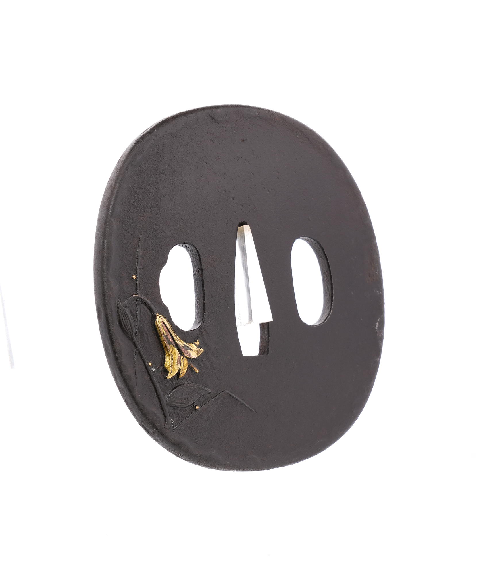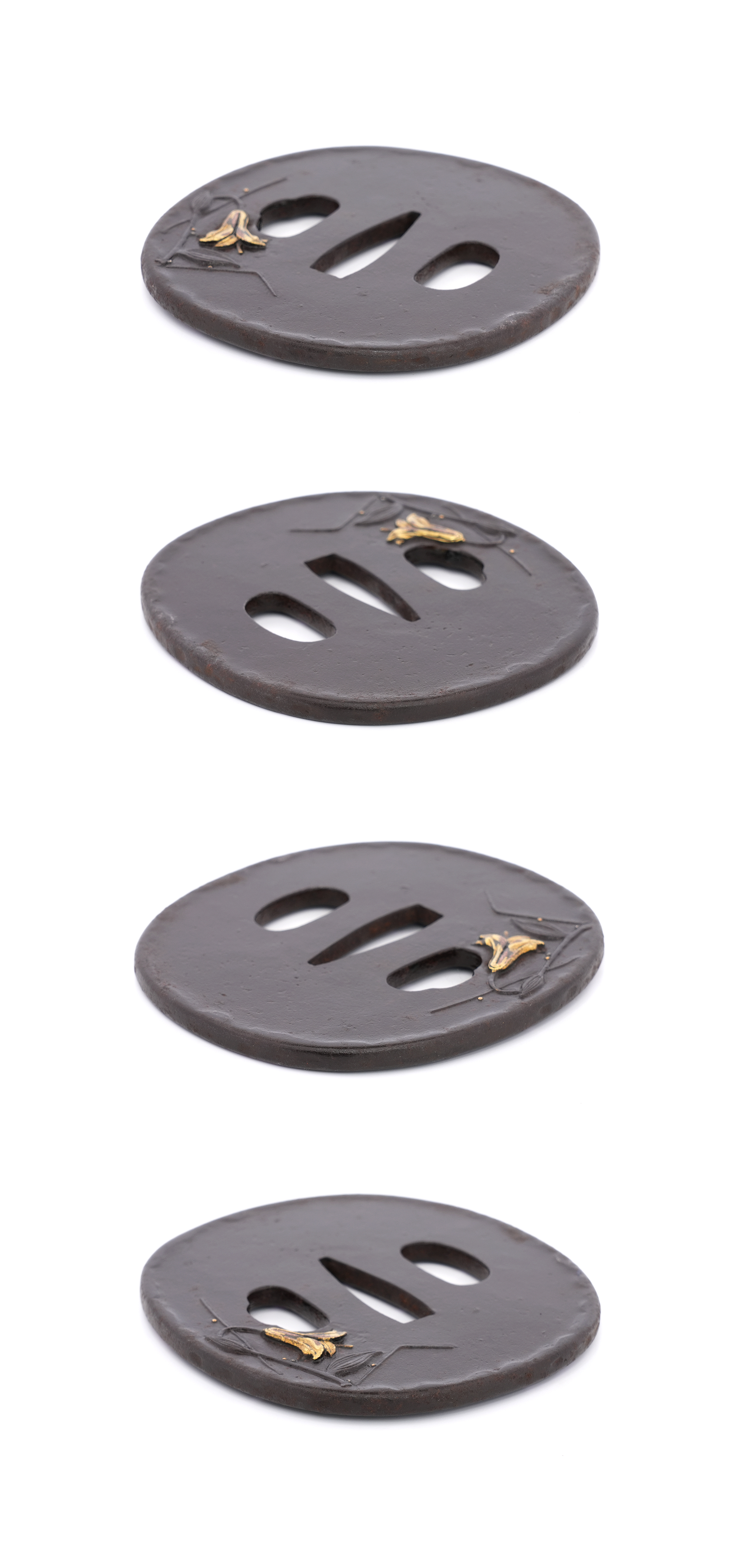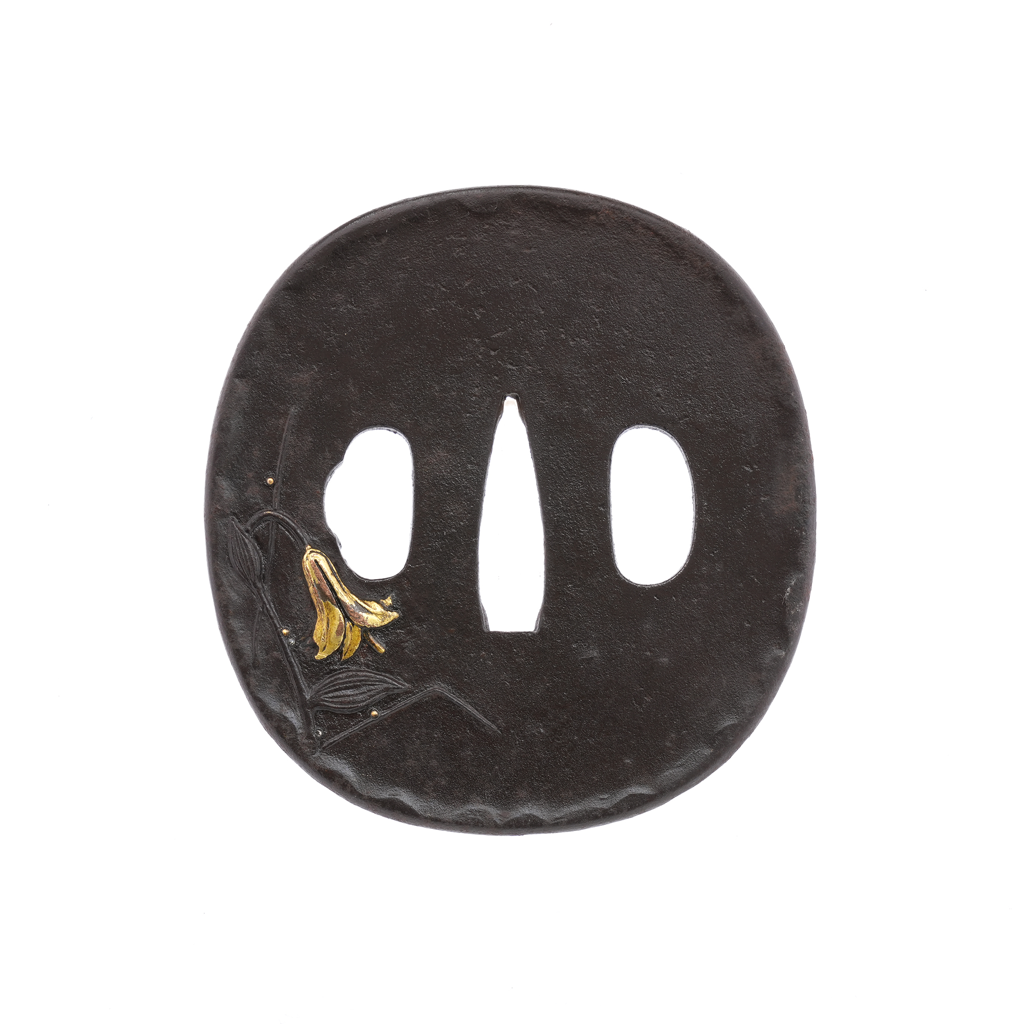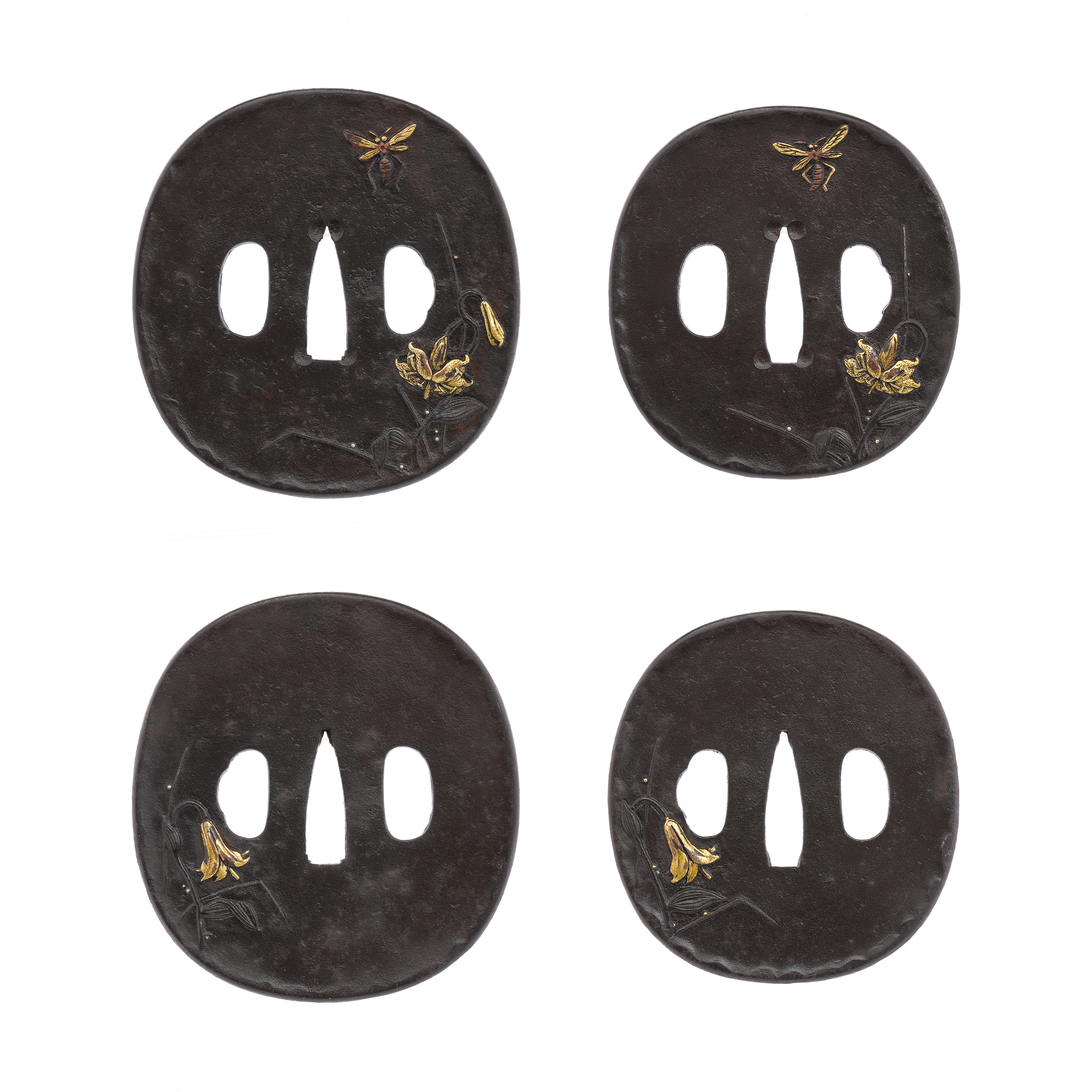 本品は鉄地を用い、可憐に咲く百合の花と、その周囲を飛び交う蜂の姿を生き生きと描いた大小鐔です。静と動の対比が巧みに表現され、画面に心地よい緊張感とリズムを生み出しています。