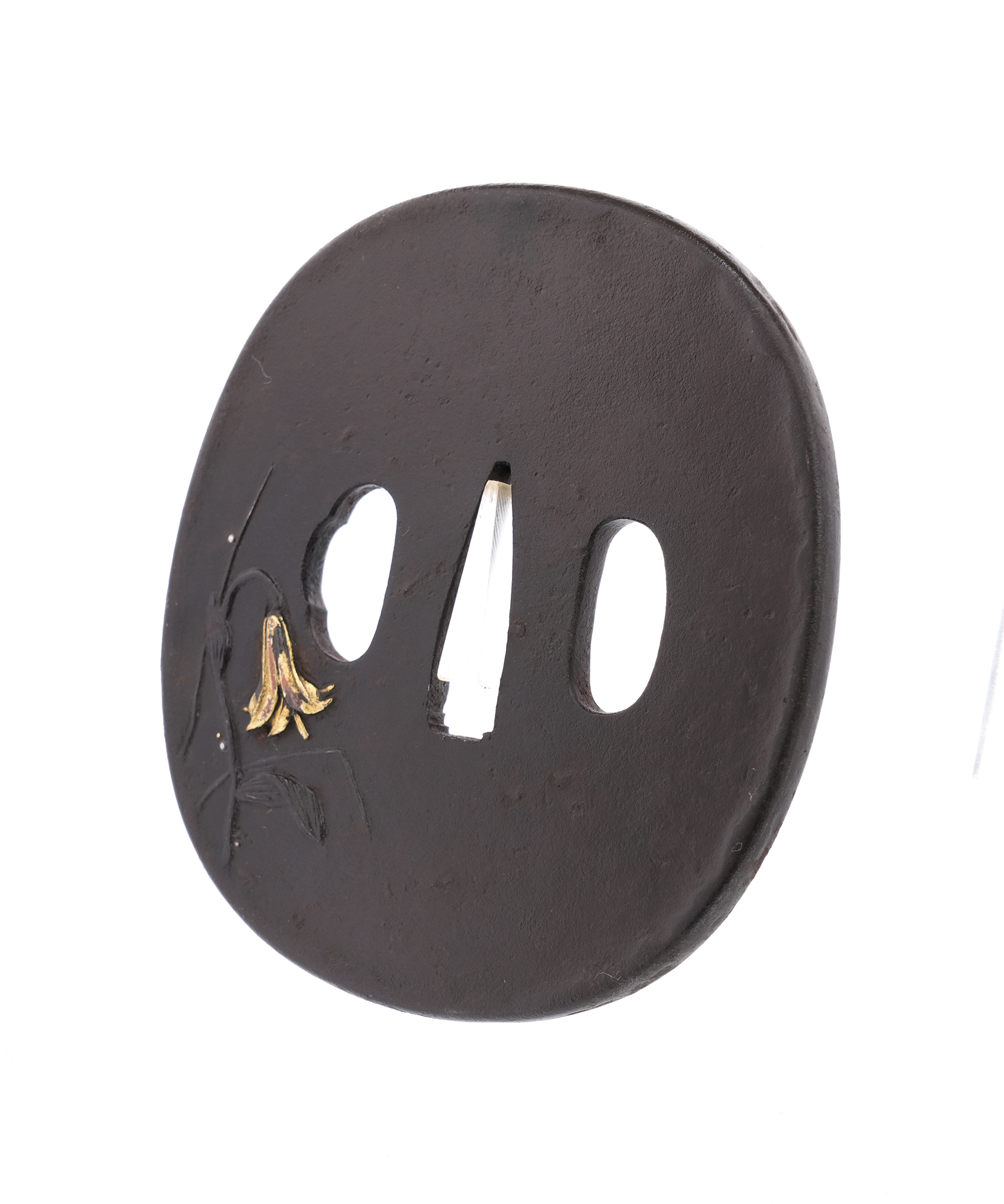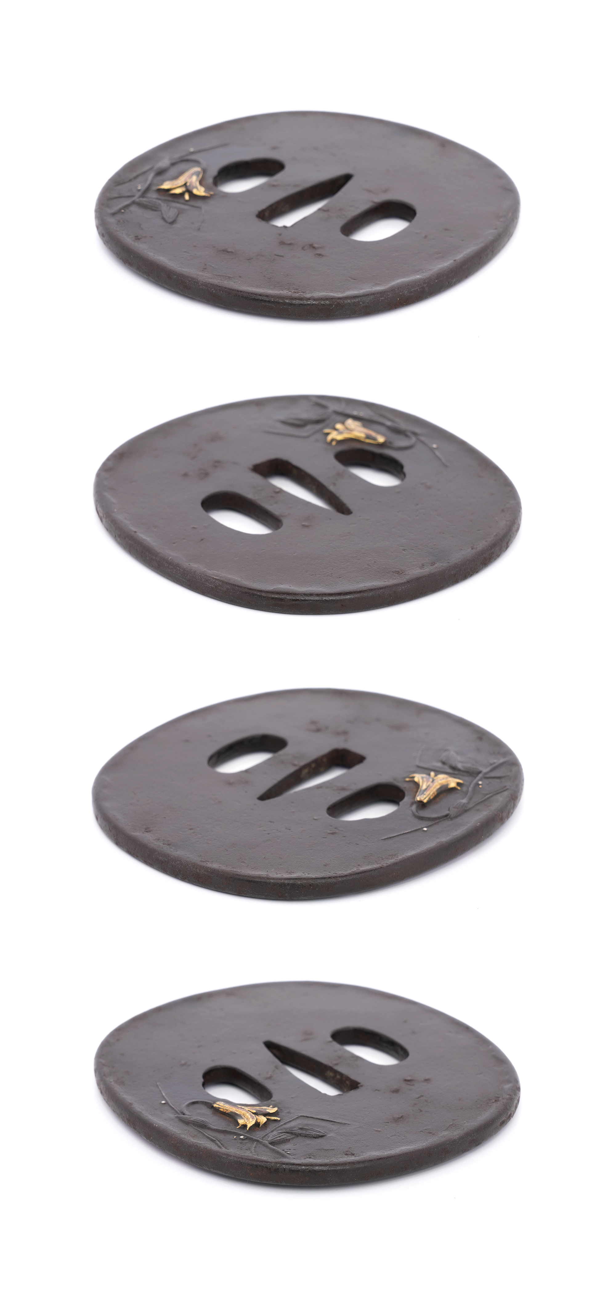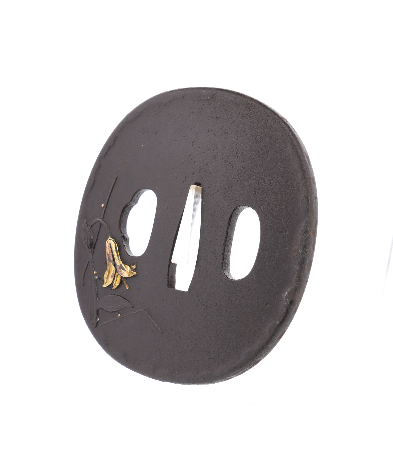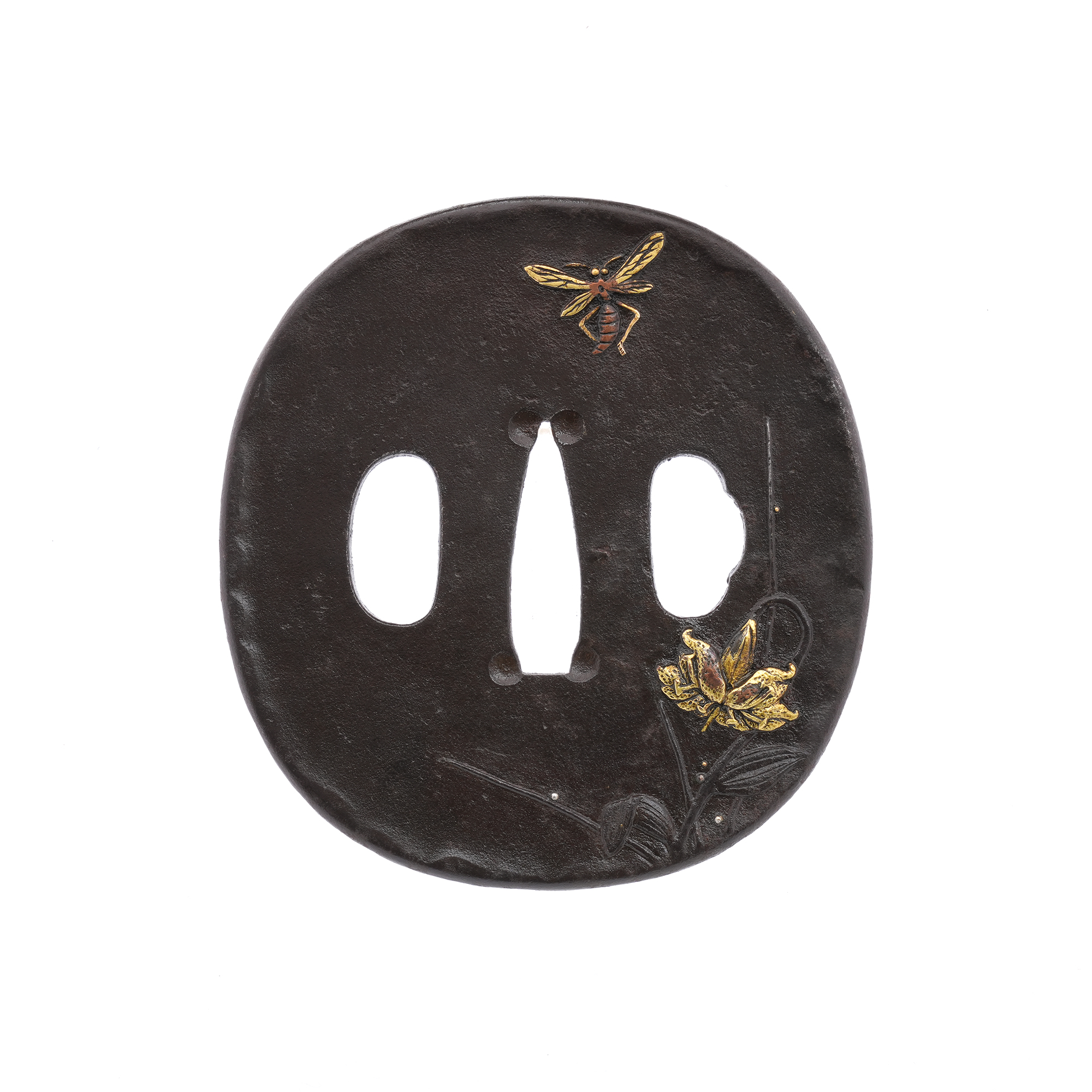 本品は鉄地を用い、可憐に咲く百合の花と、その周囲を飛び交う蜂の姿を生き生きと描いた大小鐔です。静と動の対比が巧みに表現され、画面に心地よい緊張感とリズムを生み出しています。