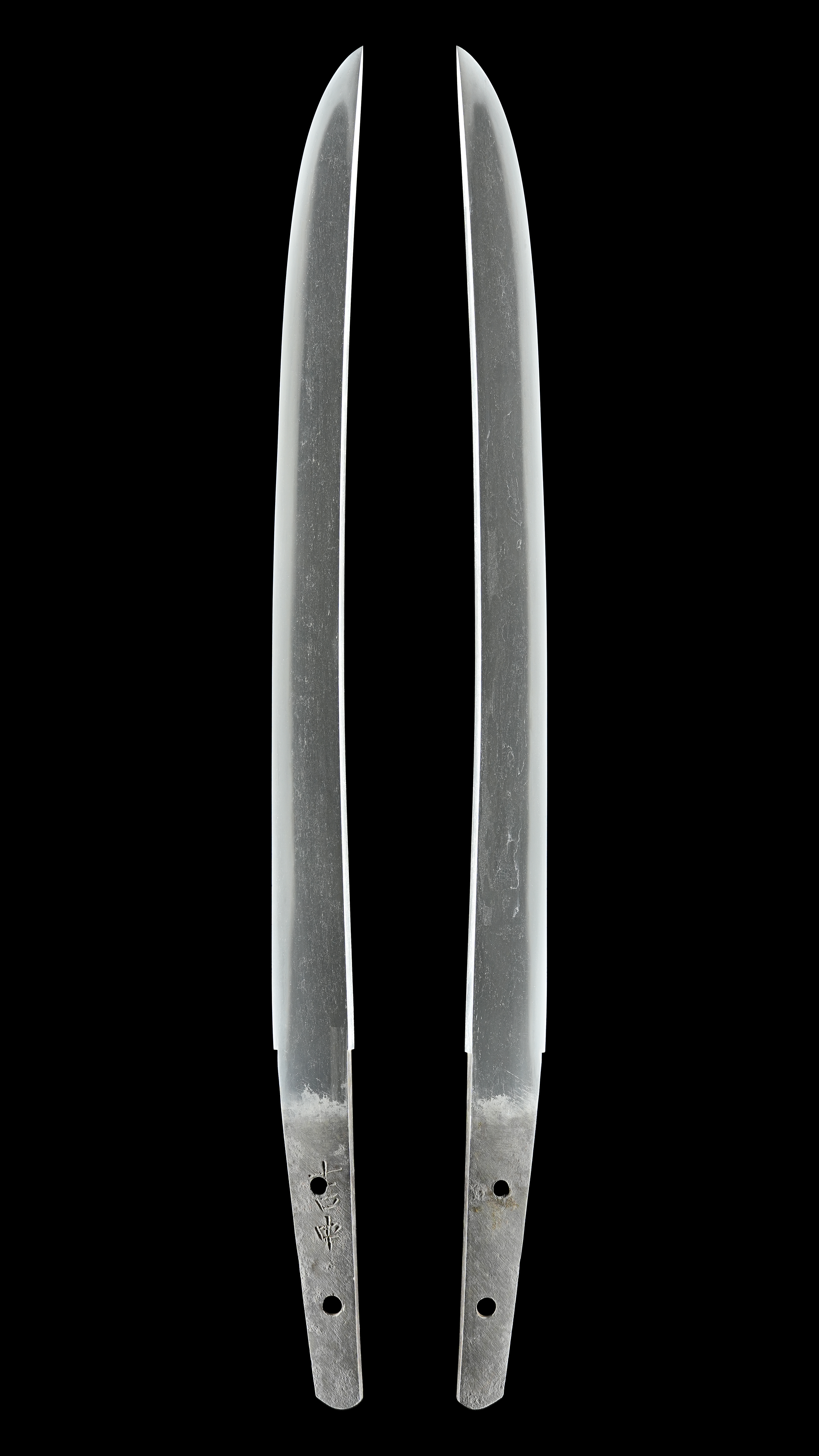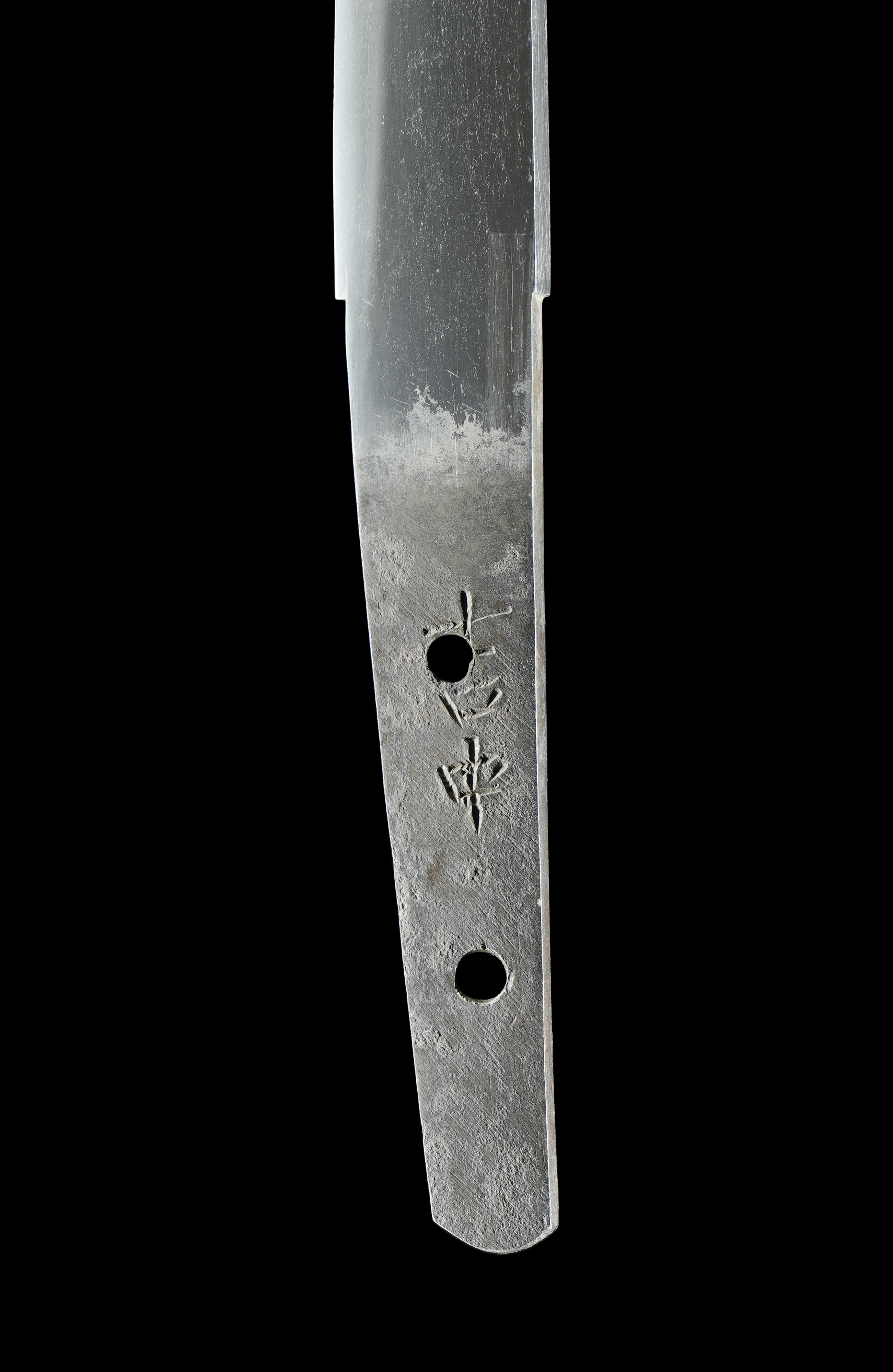 本刀は元先の幅差が大きく開いた平造りで、重ねが厚く、全体に豪壮な造り込みです。地鉄は杢目がチリチリと肌立ち、野趣を帯びた力強い表情を見せています。刃文は匂口沈みごころの直刃を焼き上げ、所々に食い違い風の刃を交え、変化を添えています。鋩子は直ぐに先丸く返る穏やかなまとめ方です。