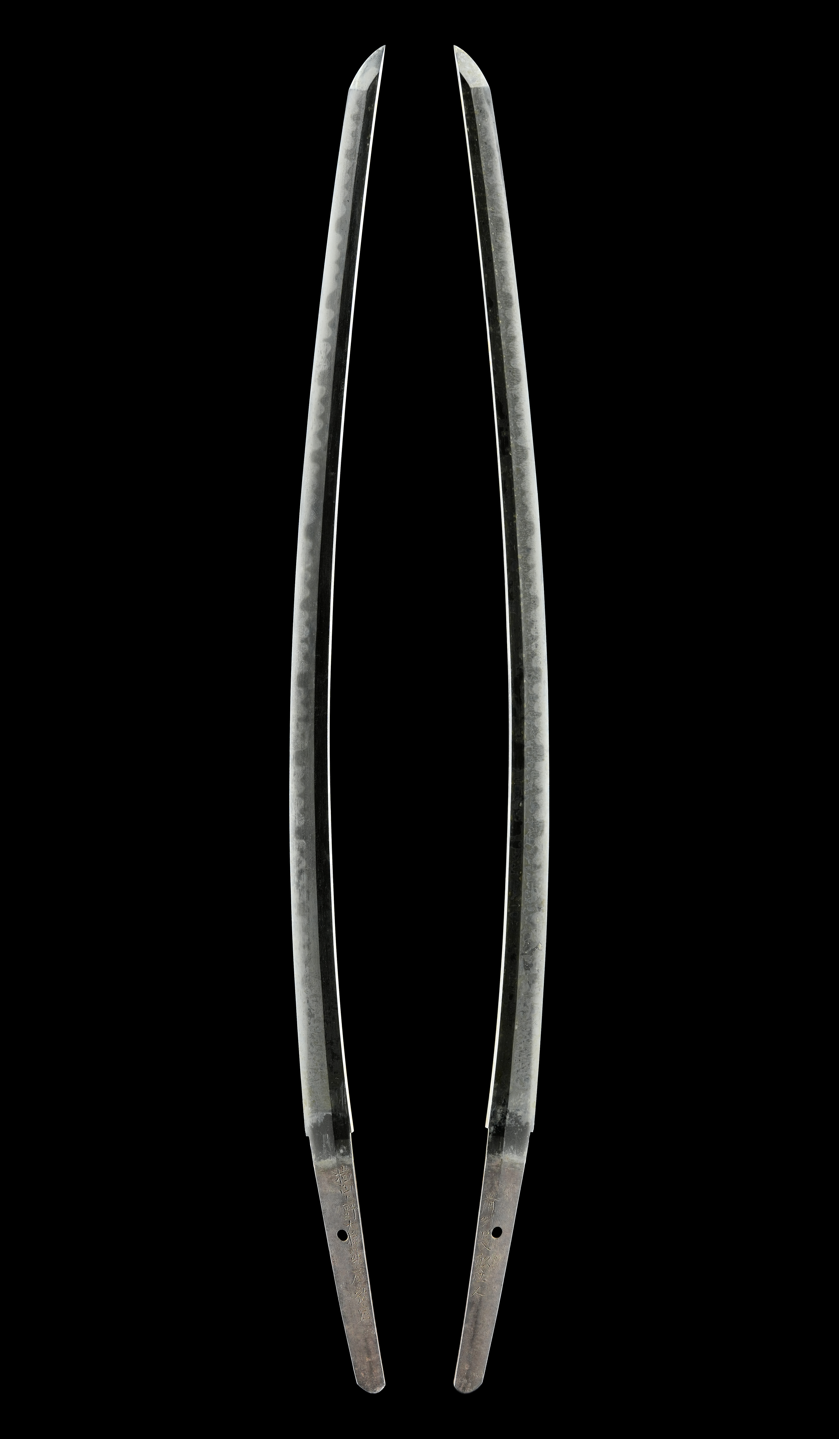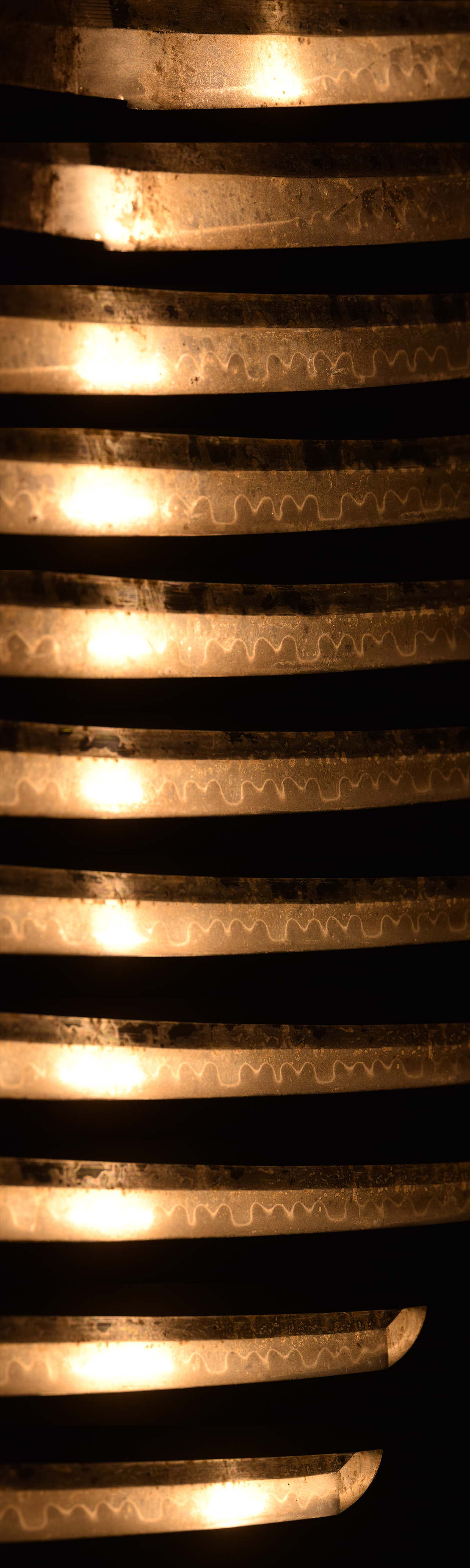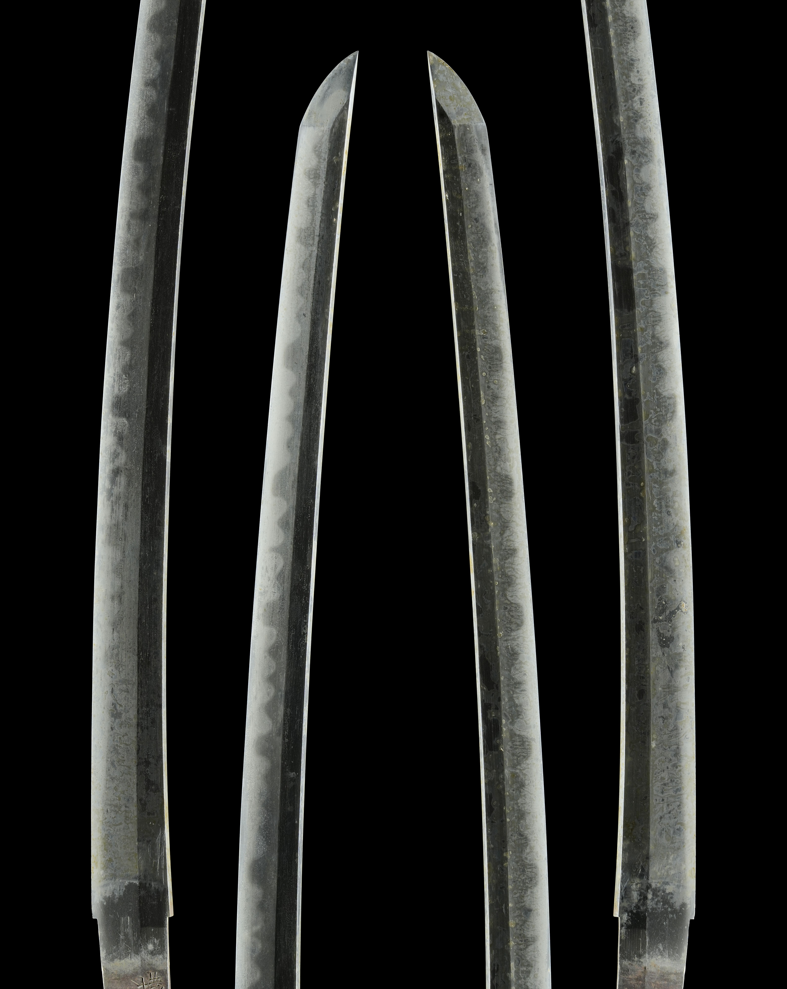 腰元より上から反り始めた古雅な太刀姿で、踏ん張りが強く、優雅な均整の取れた体配です。地鉄は全体に油染みが現れているため判然としにくいものの、杢目肌がよく錬れて詰んでおり、刃文は匂口明るい互ノ目を焼き、左右に開いた互ノ目を二組並べるように規則正しく焼き上げています。匂口はよく締まり、端正で落ち着いた印象を与えます。鋩子は直ぐに先大きく丸く返り、全体の作風とよく調和しています。