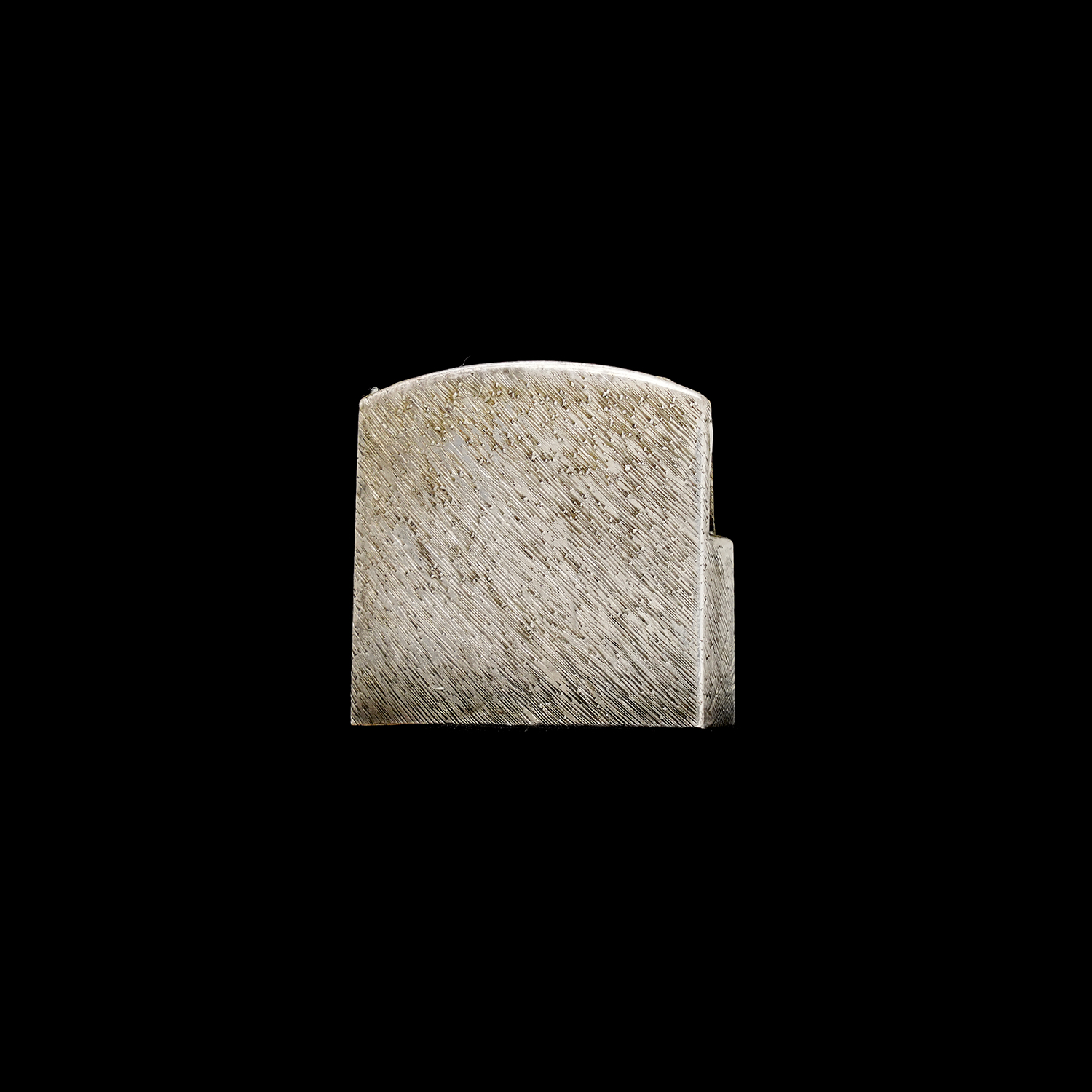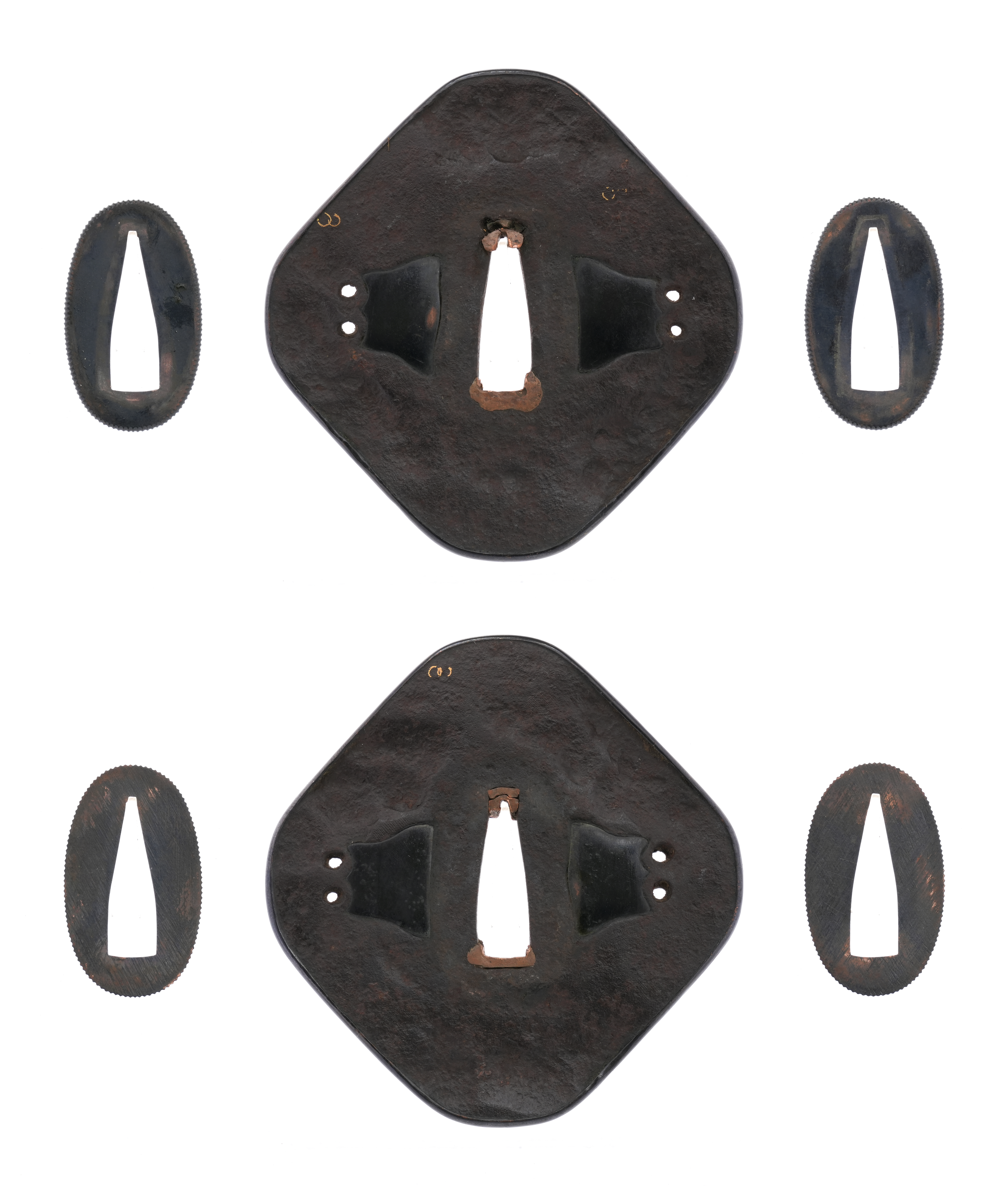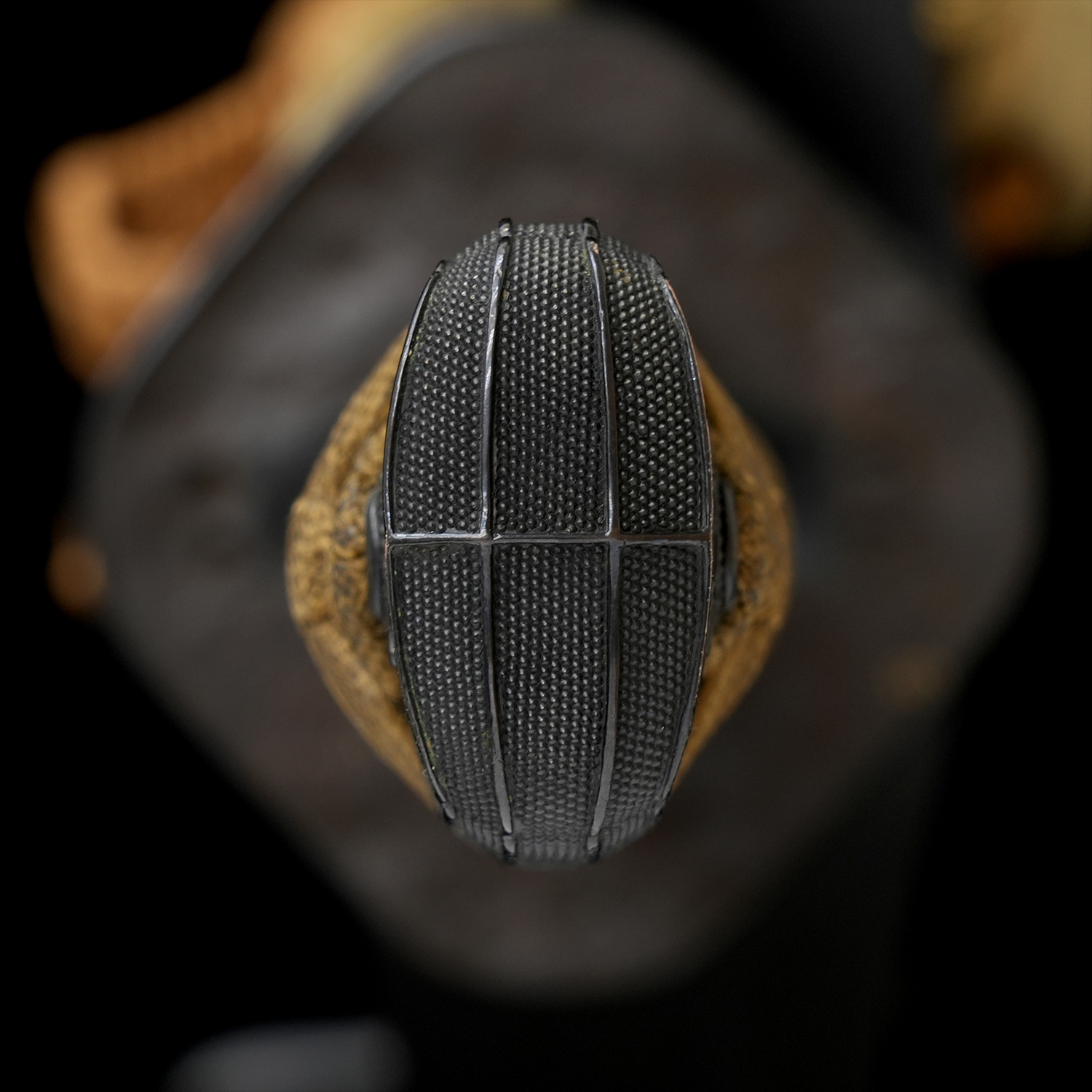 金具類は赤銅地に筋を立て、丁寧に魚子を打った手の込んだ作域で、細部にまで高い工作水準が感じられます。 鐔は凹凸をつけた鉄地で、小柄笄櫃穴の左右には手貫緒の穴が穿たれています。意匠としては、小さな輪違い紋が金象嵌により控えめに配され、主張を抑えた無骨ながらも上品な表現です。耳には赤銅の覆輪がかけられ、全体を引き締めています。