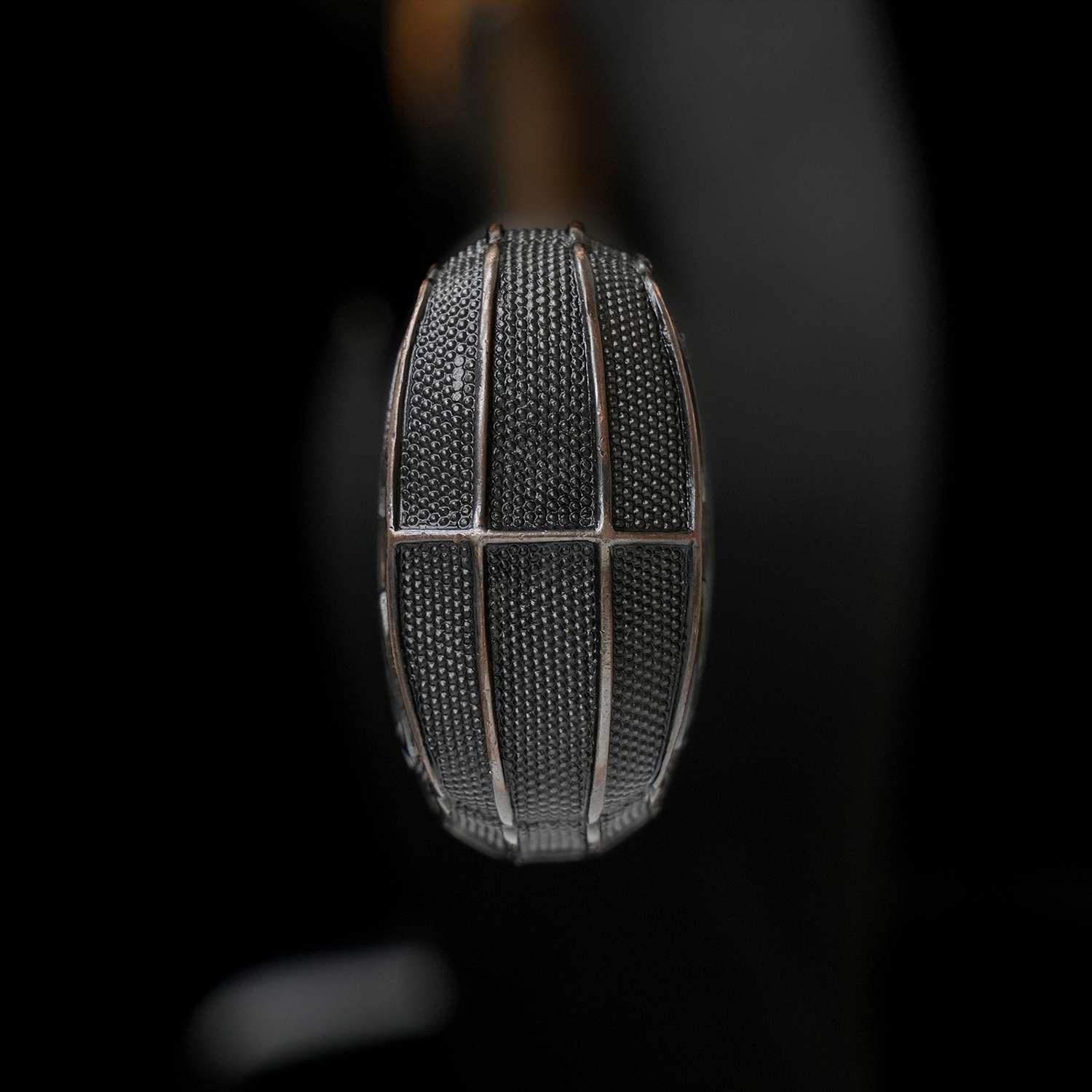 鐔鳴りおよび柄のがたつきは見られるものの、保存状態は非常に良好です。特に注目したいのが、太鼓革に添えられた太鼓金の意匠です。裏面には揚羽蝶を彫り、全体を菊花文様に透かした和風意匠が施されています。一方、表面には唐草文様の中に、アルファベットの M および J と読み取ることのできる西洋風意匠が配されています。