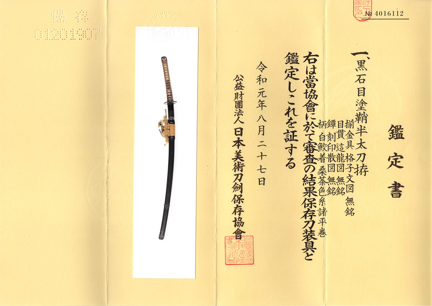附属 保存刀装具鑑定書、素銅地銀着はばき、黒石目塗鞘藩太刀拵