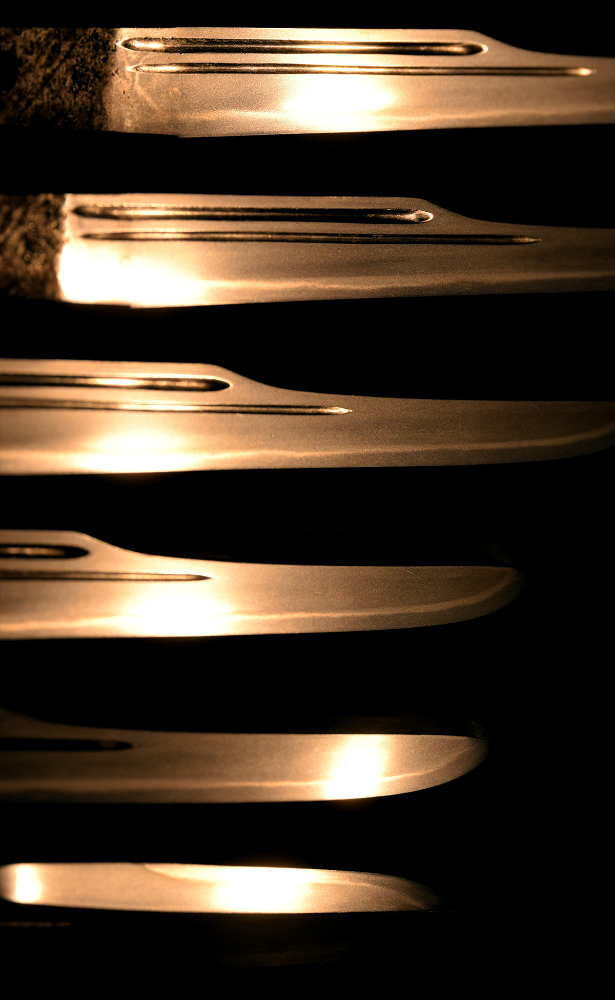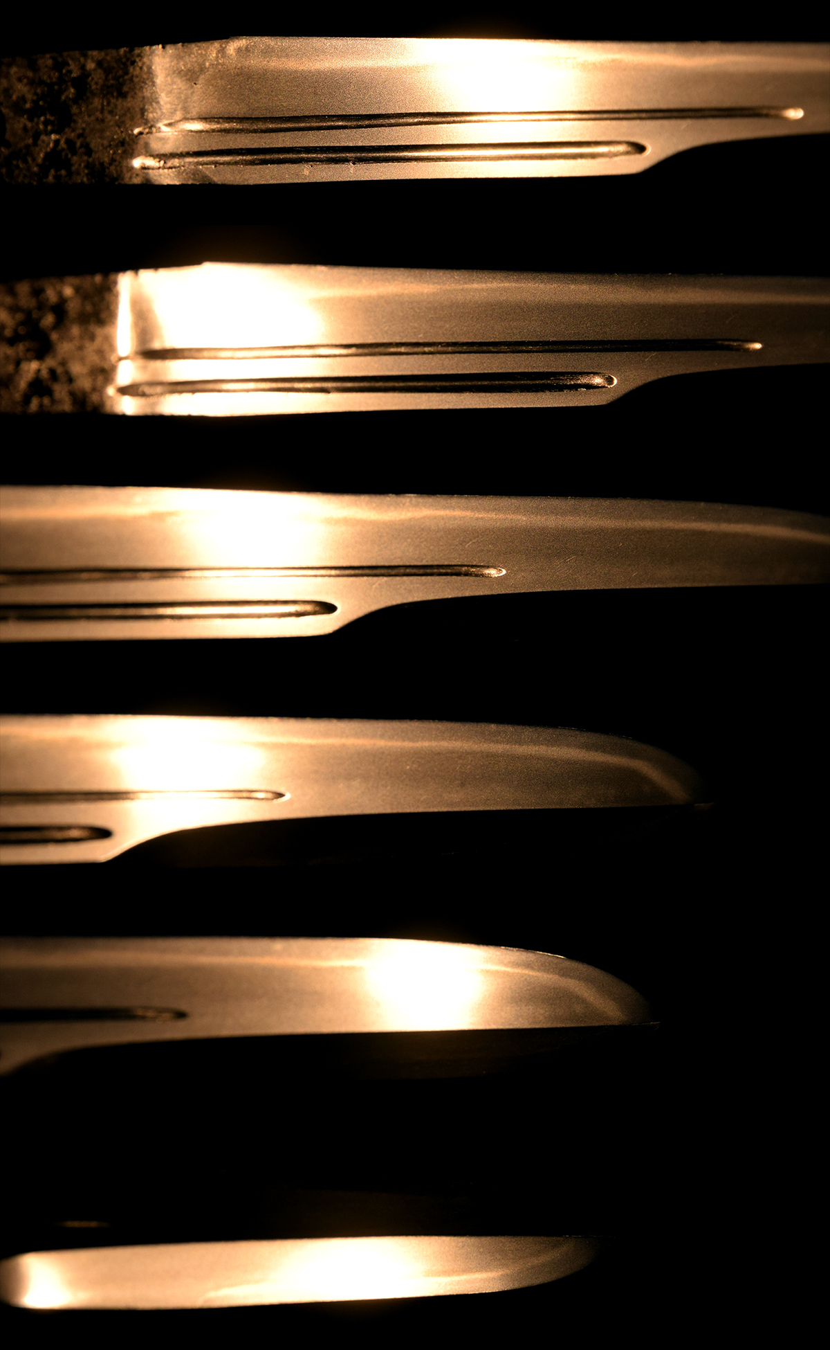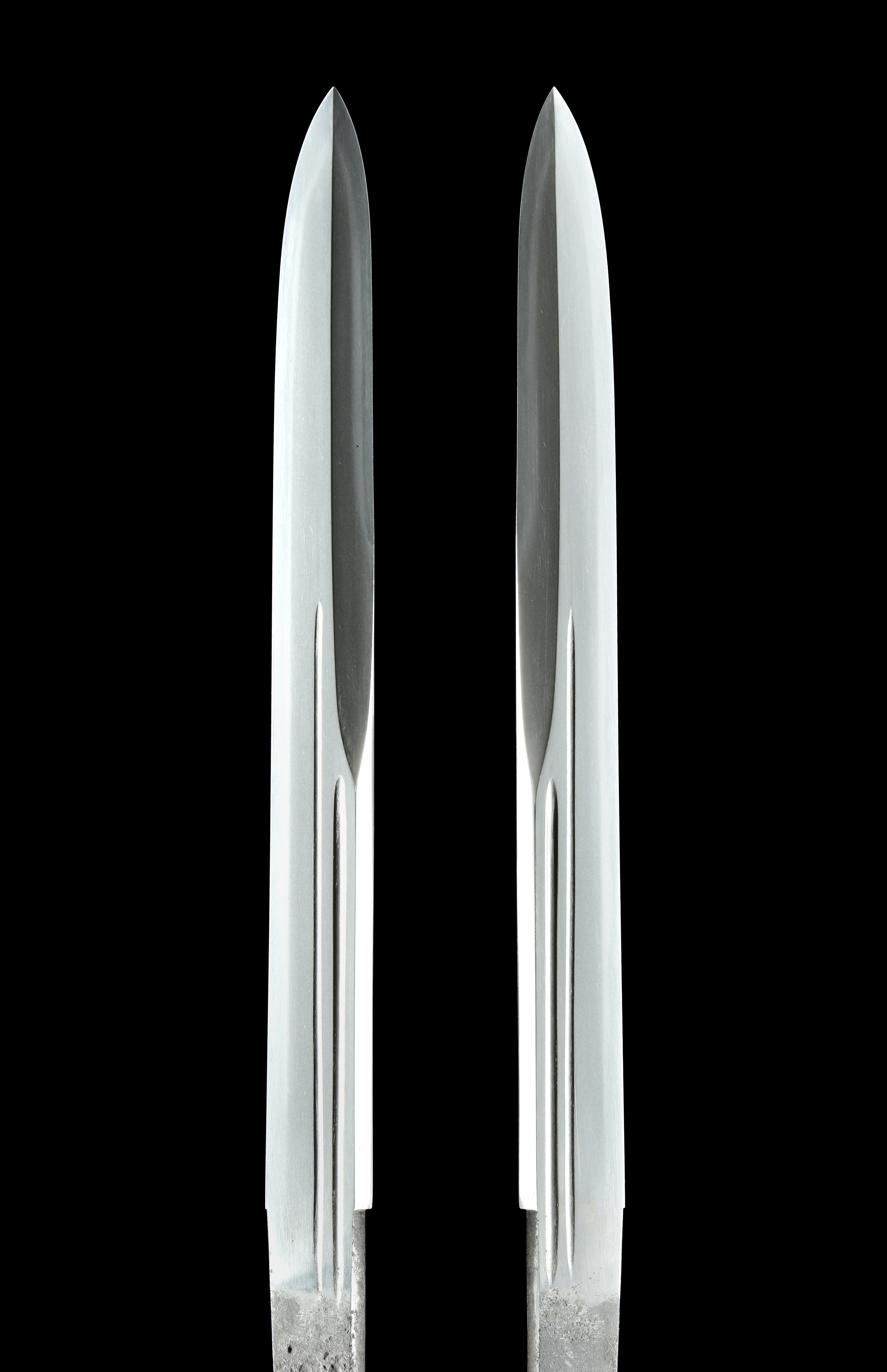 下半には腰樋を掻き、さらに添樋を丈比べのように掻くことで、刀身に流麗なリズムと立体感を演出。光を受けたときの陰影は格別で、静止した鋼に躍動感を与えています。